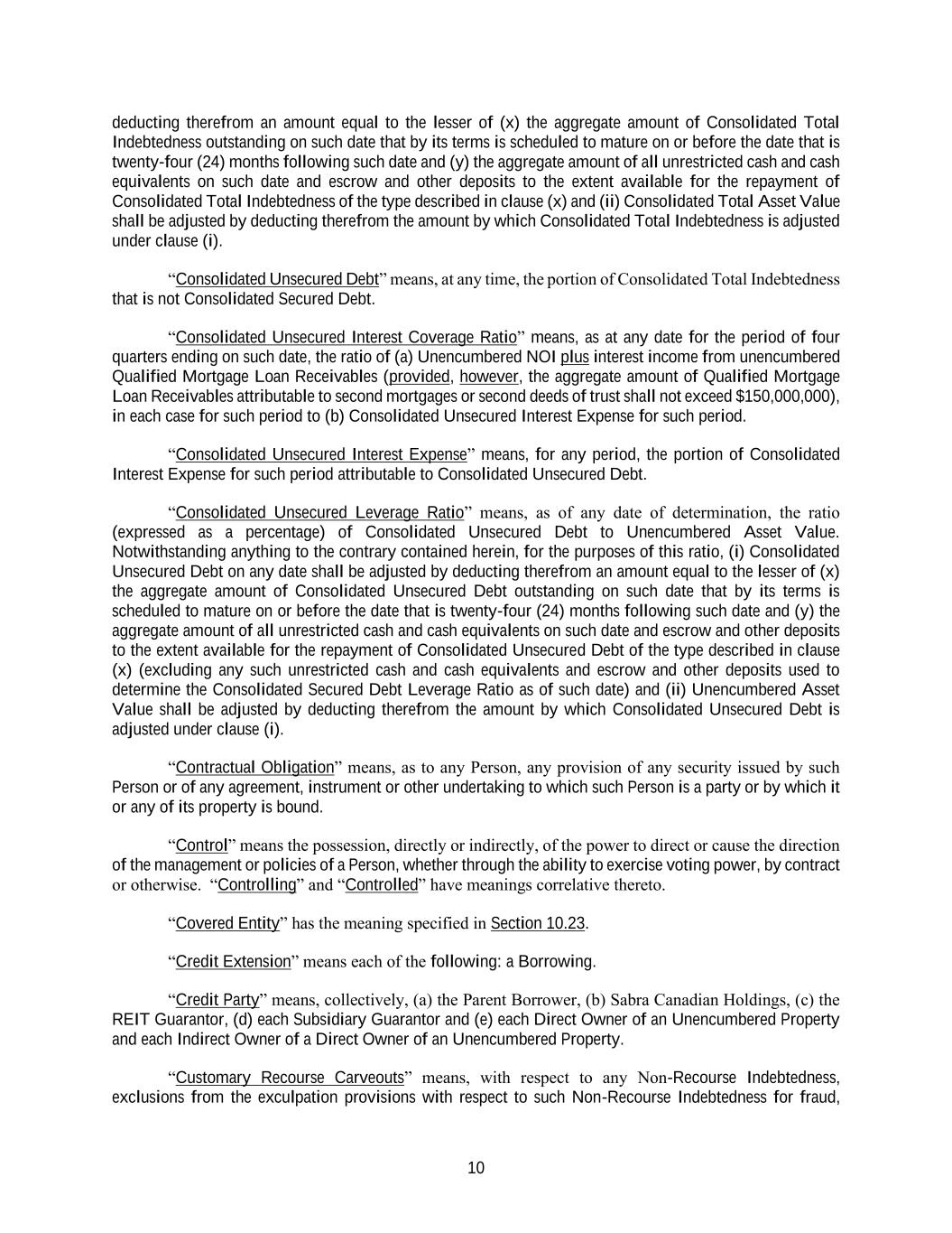 10 deducting therefrom an amount equal to the lesser of (x) the aggregate amount of Consolidated Total Indebtedness outstanding on such date that by its terms is scheduled to mature on or before the date that is twenty-four (24) months following such date and (y) the aggregate amount of all unrestricted cash and cash equivalents on such date and escrow and other deposits to the extent available for the repayment of Consolidated Total Indebtedness of the type described in clause (x) and (ii) Consolidated Total Asset Value shall be adjusted by deducting therefrom the amount by which Consolidated Total Indebtedness is adjusted under clause (i). “Consolidated Unsecured Debt” means, at any time, the portion of Consolidated Total Indebtedness that is not Consolidated Secured Debt. “Consolidated Unsecured Interest Coverage Ratio” means, as at any date for the period of four quarters ending on such date, the ratio of (a) Unencumbered NOI plus interest income from unencumbered Qualified Mortgage Loan Receivables (provided, however, the aggregate amount of Qualified Mortgage Loan Receivables attributable to second mortgages or second deeds of trust shall not exceed $150,000,000), in each case for such period to (b) Consolidated Unsecured Interest Expense for such period. “Consolidated Unsecured Interest Expense” means, for any period, the portion of Consolidated Interest Expense for such period attributable to Consolidated Unsecured Debt. “Consolidated Unsecured Leverage Ratio” means, as of any date of determination, the ratio (expressed as a percentage) of Consolidated Unsecured Debt to Unencumbered Asset Value. Notwithstanding anything to the contrary contained herein, for the purposes of this ratio, (i) Consolidated Unsecured Debt on any date shall be adjusted by deducting therefrom an amount equal to the lesser of (x) the aggregate amount of Consolidated Unsecured Debt outstanding on such date that by its terms is scheduled to mature on or before the date that is twenty-four (24) months following such date and (y) the aggregate amount of all unrestricted cash and cash equivalents on such date and escrow and other deposits to the extent available for the repayment of Consolidated Unsecured Debt of the type described in clause (x) (excluding any such unrestricted cash and cash equivalents and escrow and other deposits used to determine the Consolidated Secured Debt Leverage Ratio as of such date) and (ii) Unencumbered Asset Value shall be adjusted by deducting therefrom the amount by which Consolidated Unsecured Debt is adjusted under clause (i). “Contractual Obligation” means, as to any Person, any provision of any security issued by such Person or of any agreement, instrument or other undertaking to which such Person is a party or by which it or any of its property is bound. “Control” means the possession, directly or indirectly, of the power to direct or cause the direction of the management or policies of a Person, whether through the ability to exercise voting power, by contract or otherwise. “Controlling” and “Controlled” have meanings correlative thereto. “Covered Entity” has the meaning specified in Section 10.23. “Credit Extension” means each of the following: a Borrowing. “Credit Party” means, collectively, (a) the Parent Borrower, (b) Sabra Canadian Holdings, (c) the REIT Guarantor, (d) each Subsidiary Guarantor and (e) each Direct Owner of an Unencumbered Property and each Indirect Owner of a Direct Owner of an Unencumbered Property. “Customary Recourse Carveouts” means, with respect to any Non-Recourse Indebtedness, exclusions from the exculpation provisions with respect to such Non-Recourse Indebtedness for fraud,