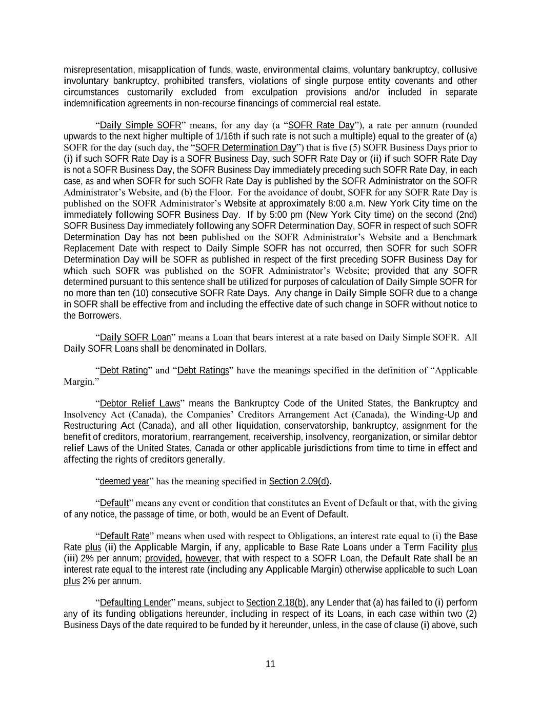 11 misrepresentation, misapplication of funds, waste, environmental claims, voluntary bankruptcy, collusive involuntary bankruptcy, prohibited transfers, violations of single purpose entity covenants and other circumstances customarily excluded from exculpation provisions and/or included in separate indemnification agreements in non-recourse financings of commercial real estate. “Daily Simple SOFR” means, for any day (a “SOFR Rate Day”), a rate per annum (rounded upwards to the next higher multiple of 1/16th if such rate is not such a multiple) equal to the greater of (a) SOFR for the day (such day, the “SOFR Determination Day”) that is five (5) SOFR Business Days prior to (i) if such SOFR Rate Day is a SOFR Business Day, such SOFR Rate Day or (ii) if such SOFR Rate Day is not a SOFR Business Day, the SOFR Business Day immediately preceding such SOFR Rate Day, in each case, as and when SOFR for such SOFR Rate Day is published by the SOFR Administrator on the SOFR Administrator’s Website, and (b) the Floor. For the avoidance of doubt, SOFR for any SOFR Rate Day is published on the SOFR Administrator’s Website at approximately 8:00 a.m. New York City time on the immediately following SOFR Business Day. If by 5:00 pm (New York City time) on the second (2nd) SOFR Business Day immediately following any SOFR Determination Day, SOFR in respect of such SOFR Determination Day has not been published on the SOFR Administrator’s Website and a Benchmark Replacement Date with respect to Daily Simple SOFR has not occurred, then SOFR for such SOFR Determination Day will be SOFR as published in respect of the first preceding SOFR Business Day for which such SOFR was published on the SOFR Administrator’s Website; provided that any SOFR determined pursuant to this sentence shall be utilized for purposes of calculation of Daily Simple SOFR for no more than ten (10) consecutive SOFR Rate Days. Any change in Daily Simple SOFR due to a change in SOFR shall be effective from and including the effective date of such change in SOFR without notice to the Borrowers. “Daily SOFR Loan” means a Loan that bears interest at a rate based on Daily Simple SOFR. All Daily SOFR Loans shall be denominated in Dollars. “Debt Rating” and “Debt Ratings” have the meanings specified in the definition of “Applicable Margin.” “Debtor Relief Laws” means the Bankruptcy Code of the United States, the Bankruptcy and Insolvency Act (Canada), the Companies’ Creditors Arrangement Act (Canada), the Winding-Up and Restructuring Act (Canada), and all other liquidation, conservatorship, bankruptcy, assignment for the benefit of creditors, moratorium, rearrangement, receivership, insolvency, reorganization, or similar debtor relief Laws of the United States, Canada or other applicable jurisdictions from time to time in effect and affecting the rights of creditors generally. “deemed year” has the meaning specified in Section 2.09(d). “Default” means any event or condition that constitutes an Event of Default or that, with the giving of any notice, the passage of time, or both, would be an Event of Default. “Default Rate” means when used with respect to Obligations, an interest rate equal to (i) the Base Rate plus (ii) the Applicable Margin, if any, applicable to Base Rate Loans under a Term Facility plus (iii) 2% per annum; provided, however, that with respect to a SOFR Loan, the Default Rate shall be an interest rate equal to the interest rate (including any Applicable Margin) otherwise applicable to such Loan plus 2% per annum. “Defaulting Lender” means, subject to Section 2.18(b), any Lender that (a) has failed to (i) perform any of its funding obligations hereunder, including in respect of its Loans, in each case within two (2) Business Days of the date required to be funded by it hereunder, unless, in the case of clause (i) above, such