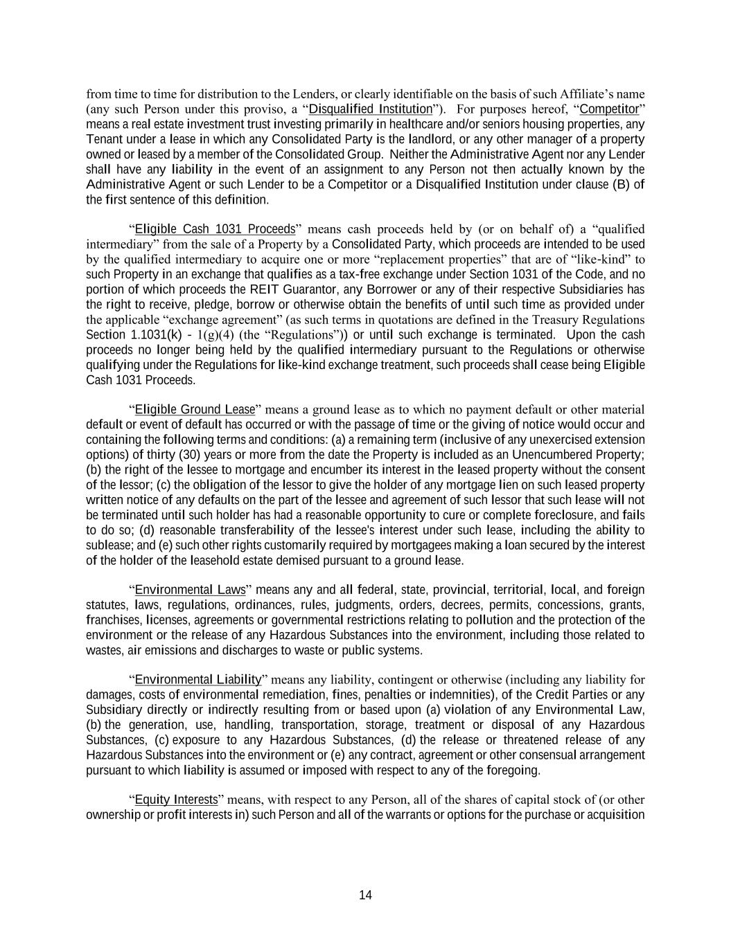 14 from time to time for distribution to the Lenders, or clearly identifiable on the basis of such Affiliate’s name (any such Person under this proviso, a “Disqualified Institution”). For purposes hereof, “Competitor” means a real estate investment trust investing primarily in healthcare and/or seniors housing properties, any Tenant under a lease in which any Consolidated Party is the landlord, or any other manager of a property owned or leased by a member of the Consolidated Group. Neither the Administrative Agent nor any Lender shall have any liability in the event of an assignment to any Person not then actually known by the Administrative Agent or such Lender to be a Competitor or a Disqualified Institution under clause (B) of the first sentence of this definition. “Eligible Cash 1031 Proceeds” means cash proceeds held by (or on behalf of) a “qualified intermediary” from the sale of a Property by a Consolidated Party, which proceeds are intended to be used by the qualified intermediary to acquire one or more “replacement properties” that are of “like-kind” to such Property in an exchange that qualifies as a tax-free exchange under Section 1031 of the Code, and no portion of which proceeds the REIT Guarantor, any Borrower or any of their respective Subsidiaries has the right to receive, pledge, borrow or otherwise obtain the benefits of until such time as provided under the applicable “exchange agreement” (as such terms in quotations are defined in the Treasury Regulations Section 1.1031(k) - 1(g)(4) (the “Regulations”)) or until such exchange is terminated. Upon the cash proceeds no longer being held by the qualified intermediary pursuant to the Regulations or otherwise qualifying under the Regulations for like-kind exchange treatment, such proceeds shall cease being Eligible Cash 1031 Proceeds. “Eligible Ground Lease” means a ground lease as to which no payment default or other material default or event of default has occurred or with the passage of time or the giving of notice would occur and containing the following terms and conditions: (a) a remaining term (inclusive of any unexercised extension options) of thirty (30) years or more from the date the Property is included as an Unencumbered Property; (b) the right of the lessee to mortgage and encumber its interest in the leased property without the consent of the lessor; (c) the obligation of the lessor to give the holder of any mortgage lien on such leased property written notice of any defaults on the part of the lessee and agreement of such lessor that such lease will not be terminated until such holder has had a reasonable opportunity to cure or complete foreclosure, and fails to do so; (d) reasonable transferability of the lessee's interest under such lease, including the ability to sublease; and (e) such other rights customarily required by mortgagees making a loan secured by the interest of the holder of the leasehold estate demised pursuant to a ground lease. “Environmental Laws” means any and all federal, state, provincial, territorial, local, and foreign statutes, laws, regulations, ordinances, rules, judgments, orders, decrees, permits, concessions, grants, franchises, licenses, agreements or governmental restrictions relating to pollution and the protection of the environment or the release of any Hazardous Substances into the environment, including those related to wastes, air emissions and discharges to waste or public systems. “Environmental Liability” means any liability, contingent or otherwise (including any liability for damages, costs of environmental remediation, fines, penalties or indemnities), of the Credit Parties or any Subsidiary directly or indirectly resulting from or based upon (a) violation of any Environmental Law, (b) the generation, use, handling, transportation, storage, treatment or disposal of any Hazardous Substances, (c) exposure to any Hazardous Substances, (d) the release or threatened release of any Hazardous Substances into the environment or (e) any contract, agreement or other consensual arrangement pursuant to which liability is assumed or imposed with respect to any of the foregoing. “Equity Interests” means, with respect to any Person, all of the shares of capital stock of (or other ownership or profit interests in) such Person and all of the warrants or options for the purchase or acquisition
