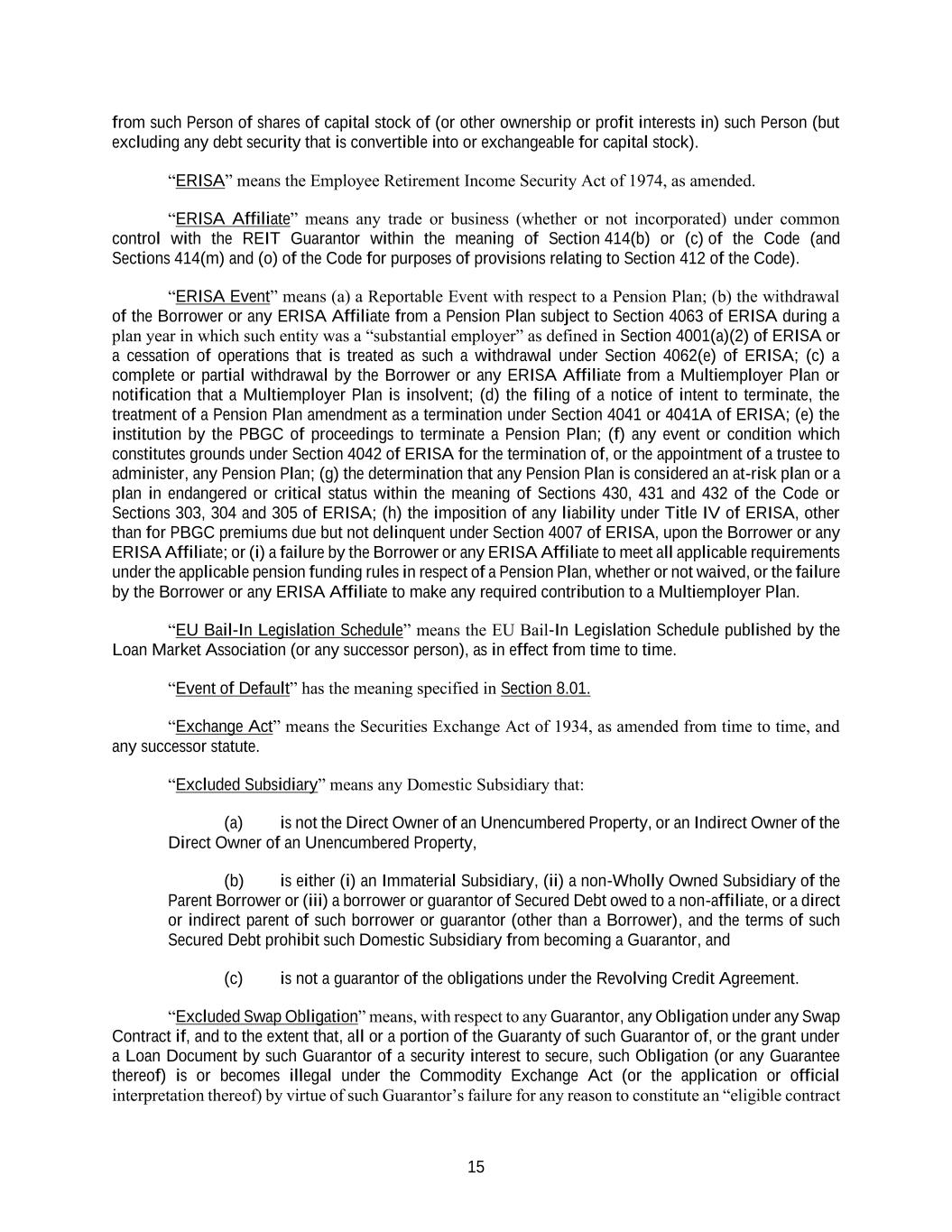 15 from such Person of shares of capital stock of (or other ownership or profit interests in) such Person (but excluding any debt security that is convertible into or exchangeable for capital stock). “ERISA” means the Employee Retirement Income Security Act of 1974, as amended. “ERISA Affiliate” means any trade or business (whether or not incorporated) under common control with the REIT Guarantor within the meaning of Section 414(b) or (c) of the Code (and Sections 414(m) and (o) of the Code for purposes of provisions relating to Section 412 of the Code). “ERISA Event” means (a) a Reportable Event with respect to a Pension Plan; (b) the withdrawal of the Borrower or any ERISA Affiliate from a Pension Plan subject to Section 4063 of ERISA during a plan year in which such entity was a “substantial employer” as defined in Section 4001(a)(2) of ERISA or a cessation of operations that is treated as such a withdrawal under Section 4062(e) of ERISA; (c) a complete or partial withdrawal by the Borrower or any ERISA Affiliate from a Multiemployer Plan or notification that a Multiemployer Plan is insolvent; (d) the filing of a notice of intent to terminate, the treatment of a Pension Plan amendment as a termination under Section 4041 or 4041A of ERISA; (e) the institution by the PBGC of proceedings to terminate a Pension Plan; (f) any event or condition which constitutes grounds under Section 4042 of ERISA for the termination of, or the appointment of a trustee to administer, any Pension Plan; (g) the determination that any Pension Plan is considered an at-risk plan or a plan in endangered or critical status within the meaning of Sections 430, 431 and 432 of the Code or Sections 303, 304 and 305 of ERISA; (h) the imposition of any liability under Title IV of ERISA, other than for PBGC premiums due but not delinquent under Section 4007 of ERISA, upon the Borrower or any ERISA Affiliate; or (i) a failure by the Borrower or any ERISA Affiliate to meet all applicable requirements under the applicable pension funding rules in respect of a Pension Plan, whether or not waived, or the failure by the Borrower or any ERISA Affiliate to make any required contribution to a Multiemployer Plan. “EU Bail-In Legislation Schedule” means the EU Bail-In Legislation Schedule published by the Loan Market Association (or any successor person), as in effect from time to time. “Event of Default” has the meaning specified in Section 8.01. “Exchange Act” means the Securities Exchange Act of 1934, as amended from time to time, and any successor statute. “Excluded Subsidiary” means any Domestic Subsidiary that: (a) is not the Direct Owner of an Unencumbered Property, or an Indirect Owner of the Direct Owner of an Unencumbered Property, (b) is either (i) an Immaterial Subsidiary, (ii) a non-Wholly Owned Subsidiary of the Parent Borrower or (iii) a borrower or guarantor of Secured Debt owed to a non-affiliate, or a direct or indirect parent of such borrower or guarantor (other than a Borrower), and the terms of such Secured Debt prohibit such Domestic Subsidiary from becoming a Guarantor, and (c) is not a guarantor of the obligations under the Revolving Credit Agreement. “Excluded Swap Obligation” means, with respect to any Guarantor, any Obligation under any Swap Contract if, and to the extent that, all or a portion of the Guaranty of such Guarantor of, or the grant under a Loan Document by such Guarantor of a security interest to secure, such Obligation (or any Guarantee thereof) is or becomes illegal under the Commodity Exchange Act (or the application or official interpretation thereof) by virtue of such Guarantor’s failure for any reason to constitute an “eligible contract