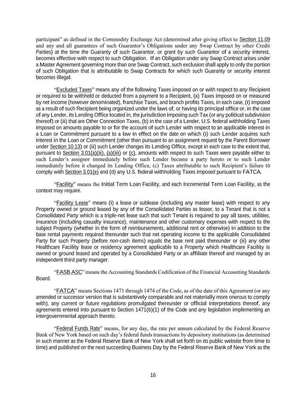 16 participant” as defined in the Commodity Exchange Act (determined after giving effect to Section 11.09 and any and all guarantees of such Guarantor’s Obligations under any Swap Contract by other Credit Parties) at the time the Guaranty of such Guarantor, or grant by such Guarantor of a security interest, becomes effective with respect to such Obligation. If an Obligation under any Swap Contract arises under a Master Agreement governing more than one Swap Contract, such exclusion shall apply to only the portion of such Obligation that is attributable to Swap Contracts for which such Guaranty or security interest becomes illegal. “Excluded Taxes” means any of the following Taxes imposed on or with respect to any Recipient or required to be withheld or deducted from a payment to a Recipient, (a) Taxes imposed on or measured by net income (however denominated), franchise Taxes, and branch profits Taxes, in each case, (i) imposed as a result of such Recipient being organized under the laws of, or having its principal office or, in the case of any Lender, its Lending Office located in, the jurisdiction imposing such Tax (or any political subdivision thereof) or (ii) that are Other Connection Taxes, (b) in the case of a Lender, U.S. federal withholding Taxes imposed on amounts payable to or for the account of such Lender with respect to an applicable interest in a Loan or Commitment pursuant to a law in effect on the date on which (i) such Lender acquires such interest in the Loan or Commitment (other than pursuant to an assignment request by the Parent Borrower under Section 10.13) or (ii) such Lender changes its Lending Office, except in each case to the extent that, pursuant to Section 3.01(a)(ii), (a)(iii) or (c), amounts with respect to such Taxes were payable either to such Lender’s assignor immediately before such Lender became a party hereto or to such Lender immediately before it changed its Lending Office, (c) Taxes attributable to such Recipient’s failure to comply with Section 3.01(e) and (d) any U.S. federal withholding Taxes imposed pursuant to FATCA. “Facility” means the Initial Term Loan Facility, and each Incremental Term Loan Facility, as the context may require. “Facility Lease” means (i) a lease or sublease (including any master lease) with respect to any Property owned or ground leased by any of the Consolidated Parties as lessor, to a Tenant that is not a Consolidated Party which is a triple-net lease such that such Tenant is required to pay all taxes, utilities, insurance (including casualty insurance), maintenance and other customary expenses with respect to the subject Property (whether in the form of reimbursements, additional rent or otherwise) in addition to the base rental payments required thereunder such that net operating income to the applicable Consolidated Party for such Property (before non-cash items) equals the base rent paid thereunder or (ii) any other Healthcare Facility lease or residency agreement applicable to a Property which Healthcare Facility is owned or ground leased and operated by a Consolidated Party or an affiliate thereof and managed by an independent third party manager. “FASB ASC” means the Accounting Standards Codification of the Financial Accounting Standards Board. “FATCA” means Sections 1471 through 1474 of the Code, as of the date of this Agreement (or any amended or successor version that is substantively comparable and not materially more onerous to comply with), any current or future regulations promulgated thereunder or official interpretations thereof, any agreements entered into pursuant to Section 1471(b)(1) of the Code and any legislation implementing an intergovernmental approach thereto. “Federal Funds Rate” means, for any day, the rate per annum calculated by the Federal Reserve Bank of New York based on such day’s federal funds transactions by depository institutions (as determined in such manner as the Federal Reserve Bank of New York shall set forth on its public website from time to time) and published on the next succeeding Business Day by the Federal Reserve Bank of New York as the
