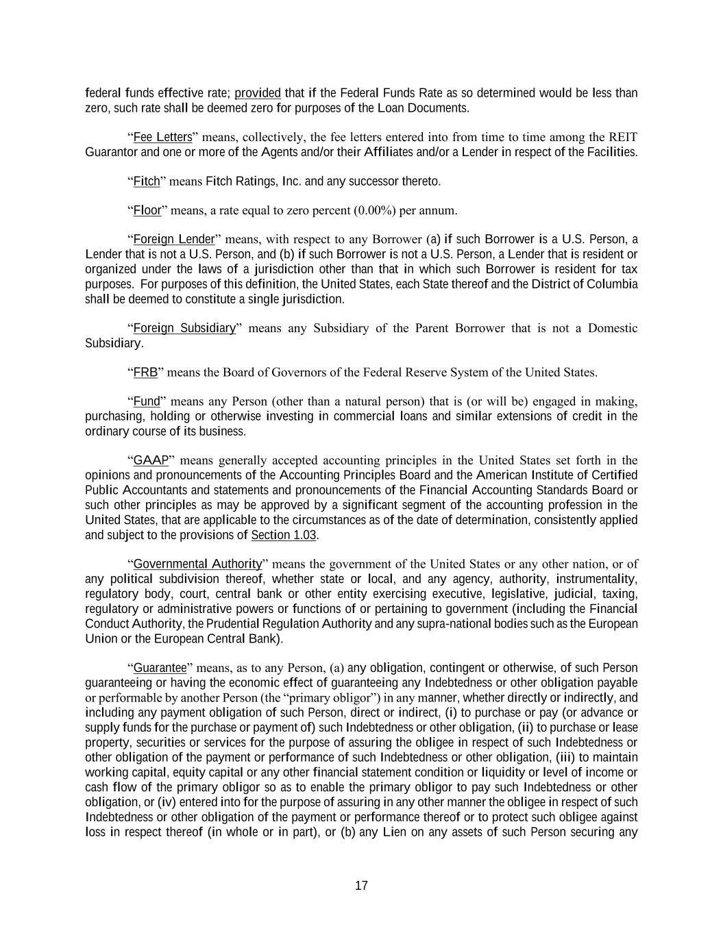 17 federal funds effective rate; provided that if the Federal Funds Rate as so determined would be less than zero, such rate shall be deemed zero for purposes of the Loan Documents. “Fee Letters” means, collectively, the fee letters entered into from time to time among the REIT Guarantor and one or more of the Agents and/or their Affiliates and/or a Lender in respect of the Facilities. “Fitch” means Fitch Ratings, Inc. and any successor thereto. “Floor” means, a rate equal to zero percent (0.00%) per annum. “Foreign Lender” means, with respect to any Borrower (a) if such Borrower is a U.S. Person, a Lender that is not a U.S. Person, and (b) if such Borrower is not a U.S. Person, a Lender that is resident or organized under the laws of a jurisdiction other than that in which such Borrower is resident for tax purposes. For purposes of this definition, the United States, each State thereof and the District of Columbia shall be deemed to constitute a single jurisdiction. “Foreign Subsidiary” means any Subsidiary of the Parent Borrower that is not a Domestic Subsidiary. “FRB” means the Board of Governors of the Federal Reserve System of the United States. “Fund” means any Person (other than a natural person) that is (or will be) engaged in making, purchasing, holding or otherwise investing in commercial loans and similar extensions of credit in the ordinary course of its business. “GAAP” means generally accepted accounting principles in the United States set forth in the opinions and pronouncements of the Accounting Principles Board and the American Institute of Certified Public Accountants and statements and pronouncements of the Financial Accounting Standards Board or such other principles as may be approved by a significant segment of the accounting profession in the United States, that are applicable to the circumstances as of the date of determination, consistently applied and subject to the provisions of Section 1.03. “Governmental Authority” means the government of the United States or any other nation, or of any political subdivision thereof, whether state or local, and any agency, authority, instrumentality, regulatory body, court, central bank or other entity exercising executive, legislative, judicial, taxing, regulatory or administrative powers or functions of or pertaining to government (including the Financial Conduct Authority, the Prudential Regulation Authority and any supra-national bodies such as the European Union or the European Central Bank). “Guarantee” means, as to any Person, (a) any obligation, contingent or otherwise, of such Person guaranteeing or having the economic effect of guaranteeing any Indebtedness or other obligation payable or performable by another Person (the “primary obligor”) in any manner, whether directly or indirectly, and including any payment obligation of such Person, direct or indirect, (i) to purchase or pay (or advance or supply funds for the purchase or payment of) such Indebtedness or other obligation, (ii) to purchase or lease property, securities or services for the purpose of assuring the obligee in respect of such Indebtedness or other obligation of the payment or performance of such Indebtedness or other obligation, (iii) to maintain working capital, equity capital or any other financial statement condition or liquidity or level of income or cash flow of the primary obligor so as to enable the primary obligor to pay such Indebtedness or other obligation, or (iv) entered into for the purpose of assuring in any other manner the obligee in respect of such Indebtedness or other obligation of the payment or performance thereof or to protect such obligee against loss in respect thereof (in whole or in part), or (b) any Lien on any assets of such Person securing any