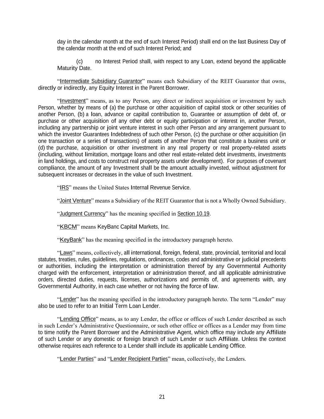 21 day in the calendar month at the end of such Interest Period) shall end on the last Business Day of the calendar month at the end of such Interest Period; and (c) no Interest Period shall, with respect to any Loan, extend beyond the applicable Maturity Date. “Intermediate Subsidiary Guarantor” means each Subsidiary of the REIT Guarantor that owns, directly or indirectly, any Equity Interest in the Parent Borrower. “Investment” means, as to any Person, any direct or indirect acquisition or investment by such Person, whether by means of (a) the purchase or other acquisition of capital stock or other securities of another Person, (b) a loan, advance or capital contribution to, Guarantee or assumption of debt of, or purchase or other acquisition of any other debt or equity participation or interest in, another Person, including any partnership or joint venture interest in such other Person and any arrangement pursuant to which the investor Guarantees Indebtedness of such other Person, (c) the purchase or other acquisition (in one transaction or a series of transactions) of assets of another Person that constitute a business unit or (d) the purchase, acquisition or other investment in any real property or real property-related assets (including, without limitation, mortgage loans and other real estate-related debt investments, investments in land holdings, and costs to construct real property assets under development). For purposes of covenant compliance, the amount of any Investment shall be the amount actually invested, without adjustment for subsequent increases or decreases in the value of such Investment. “IRS” means the United States Internal Revenue Service. “Joint Venture” means a Subsidiary of the REIT Guarantor that is not a Wholly Owned Subsidiary. “Judgment Currency” has the meaning specified in Section 10.19. “KBCM” means KeyBanc Capital Markets, Inc. “KeyBank” has the meaning specified in the introductory paragraph hereto. “Laws” means, collectively, all international, foreign, federal, state, provincial, territorial and local statutes, treaties, rules, guidelines, regulations, ordinances, codes and administrative or judicial precedents or authorities, including the interpretation or administration thereof by any Governmental Authority charged with the enforcement, interpretation or administration thereof, and all applicable administrative orders, directed duties, requests, licenses, authorizations and permits of, and agreements with, any Governmental Authority, in each case whether or not having the force of law. “Lender” has the meaning specified in the introductory paragraph hereto. The term “Lender” may also be used to refer to an Initial Term Loan Lender. “Lending Office” means, as to any Lender, the office or offices of such Lender described as such in such Lender’s Administrative Questionnaire, or such other office or offices as a Lender may from time to time notify the Parent Borrower and the Administrative Agent, which office may include any Affiliate of such Lender or any domestic or foreign branch of such Lender or such Affiliate. Unless the context otherwise requires each reference to a Lender shall include its applicable Lending Office. “Lender Parties” and “Lender Recipient Parties” mean, collectively, the Lenders.