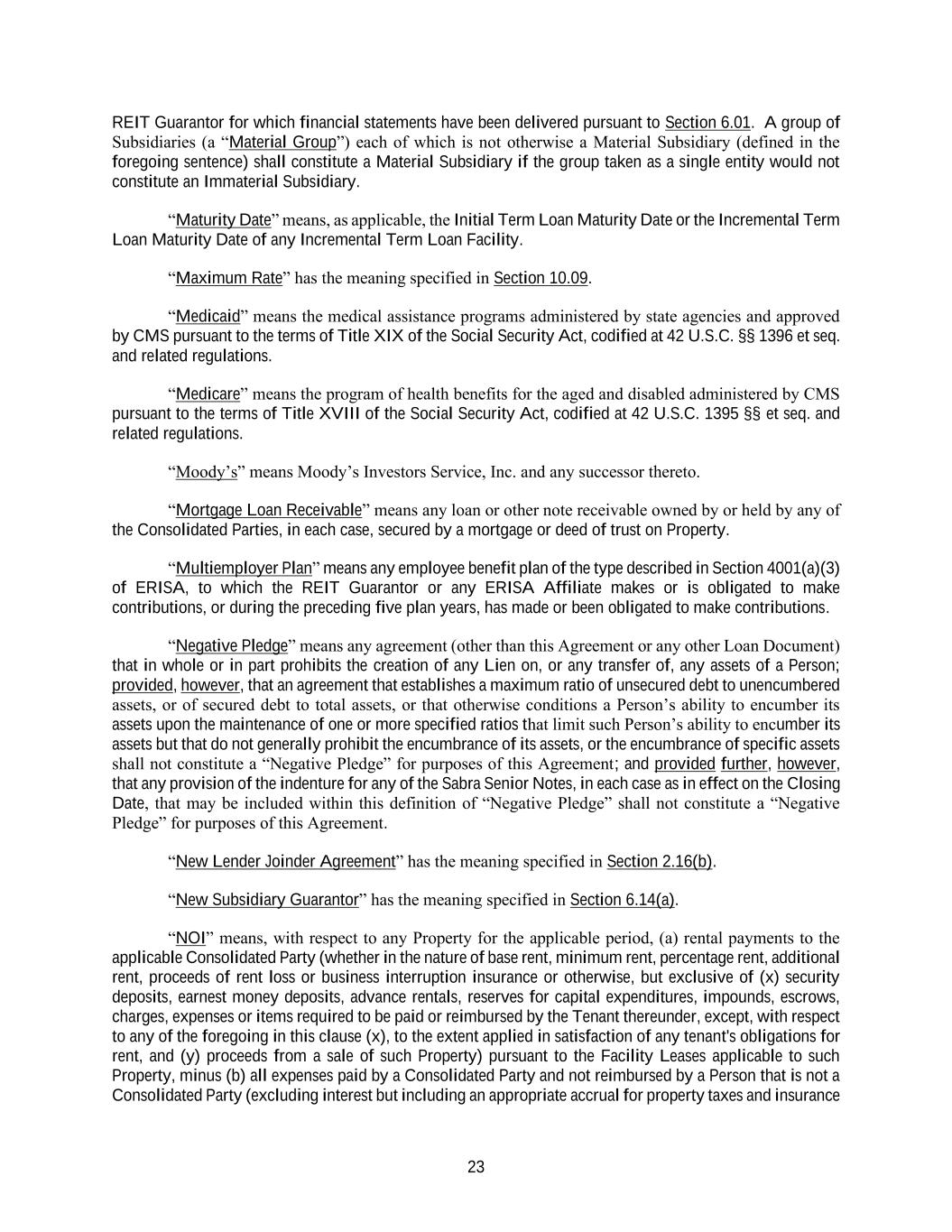23 REIT Guarantor for which financial statements have been delivered pursuant to Section 6.01. A group of Subsidiaries (a “Material Group”) each of which is not otherwise a Material Subsidiary (defined in the foregoing sentence) shall constitute a Material Subsidiary if the group taken as a single entity would not constitute an Immaterial Subsidiary. “Maturity Date” means, as applicable, the Initial Term Loan Maturity Date or the Incremental Term Loan Maturity Date of any Incremental Term Loan Facility. “Maximum Rate” has the meaning specified in Section 10.09. “Medicaid” means the medical assistance programs administered by state agencies and approved by CMS pursuant to the terms of Title XIX of the Social Security Act, codified at 42 U.S.C. §§ 1396 et seq. and related regulations. “Medicare” means the program of health benefits for the aged and disabled administered by CMS pursuant to the terms of Title XVIII of the Social Security Act, codified at 42 U.S.C. 1395 §§ et seq. and related regulations. “Moody’s” means Moody’s Investors Service, Inc. and any successor thereto. “Mortgage Loan Receivable” means any loan or other note receivable owned by or held by any of the Consolidated Parties, in each case, secured by a mortgage or deed of trust on Property. “Multiemployer Plan” means any employee benefit plan of the type described in Section 4001(a)(3) of ERISA, to which the REIT Guarantor or any ERISA Affiliate makes or is obligated to make contributions, or during the preceding five plan years, has made or been obligated to make contributions. “Negative Pledge” means any agreement (other than this Agreement or any other Loan Document) that in whole or in part prohibits the creation of any Lien on, or any transfer of, any assets of a Person; provided, however, that an agreement that establishes a maximum ratio of unsecured debt to unencumbered assets, or of secured debt to total assets, or that otherwise conditions a Person’s ability to encumber its assets upon the maintenance of one or more specified ratios that limit such Person’s ability to encumber its assets but that do not generally prohibit the encumbrance of its assets, or the encumbrance of specific assets shall not constitute a “Negative Pledge” for purposes of this Agreement; and provided further, however, that any provision of the indenture for any of the Sabra Senior Notes, in each case as in effect on the Closing Date, that may be included within this definition of “Negative Pledge” shall not constitute a “Negative Pledge” for purposes of this Agreement. “New Lender Joinder Agreement” has the meaning specified in Section 2.16(b). “New Subsidiary Guarantor” has the meaning specified in Section 6.14(a). “NOI” means, with respect to any Property for the applicable period, (a) rental payments to the applicable Consolidated Party (whether in the nature of base rent, minimum rent, percentage rent, additional rent, proceeds of rent loss or business interruption insurance or otherwise, but exclusive of (x) security deposits, earnest money deposits, advance rentals, reserves for capital expenditures, impounds, escrows, charges, expenses or items required to be paid or reimbursed by the Tenant thereunder, except, with respect to any of the foregoing in this clause (x), to the extent applied in satisfaction of any tenant's obligations for rent, and (y) proceeds from a sale of such Property) pursuant to the Facility Leases applicable to such Property, minus (b) all expenses paid by a Consolidated Party and not reimbursed by a Person that is not a Consolidated Party (excluding interest but including an appropriate accrual for property taxes and insurance