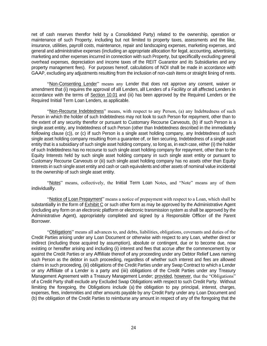 24 net of cash reserves therefor held by a Consolidated Party) related to the ownership, operation or maintenance of such Property, including but not limited to property taxes, assessments and the like, insurance, utilities, payroll costs, maintenance, repair and landscaping expenses, marketing expenses, and general and administrative expenses (including an appropriate allocation for legal, accounting, advertising, marketing and other expenses incurred in connection with such Property, but specifically excluding general overhead expenses, depreciation and income taxes of the REIT Guarantor and its Subsidiaries and any property management fees). For purposes hereof, calculations of NOI shall be made in accordance with GAAP, excluding any adjustments resulting from the inclusion of non-cash items or straight lining of rents. “Non-Consenting Lender” means any Lender that does not approve any consent, waiver or amendment that (i) requires the approval of all Lenders, all Lenders of a Facility or all affected Lenders in accordance with the terms of Section 10.01 and (ii) has been approved by the Required Lenders or the Required Initial Term Loan Lenders, as applicable. “Non-Recourse Indebtedness” means, with respect to any Person, (a) any Indebtedness of such Person in which the holder of such Indebtedness may not look to such Person for repayment, other than to the extent of any security therefor or pursuant to Customary Recourse Carveouts, (b) if such Person is a single asset entity, any Indebtedness of such Person (other than Indebtedness described in the immediately following clause (c)), or (c) if such Person is a single asset holding company, any Indebtedness of such single asset holding company resulting from a guarantee of, or lien securing, Indebtedness of a single asset entity that is a subsidiary of such single asset holding company, so long as, in each case, either (i) the holder of such Indebtedness has no recourse to such single asset holding company for repayment, other than to the Equity Interests held by such single asset holding company in such single asset entity or pursuant to Customary Recourse Carveouts or (ii) such single asset holding company has no assets other than Equity Interests in such single asset entity and cash or cash equivalents and other assets of nominal value incidental to the ownership of such single asset entity. “Notes” means, collectively, the Initial Term Loan Notes, and “Note” means any of them individually. “Notice of Loan Prepayment” means a notice of prepayment with respect to a Loan, which shall be substantially in the form of Exhibit C or such other form as may be approved by the Administrative Agent (including any form on an electronic platform or electronic transmission system as shall be approved by the Administrative Agent), appropriately completed and signed by a Responsible Officer of the Parent Borrower. “Obligations” means all advances to, and debts, liabilities, obligations, covenants and duties of the Credit Parties arising under any Loan Document or otherwise with respect to any Loan, whether direct or indirect (including those acquired by assumption), absolute or contingent, due or to become due, now existing or hereafter arising and including (i) interest and fees that accrue after the commencement by or against the Credit Parties or any Affiliate thereof of any proceeding under any Debtor Relief Laws naming such Person as the debtor in such proceeding, regardless of whether such interest and fees are allowed claims in such proceeding, (ii) obligations of the Credit Parties under any Swap Contract to which a Lender or any Affiliate of a Lender is a party and (iii) obligations of the Credit Parties under any Treasury Management Agreement with a Treasury Management Lender; provided, however, that the “Obligations” of a Credit Party shall exclude any Excluded Swap Obligations with respect to such Credit Party. Without limiting the foregoing, the Obligations include (a) the obligation to pay principal, interest, charges, expenses, fees, indemnities and other amounts payable by any Credit Party under any Loan Document and (b) the obligation of the Credit Parties to reimburse any amount in respect of any of the foregoing that the