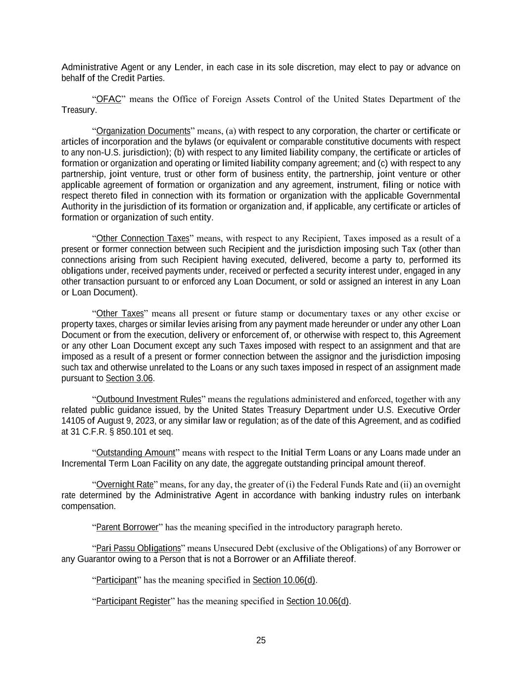 25 Administrative Agent or any Lender, in each case in its sole discretion, may elect to pay or advance on behalf of the Credit Parties. “OFAC” means the Office of Foreign Assets Control of the United States Department of the Treasury. “Organization Documents” means, (a) with respect to any corporation, the charter or certificate or articles of incorporation and the bylaws (or equivalent or comparable constitutive documents with respect to any non-U.S. jurisdiction); (b) with respect to any limited liability company, the certificate or articles of formation or organization and operating or limited liability company agreement; and (c) with respect to any partnership, joint venture, trust or other form of business entity, the partnership, joint venture or other applicable agreement of formation or organization and any agreement, instrument, filing or notice with respect thereto filed in connection with its formation or organization with the applicable Governmental Authority in the jurisdiction of its formation or organization and, if applicable, any certificate or articles of formation or organization of such entity. “Other Connection Taxes” means, with respect to any Recipient, Taxes imposed as a result of a present or former connection between such Recipient and the jurisdiction imposing such Tax (other than connections arising from such Recipient having executed, delivered, become a party to, performed its obligations under, received payments under, received or perfected a security interest under, engaged in any other transaction pursuant to or enforced any Loan Document, or sold or assigned an interest in any Loan or Loan Document). “Other Taxes” means all present or future stamp or documentary taxes or any other excise or property taxes, charges or similar levies arising from any payment made hereunder or under any other Loan Document or from the execution, delivery or enforcement of, or otherwise with respect to, this Agreement or any other Loan Document except any such Taxes imposed with respect to an assignment and that are imposed as a result of a present or former connection between the assignor and the jurisdiction imposing such tax and otherwise unrelated to the Loans or any such taxes imposed in respect of an assignment made pursuant to Section 3.06. “Outbound Investment Rules” means the regulations administered and enforced, together with any related public guidance issued, by the United States Treasury Department under U.S. Executive Order 14105 of August 9, 2023, or any similar law or regulation; as of the date of this Agreement, and as codified at 31 C.F.R. § 850.101 et seq. “Outstanding Amount” means with respect to the Initial Term Loans or any Loans made under an Incremental Term Loan Facility on any date, the aggregate outstanding principal amount thereof. “Overnight Rate” means, for any day, the greater of (i) the Federal Funds Rate and (ii) an overnight rate determined by the Administrative Agent in accordance with banking industry rules on interbank compensation. “Parent Borrower” has the meaning specified in the introductory paragraph hereto. “Pari Passu Obligations” means Unsecured Debt (exclusive of the Obligations) of any Borrower or any Guarantor owing to a Person that is not a Borrower or an Affiliate thereof. “Participant” has the meaning specified in Section 10.06(d). “Participant Register” has the meaning specified in Section 10.06(d).