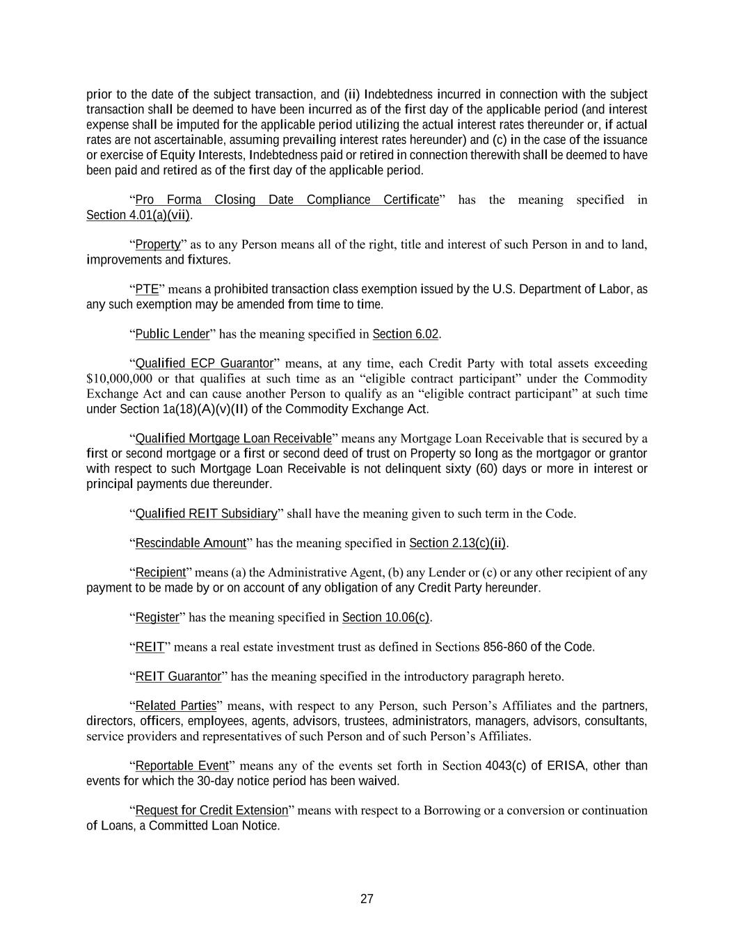 27 prior to the date of the subject transaction, and (ii) Indebtedness incurred in connection with the subject transaction shall be deemed to have been incurred as of the first day of the applicable period (and interest expense shall be imputed for the applicable period utilizing the actual interest rates thereunder or, if actual rates are not ascertainable, assuming prevailing interest rates hereunder) and (c) in the case of the issuance or exercise of Equity Interests, Indebtedness paid or retired in connection therewith shall be deemed to have been paid and retired as of the first day of the applicable period. “Pro Forma Closing Date Compliance Certificate” has the meaning specified in Section 4.01(a)(vii). “Property” as to any Person means all of the right, title and interest of such Person in and to land, improvements and fixtures. “PTE” means a prohibited transaction class exemption issued by the U.S. Department of Labor, as any such exemption may be amended from time to time. “Public Lender” has the meaning specified in Section 6.02. “Qualified ECP Guarantor” means, at any time, each Credit Party with total assets exceeding $10,000,000 or that qualifies at such time as an “eligible contract participant” under the Commodity Exchange Act and can cause another Person to qualify as an “eligible contract participant” at such time under Section 1a(18)(A)(v)(II) of the Commodity Exchange Act. “Qualified Mortgage Loan Receivable” means any Mortgage Loan Receivable that is secured by a first or second mortgage or a first or second deed of trust on Property so long as the mortgagor or grantor with respect to such Mortgage Loan Receivable is not delinquent sixty (60) days or more in interest or principal payments due thereunder. “Qualified REIT Subsidiary” shall have the meaning given to such term in the Code. “Rescindable Amount” has the meaning specified in Section 2.13(c)(ii). “Recipient” means (a) the Administrative Agent, (b) any Lender or (c) or any other recipient of any payment to be made by or on account of any obligation of any Credit Party hereunder. “Register” has the meaning specified in Section 10.06(c). “REIT” means a real estate investment trust as defined in Sections 856-860 of the Code. “REIT Guarantor” has the meaning specified in the introductory paragraph hereto. “Related Parties” means, with respect to any Person, such Person’s Affiliates and the partners, directors, officers, employees, agents, advisors, trustees, administrators, managers, advisors, consultants, service providers and representatives of such Person and of such Person’s Affiliates. “Reportable Event” means any of the events set forth in Section 4043(c) of ERISA, other than events for which the 30-day notice period has been waived. “Request for Credit Extension” means with respect to a Borrowing or a conversion or continuation of Loans, a Committed Loan Notice.