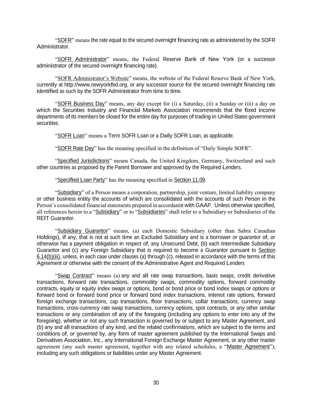 30 “SOFR” means the rate equal to the secured overnight financing rate as administered by the SOFR Administrator. “SOFR Administrator” means, the Federal Reserve Bank of New York (or a successor administrator of the secured overnight financing rate). “SOFR Administrator’s Website” means, the website of the Federal Reserve Bank of New York, currently at http://www.newyorkfed.org, or any successor source for the secured overnight financing rate identified as such by the SOFR Administrator from time to time. “SOFR Business Day” means, any day except for (i) a Saturday, (ii) a Sunday or (iii) a day on which the Securities Industry and Financial Markets Association recommends that the fixed income departments of its members be closed for the entire day for purposes of trading in United States government securities. “SOFR Loan” means a Term SOFR Loan or a Daily SOFR Loan, as applicable. “SOFR Rate Day” has the meaning specified in the definition of “Daily Simple SOFR”. “Specified Jurisdictions” means Canada, the United Kingdom, Germany, Switzerland and such other countries as proposed by the Parent Borrower and approved by the Required Lenders. “Specified Loan Party” has the meaning specified in Section 11.09. “Subsidiary” of a Person means a corporation, partnership, joint venture, limited liability company or other business entity the accounts of which are consolidated with the accounts of such Person in the Person’s consolidated financial statements prepared in accordance with GAAP. Unless otherwise specified, all references herein to a “Subsidiary” or to “Subsidiaries” shall refer to a Subsidiary or Subsidiaries of the REIT Guarantor. “Subsidiary Guarantor” means, (a) each Domestic Subsidiary (other than Sabra Canadian Holdings), if any, that is not at such time an Excluded Subsidiary and is a borrower or guarantor of, or otherwise has a payment obligation in respect of, any Unsecured Debt, (b) each Intermediate Subsidiary Guarantor and (c) any Foreign Subsidiary that is required to become a Guarantor pursuant to Section 6.14(b)(ii), unless, in each case under clauses (a) through (c), released in accordance with the terms of this Agreement or otherwise with the consent of the Administrative Agent and Required Lenders “Swap Contract” means (a) any and all rate swap transactions, basis swaps, credit derivative transactions, forward rate transactions, commodity swaps, commodity options, forward commodity contracts, equity or equity index swaps or options, bond or bond price or bond index swaps or options or forward bond or forward bond price or forward bond index transactions, interest rate options, forward foreign exchange transactions, cap transactions, floor transactions, collar transactions, currency swap transactions, cross-currency rate swap transactions, currency options, spot contracts, or any other similar transactions or any combination of any of the foregoing (including any options to enter into any of the foregoing), whether or not any such transaction is governed by or subject to any Master Agreement, and (b) any and all transactions of any kind, and the related confirmations, which are subject to the terms and conditions of, or governed by, any form of master agreement published by the International Swaps and Derivatives Association, Inc., any International Foreign Exchange Master Agreement, or any other master agreement (any such master agreement, together with any related schedules, a “Master Agreement”), including any such obligations or liabilities under any Master Agreement.