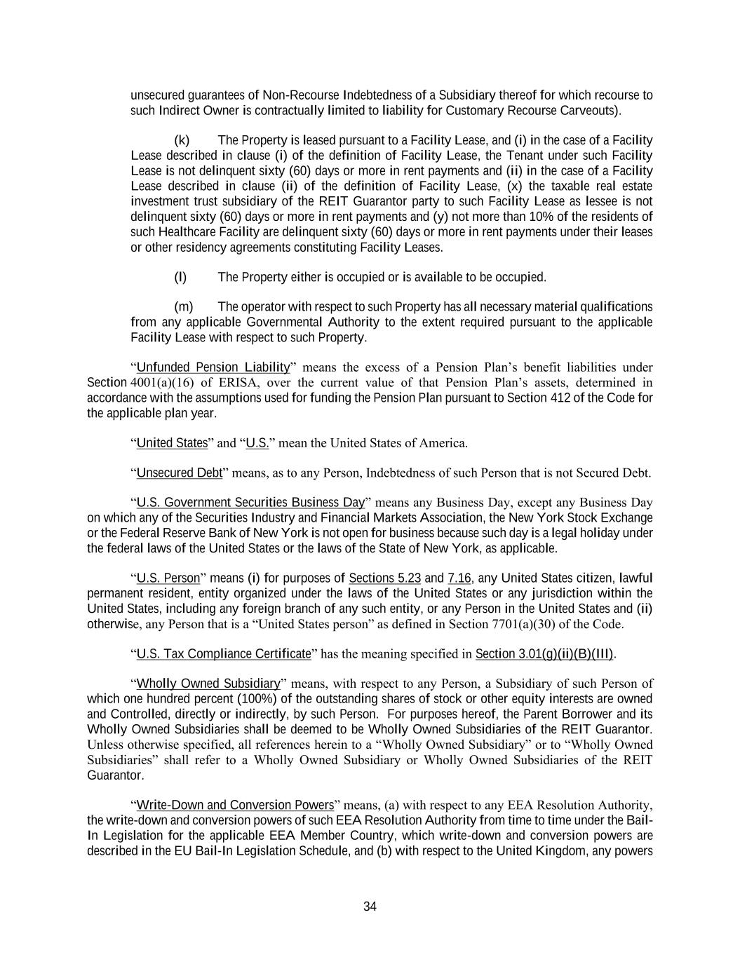 34 unsecured guarantees of Non-Recourse Indebtedness of a Subsidiary thereof for which recourse to such Indirect Owner is contractually limited to liability for Customary Recourse Carveouts). (k) The Property is leased pursuant to a Facility Lease, and (i) in the case of a Facility Lease described in clause (i) of the definition of Facility Lease, the Tenant under such Facility Lease is not delinquent sixty (60) days or more in rent payments and (ii) in the case of a Facility Lease described in clause (ii) of the definition of Facility Lease, (x) the taxable real estate investment trust subsidiary of the REIT Guarantor party to such Facility Lease as lessee is not delinquent sixty (60) days or more in rent payments and (y) not more than 10% of the residents of such Healthcare Facility are delinquent sixty (60) days or more in rent payments under their leases or other residency agreements constituting Facility Leases. (l) The Property either is occupied or is available to be occupied. (m) The operator with respect to such Property has all necessary material qualifications from any applicable Governmental Authority to the extent required pursuant to the applicable Facility Lease with respect to such Property. “Unfunded Pension Liability” means the excess of a Pension Plan’s benefit liabilities under Section 4001(a)(16) of ERISA, over the current value of that Pension Plan’s assets, determined in accordance with the assumptions used for funding the Pension Plan pursuant to Section 412 of the Code for the applicable plan year. “United States” and “U.S.” mean the United States of America. “Unsecured Debt” means, as to any Person, Indebtedness of such Person that is not Secured Debt. “U.S. Government Securities Business Day” means any Business Day, except any Business Day on which any of the Securities Industry and Financial Markets Association, the New York Stock Exchange or the Federal Reserve Bank of New York is not open for business because such day is a legal holiday under the federal laws of the United States or the laws of the State of New York, as applicable. “U.S. Person” means (i) for purposes of Sections 5.23 and 7.16, any United States citizen, lawful permanent resident, entity organized under the laws of the United States or any jurisdiction within the United States, including any foreign branch of any such entity, or any Person in the United States and (ii) otherwise, any Person that is a “United States person” as defined in Section 7701(a)(30) of the Code. “U.S. Tax Compliance Certificate” has the meaning specified in Section 3.01(g)(ii)(B)(III). “Wholly Owned Subsidiary” means, with respect to any Person, a Subsidiary of such Person of which one hundred percent (100%) of the outstanding shares of stock or other equity interests are owned and Controlled, directly or indirectly, by such Person. For purposes hereof, the Parent Borrower and its Wholly Owned Subsidiaries shall be deemed to be Wholly Owned Subsidiaries of the REIT Guarantor. Unless otherwise specified, all references herein to a “Wholly Owned Subsidiary” or to “Wholly Owned Subsidiaries” shall refer to a Wholly Owned Subsidiary or Wholly Owned Subsidiaries of the REIT Guarantor. “Write-Down and Conversion Powers” means, (a) with respect to any EEA Resolution Authority, the write-down and conversion powers of such EEA Resolution Authority from time to time under the Bail- In Legislation for the applicable EEA Member Country, which write-down and conversion powers are described in the EU Bail-In Legislation Schedule, and (b) with respect to the United Kingdom, any powers