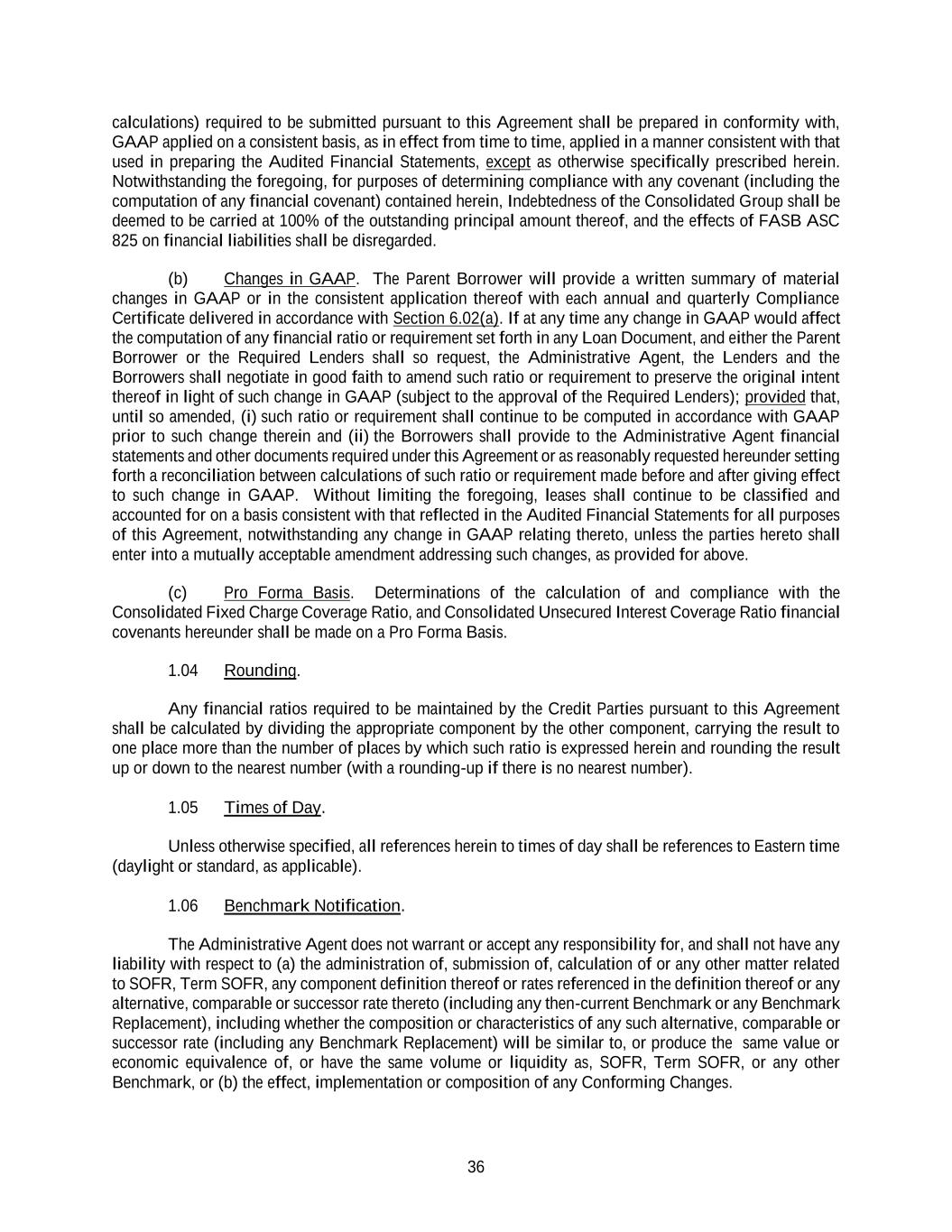 36 calculations) required to be submitted pursuant to this Agreement shall be prepared in conformity with, GAAP applied on a consistent basis, as in effect from time to time, applied in a manner consistent with that used in preparing the Audited Financial Statements, except as otherwise specifically prescribed herein. Notwithstanding the foregoing, for purposes of determining compliance with any covenant (including the computation of any financial covenant) contained herein, Indebtedness of the Consolidated Group shall be deemed to be carried at 100% of the outstanding principal amount thereof, and the effects of FASB ASC 825 on financial liabilities shall be disregarded. (b) Changes in GAAP. The Parent Borrower will provide a written summary of material changes in GAAP or in the consistent application thereof with each annual and quarterly Compliance Certificate delivered in accordance with Section 6.02(a). If at any time any change in GAAP would affect the computation of any financial ratio or requirement set forth in any Loan Document, and either the Parent Borrower or the Required Lenders shall so request, the Administrative Agent, the Lenders and the Borrowers shall negotiate in good faith to amend such ratio or requirement to preserve the original intent thereof in light of such change in GAAP (subject to the approval of the Required Lenders); provided that, until so amended, (i) such ratio or requirement shall continue to be computed in accordance with GAAP prior to such change therein and (ii) the Borrowers shall provide to the Administrative Agent financial statements and other documents required under this Agreement or as reasonably requested hereunder setting forth a reconciliation between calculations of such ratio or requirement made before and after giving effect to such change in GAAP. Without limiting the foregoing, leases shall continue to be classified and accounted for on a basis consistent with that reflected in the Audited Financial Statements for all purposes of this Agreement, notwithstanding any change in GAAP relating thereto, unless the parties hereto shall enter into a mutually acceptable amendment addressing such changes, as provided for above. (c) Pro Forma Basis. Determinations of the calculation of and compliance with the Consolidated Fixed Charge Coverage Ratio, and Consolidated Unsecured Interest Coverage Ratio financial covenants hereunder shall be made on a Pro Forma Basis. 1.04 Rounding. Any financial ratios required to be maintained by the Credit Parties pursuant to this Agreement shall be calculated by dividing the appropriate component by the other component, carrying the result to one place more than the number of places by which such ratio is expressed herein and rounding the result up or down to the nearest number (with a rounding-up if there is no nearest number). 1.05 Times of Day. Unless otherwise specified, all references herein to times of day shall be references to Eastern time (daylight or standard, as applicable). 1.06 Benchmark Notification. The Administrative Agent does not warrant or accept any responsibility for, and shall not have any liability with respect to (a) the administration of, submission of, calculation of or any other matter related to SOFR, Term SOFR, any component definition thereof or rates referenced in the definition thereof or any alternative, comparable or successor rate thereto (including any then-current Benchmark or any Benchmark Replacement), including whether the composition or characteristics of any such alternative, comparable or successor rate (including any Benchmark Replacement) will be similar to, or produce the same value or economic equivalence of, or have the same volume or liquidity as, SOFR, Term SOFR, or any other Benchmark, or (b) the effect, implementation or composition of any Conforming Changes.