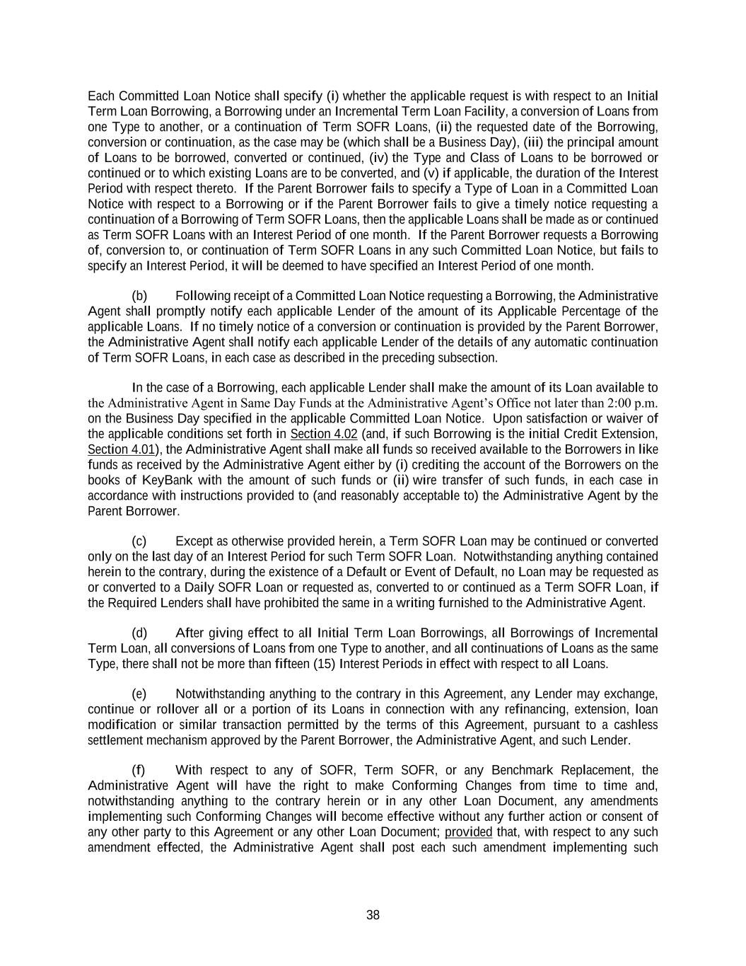 38 Each Committed Loan Notice shall specify (i) whether the applicable request is with respect to an Initial Term Loan Borrowing, a Borrowing under an Incremental Term Loan Facility, a conversion of Loans from one Type to another, or a continuation of Term SOFR Loans, (ii) the requested date of the Borrowing, conversion or continuation, as the case may be (which shall be a Business Day), (iii) the principal amount of Loans to be borrowed, converted or continued, (iv) the Type and Class of Loans to be borrowed or continued or to which existing Loans are to be converted, and (v) if applicable, the duration of the Interest Period with respect thereto. If the Parent Borrower fails to specify a Type of Loan in a Committed Loan Notice with respect to a Borrowing or if the Parent Borrower fails to give a timely notice requesting a continuation of a Borrowing of Term SOFR Loans, then the applicable Loans shall be made as or continued as Term SOFR Loans with an Interest Period of one month. If the Parent Borrower requests a Borrowing of, conversion to, or continuation of Term SOFR Loans in any such Committed Loan Notice, but fails to specify an Interest Period, it will be deemed to have specified an Interest Period of one month. (b) Following receipt of a Committed Loan Notice requesting a Borrowing, the Administrative Agent shall promptly notify each applicable Lender of the amount of its Applicable Percentage of the applicable Loans. If no timely notice of a conversion or continuation is provided by the Parent Borrower, the Administrative Agent shall notify each applicable Lender of the details of any automatic continuation of Term SOFR Loans, in each case as described in the preceding subsection. In the case of a Borrowing, each applicable Lender shall make the amount of its Loan available to the Administrative Agent in Same Day Funds at the Administrative Agent’s Office not later than 2:00 p.m. on the Business Day specified in the applicable Committed Loan Notice. Upon satisfaction or waiver of the applicable conditions set forth in Section 4.02 (and, if such Borrowing is the initial Credit Extension, Section 4.01), the Administrative Agent shall make all funds so received available to the Borrowers in like funds as received by the Administrative Agent either by (i) crediting the account of the Borrowers on the books of KeyBank with the amount of such funds or (ii) wire transfer of such funds, in each case in accordance with instructions provided to (and reasonably acceptable to) the Administrative Agent by the Parent Borrower. (c) Except as otherwise provided herein, a Term SOFR Loan may be continued or converted only on the last day of an Interest Period for such Term SOFR Loan. Notwithstanding anything contained herein to the contrary, during the existence of a Default or Event of Default, no Loan may be requested as or converted to a Daily SOFR Loan or requested as, converted to or continued as a Term SOFR Loan, if the Required Lenders shall have prohibited the same in a writing furnished to the Administrative Agent. (d) After giving effect to all Initial Term Loan Borrowings, all Borrowings of Incremental Term Loan, all conversions of Loans from one Type to another, and all continuations of Loans as the same Type, there shall not be more than fifteen (15) Interest Periods in effect with respect to all Loans. (e) Notwithstanding anything to the contrary in this Agreement, any Lender may exchange, continue or rollover all or a portion of its Loans in connection with any refinancing, extension, loan modification or similar transaction permitted by the terms of this Agreement, pursuant to a cashless settlement mechanism approved by the Parent Borrower, the Administrative Agent, and such Lender. (f) With respect to any of SOFR, Term SOFR, or any Benchmark Replacement, the Administrative Agent will have the right to make Conforming Changes from time to time and, notwithstanding anything to the contrary herein or in any other Loan Document, any amendments implementing such Conforming Changes will become effective without any further action or consent of any other party to this Agreement or any other Loan Document; provided that, with respect to any such amendment effected, the Administrative Agent shall post each such amendment implementing such