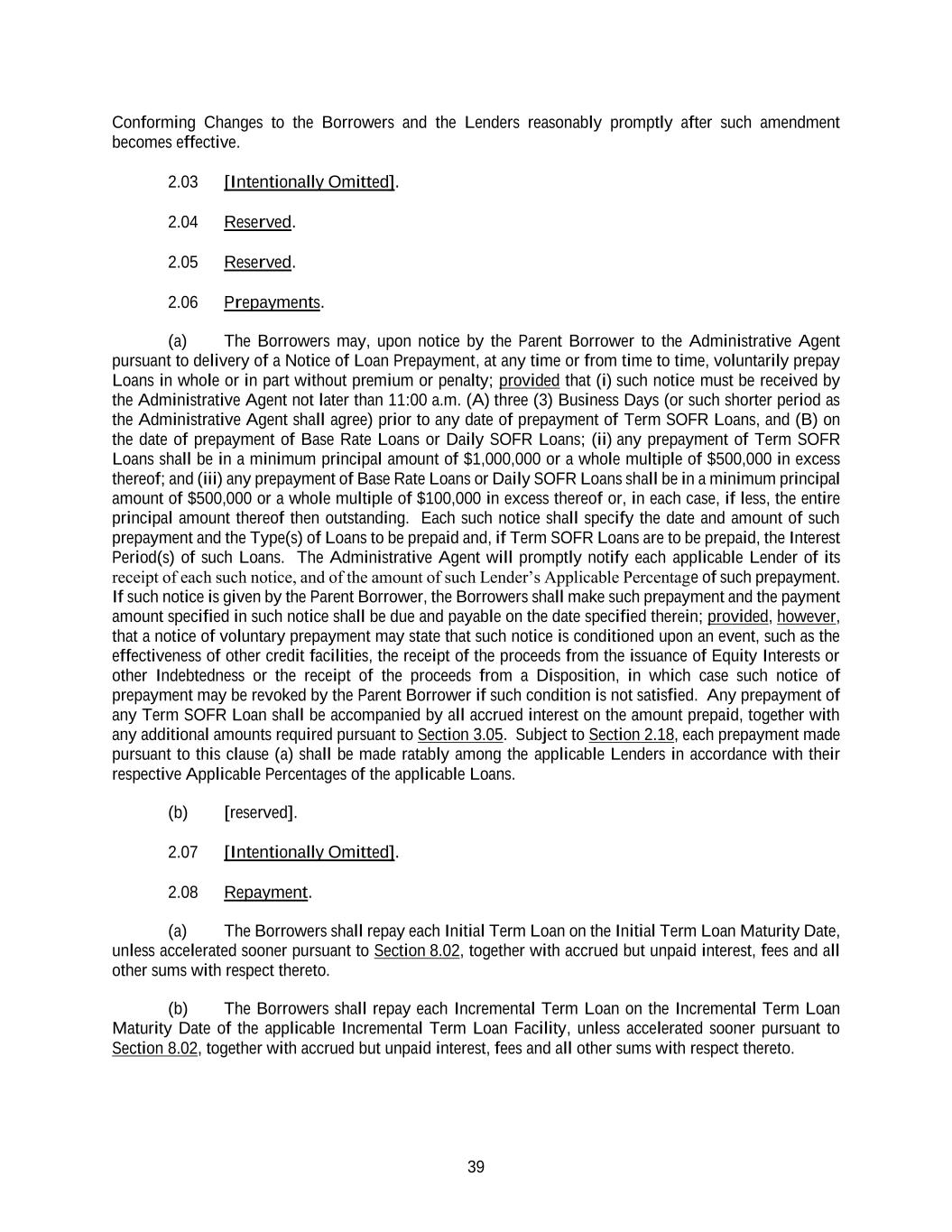 39 Conforming Changes to the Borrowers and the Lenders reasonably promptly after such amendment becomes effective. 2.03 [Intentionally Omitted]. 2.04 Reserved. 2.05 Reserved. 2.06 Prepayments. (a) The Borrowers may, upon notice by the Parent Borrower to the Administrative Agent pursuant to delivery of a Notice of Loan Prepayment, at any time or from time to time, voluntarily prepay Loans in whole or in part without premium or penalty; provided that (i) such notice must be received by the Administrative Agent not later than 11:00 a.m. (A) three (3) Business Days (or such shorter period as the Administrative Agent shall agree) prior to any date of prepayment of Term SOFR Loans, and (B) on the date of prepayment of Base Rate Loans or Daily SOFR Loans; (ii) any prepayment of Term SOFR Loans shall be in a minimum principal amount of $1,000,000 or a whole multiple of $500,000 in excess thereof; and (iii) any prepayment of Base Rate Loans or Daily SOFR Loans shall be in a minimum principal amount of $500,000 or a whole multiple of $100,000 in excess thereof or, in each case, if less, the entire principal amount thereof then outstanding. Each such notice shall specify the date and amount of such prepayment and the Type(s) of Loans to be prepaid and, if Term SOFR Loans are to be prepaid, the Interest Period(s) of such Loans. The Administrative Agent will promptly notify each applicable Lender of its receipt of each such notice, and of the amount of such Lender’s Applicable Percentage of such prepayment. If such notice is given by the Parent Borrower, the Borrowers shall make such prepayment and the payment amount specified in such notice shall be due and payable on the date specified therein; provided, however, that a notice of voluntary prepayment may state that such notice is conditioned upon an event, such as the effectiveness of other credit facilities, the receipt of the proceeds from the issuance of Equity Interests or other Indebtedness or the receipt of the proceeds from a Disposition, in which case such notice of prepayment may be revoked by the Parent Borrower if such condition is not satisfied. Any prepayment of any Term SOFR Loan shall be accompanied by all accrued interest on the amount prepaid, together with any additional amounts required pursuant to Section 3.05. Subject to Section 2.18, each prepayment made pursuant to this clause (a) shall be made ratably among the applicable Lenders in accordance with their respective Applicable Percentages of the applicable Loans. (b) [reserved]. 2.07 [Intentionally Omitted]. 2.08 Repayment. (a) The Borrowers shall repay each Initial Term Loan on the Initial Term Loan Maturity Date, unless accelerated sooner pursuant to Section 8.02, together with accrued but unpaid interest, fees and all other sums with respect thereto. (b) The Borrowers shall repay each Incremental Term Loan on the Incremental Term Loan Maturity Date of the applicable Incremental Term Loan Facility, unless accelerated sooner pursuant to Section 8.02, together with accrued but unpaid interest, fees and all other sums with respect thereto.
