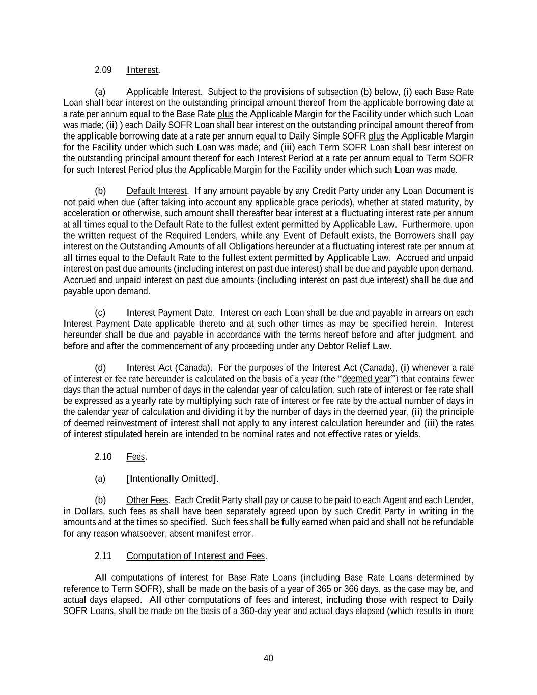 40 2.09 Interest. (a) Applicable Interest. Subject to the provisions of subsection (b) below, (i) each Base Rate Loan shall bear interest on the outstanding principal amount thereof from the applicable borrowing date at a rate per annum equal to the Base Rate plus the Applicable Margin for the Facility under which such Loan was made; (ii) ) each Daily SOFR Loan shall bear interest on the outstanding principal amount thereof from the applicable borrowing date at a rate per annum equal to Daily Simple SOFR plus the Applicable Margin for the Facility under which such Loan was made; and (iii) each Term SOFR Loan shall bear interest on the outstanding principal amount thereof for each Interest Period at a rate per annum equal to Term SOFR for such Interest Period plus the Applicable Margin for the Facility under which such Loan was made. (b) Default Interest. If any amount payable by any Credit Party under any Loan Document is not paid when due (after taking into account any applicable grace periods), whether at stated maturity, by acceleration or otherwise, such amount shall thereafter bear interest at a fluctuating interest rate per annum at all times equal to the Default Rate to the fullest extent permitted by Applicable Law. Furthermore, upon the written request of the Required Lenders, while any Event of Default exists, the Borrowers shall pay interest on the Outstanding Amounts of all Obligations hereunder at a fluctuating interest rate per annum at all times equal to the Default Rate to the fullest extent permitted by Applicable Law. Accrued and unpaid interest on past due amounts (including interest on past due interest) shall be due and payable upon demand. Accrued and unpaid interest on past due amounts (including interest on past due interest) shall be due and payable upon demand. (c) Interest Payment Date. Interest on each Loan shall be due and payable in arrears on each Interest Payment Date applicable thereto and at such other times as may be specified herein. Interest hereunder shall be due and payable in accordance with the terms hereof before and after judgment, and before and after the commencement of any proceeding under any Debtor Relief Law. (d) Interest Act (Canada). For the purposes of the Interest Act (Canada), (i) whenever a rate of interest or fee rate hereunder is calculated on the basis of a year (the “deemed year”) that contains fewer days than the actual number of days in the calendar year of calculation, such rate of interest or fee rate shall be expressed as a yearly rate by multiplying such rate of interest or fee rate by the actual number of days in the calendar year of calculation and dividing it by the number of days in the deemed year, (ii) the principle of deemed reinvestment of interest shall not apply to any interest calculation hereunder and (iii) the rates of interest stipulated herein are intended to be nominal rates and not effective rates or yields. 2.10 Fees. (a) [Intentionally Omitted]. (b) Other Fees. Each Credit Party shall pay or cause to be paid to each Agent and each Lender, in Dollars, such fees as shall have been separately agreed upon by such Credit Party in writing in the amounts and at the times so specified. Such fees shall be fully earned when paid and shall not be refundable for any reason whatsoever, absent manifest error. 2.11 Computation of Interest and Fees. All computations of interest for Base Rate Loans (including Base Rate Loans determined by reference to Term SOFR), shall be made on the basis of a year of 365 or 366 days, as the case may be, and actual days elapsed. All other computations of fees and interest, including those with respect to Daily SOFR Loans, shall be made on the basis of a 360-day year and actual days elapsed (which results in more