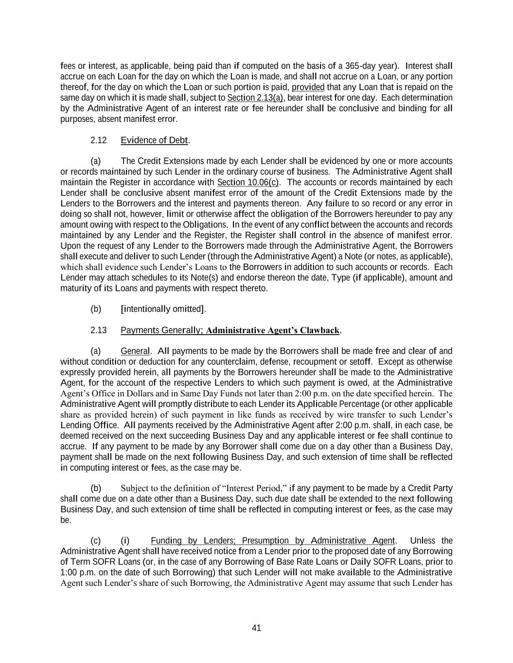 41 fees or interest, as applicable, being paid than if computed on the basis of a 365-day year). Interest shall accrue on each Loan for the day on which the Loan is made, and shall not accrue on a Loan, or any portion thereof, for the day on which the Loan or such portion is paid, provided that any Loan that is repaid on the same day on which it is made shall, subject to Section 2.13(a), bear interest for one day. Each determination by the Administrative Agent of an interest rate or fee hereunder shall be conclusive and binding for all purposes, absent manifest error. 2.12 Evidence of Debt. (a) The Credit Extensions made by each Lender shall be evidenced by one or more accounts or records maintained by such Lender in the ordinary course of business. The Administrative Agent shall maintain the Register in accordance with Section 10.06(c). The accounts or records maintained by each Lender shall be conclusive absent manifest error of the amount of the Credit Extensions made by the Lenders to the Borrowers and the interest and payments thereon. Any failure to so record or any error in doing so shall not, however, limit or otherwise affect the obligation of the Borrowers hereunder to pay any amount owing with respect to the Obligations. In the event of any conflict between the accounts and records maintained by any Lender and the Register, the Register shall control in the absence of manifest error. Upon the request of any Lender to the Borrowers made through the Administrative Agent, the Borrowers shall execute and deliver to such Lender (through the Administrative Agent) a Note (or notes, as applicable), which shall evidence such Lender’s Loans to the Borrowers in addition to such accounts or records. Each Lender may attach schedules to its Note(s) and endorse thereon the date, Type (if applicable), amount and maturity of its Loans and payments with respect thereto. (b) [intentionally omitted]. 2.13 Payments Generally; Administrative Agent’s Clawback. (a) General. All payments to be made by the Borrowers shall be made free and clear of and without condition or deduction for any counterclaim, defense, recoupment or setoff. Except as otherwise expressly provided herein, all payments by the Borrowers hereunder shall be made to the Administrative Agent, for the account of the respective Lenders to which such payment is owed, at the Administrative Agent’s Office in Dollars and in Same Day Funds not later than 2:00 p.m. on the date specified herein. The Administrative Agent will promptly distribute to each Lender its Applicable Percentage (or other applicable share as provided herein) of such payment in like funds as received by wire transfer to such Lender’s Lending Office. All payments received by the Administrative Agent after 2:00 p.m. shall, in each case, be deemed received on the next succeeding Business Day and any applicable interest or fee shall continue to accrue. If any payment to be made by any Borrower shall come due on a day other than a Business Day, payment shall be made on the next following Business Day, and such extension of time shall be reflected in computing interest or fees, as the case may be. (b) Subject to the definition of “Interest Period,” if any payment to be made by a Credit Party shall come due on a date other than a Business Day, such due date shall be extended to the next following Business Day, and such extension of time shall be reflected in computing interest or fees, as the case may be. (c) (i) Funding by Lenders; Presumption by Administrative Agent. Unless the Administrative Agent shall have received notice from a Lender prior to the proposed date of any Borrowing of Term SOFR Loans (or, in the case of any Borrowing of Base Rate Loans or Daily SOFR Loans, prior to 1:00 p.m. on the date of such Borrowing) that such Lender will not make available to the Administrative Agent such Lender’s share of such Borrowing, the Administrative Agent may assume that such Lender has