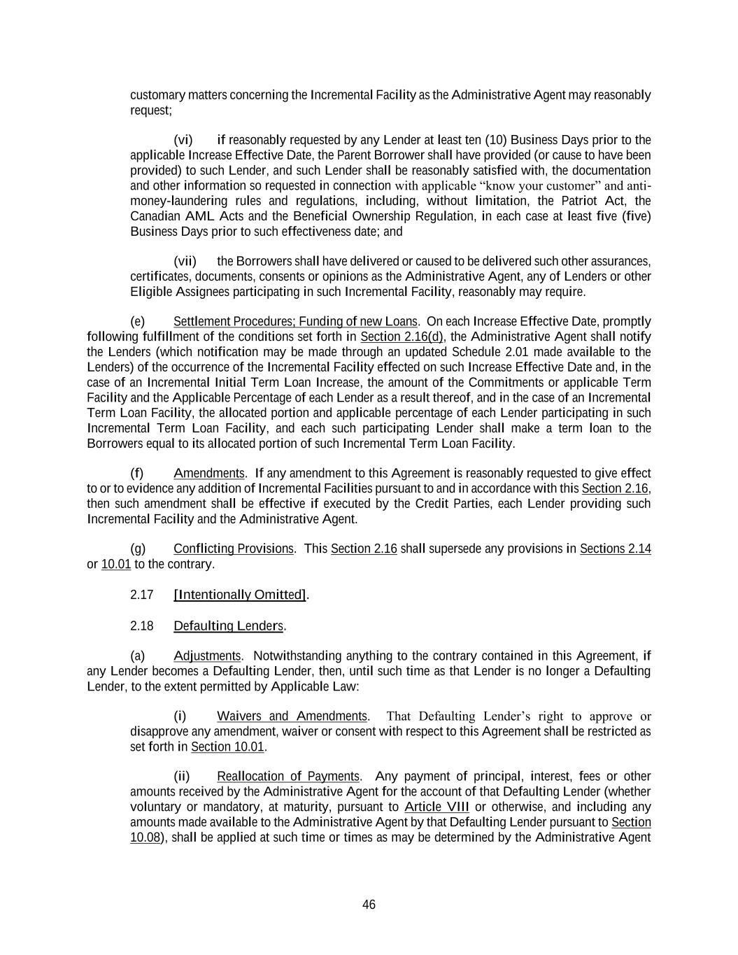 46 customary matters concerning the Incremental Facility as the Administrative Agent may reasonably request; (vi) if reasonably requested by any Lender at least ten (10) Business Days prior to the applicable Increase Effective Date, the Parent Borrower shall have provided (or cause to have been provided) to such Lender, and such Lender shall be reasonably satisfied with, the documentation and other information so requested in connection with applicable “know your customer” and anti- money-laundering rules and regulations, including, without limitation, the Patriot Act, the Canadian AML Acts and the Beneficial Ownership Regulation, in each case at least five (five) Business Days prior to such effectiveness date; and (vii) the Borrowers shall have delivered or caused to be delivered such other assurances, certificates, documents, consents or opinions as the Administrative Agent, any of Lenders or other Eligible Assignees participating in such Incremental Facility, reasonably may require. (e) Settlement Procedures; Funding of new Loans. On each Increase Effective Date, promptly following fulfillment of the conditions set forth in Section 2.16(d), the Administrative Agent shall notify the Lenders (which notification may be made through an updated Schedule 2.01 made available to the Lenders) of the occurrence of the Incremental Facility effected on such Increase Effective Date and, in the case of an Incremental Initial Term Loan Increase, the amount of the Commitments or applicable Term Facility and the Applicable Percentage of each Lender as a result thereof, and in the case of an Incremental Term Loan Facility, the allocated portion and applicable percentage of each Lender participating in such Incremental Term Loan Facility, and each such participating Lender shall make a term loan to the Borrowers equal to its allocated portion of such Incremental Term Loan Facility. (f) Amendments. If any amendment to this Agreement is reasonably requested to give effect to or to evidence any addition of Incremental Facilities pursuant to and in accordance with this Section 2.16, then such amendment shall be effective if executed by the Credit Parties, each Lender providing such Incremental Facility and the Administrative Agent. (g) Conflicting Provisions. This Section 2.16 shall supersede any provisions in Sections 2.14 or 10.01 to the contrary. 2.17 [Intentionally Omitted]. 2.18 Defaulting Lenders. (a) Adjustments. Notwithstanding anything to the contrary contained in this Agreement, if any Lender becomes a Defaulting Lender, then, until such time as that Lender is no longer a Defaulting Lender, to the extent permitted by Applicable Law: (i) Waivers and Amendments. That Defaulting Lender’s right to approve or disapprove any amendment, waiver or consent with respect to this Agreement shall be restricted as set forth in Section 10.01. (ii) Reallocation of Payments. Any payment of principal, interest, fees or other amounts received by the Administrative Agent for the account of that Defaulting Lender (whether voluntary or mandatory, at maturity, pursuant to Article VIII or otherwise, and including any amounts made available to the Administrative Agent by that Defaulting Lender pursuant to Section 10.08), shall be applied at such time or times as may be determined by the Administrative Agent