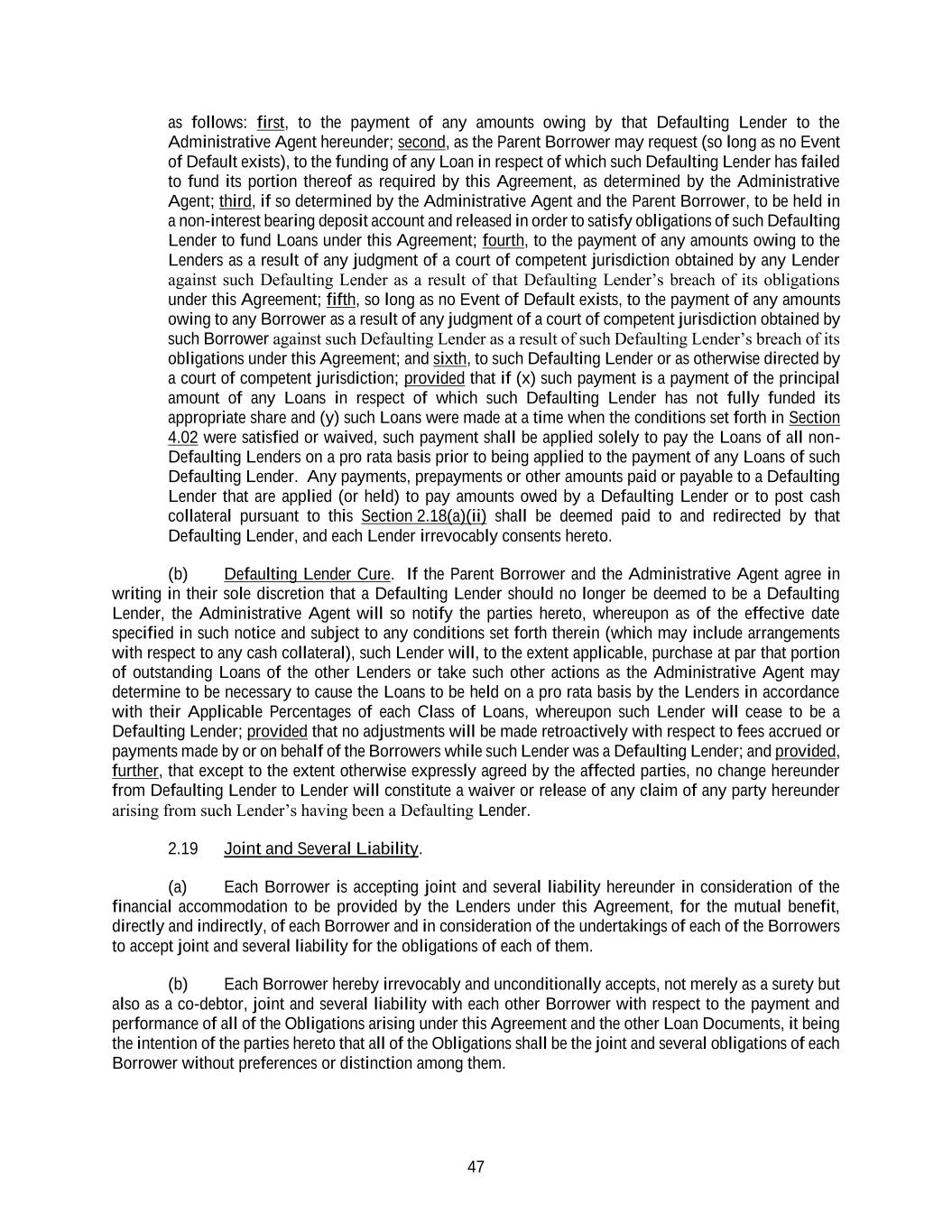 47 as follows: first, to the payment of any amounts owing by that Defaulting Lender to the Administrative Agent hereunder; second, as the Parent Borrower may request (so long as no Event of Default exists), to the funding of any Loan in respect of which such Defaulting Lender has failed to fund its portion thereof as required by this Agreement, as determined by the Administrative Agent; third, if so determined by the Administrative Agent and the Parent Borrower, to be held in a non-interest bearing deposit account and released in order to satisfy obligations of such Defaulting Lender to fund Loans under this Agreement; fourth, to the payment of any amounts owing to the Lenders as a result of any judgment of a court of competent jurisdiction obtained by any Lender against such Defaulting Lender as a result of that Defaulting Lender’s breach of its obligations under this Agreement; fifth, so long as no Event of Default exists, to the payment of any amounts owing to any Borrower as a result of any judgment of a court of competent jurisdiction obtained by such Borrower against such Defaulting Lender as a result of such Defaulting Lender’s breach of its obligations under this Agreement; and sixth, to such Defaulting Lender or as otherwise directed by a court of competent jurisdiction; provided that if (x) such payment is a payment of the principal amount of any Loans in respect of which such Defaulting Lender has not fully funded its appropriate share and (y) such Loans were made at a time when the conditions set forth in Section 4.02 were satisfied or waived, such payment shall be applied solely to pay the Loans of all non- Defaulting Lenders on a pro rata basis prior to being applied to the payment of any Loans of such Defaulting Lender. Any payments, prepayments or other amounts paid or payable to a Defaulting Lender that are applied (or held) to pay amounts owed by a Defaulting Lender or to post cash collateral pursuant to this Section 2.18(a)(ii) shall be deemed paid to and redirected by that Defaulting Lender, and each Lender irrevocably consents hereto. (b) Defaulting Lender Cure. If the Parent Borrower and the Administrative Agent agree in writing in their sole discretion that a Defaulting Lender should no longer be deemed to be a Defaulting Lender, the Administrative Agent will so notify the parties hereto, whereupon as of the effective date specified in such notice and subject to any conditions set forth therein (which may include arrangements with respect to any cash collateral), such Lender will, to the extent applicable, purchase at par that portion of outstanding Loans of the other Lenders or take such other actions as the Administrative Agent may determine to be necessary to cause the Loans to be held on a pro rata basis by the Lenders in accordance with their Applicable Percentages of each Class of Loans, whereupon such Lender will cease to be a Defaulting Lender; provided that no adjustments will be made retroactively with respect to fees accrued or payments made by or on behalf of the Borrowers while such Lender was a Defaulting Lender; and provided, further, that except to the extent otherwise expressly agreed by the affected parties, no change hereunder from Defaulting Lender to Lender will constitute a waiver or release of any claim of any party hereunder arising from such Lender’s having been a Defaulting Lender. 2.19 Joint and Several Liability. (a) Each Borrower is accepting joint and several liability hereunder in consideration of the financial accommodation to be provided by the Lenders under this Agreement, for the mutual benefit, directly and indirectly, of each Borrower and in consideration of the undertakings of each of the Borrowers to accept joint and several liability for the obligations of each of them. (b) Each Borrower hereby irrevocably and unconditionally accepts, not merely as a surety but also as a co-debtor, joint and several liability with each other Borrower with respect to the payment and performance of all of the Obligations arising under this Agreement and the other Loan Documents, it being the intention of the parties hereto that all of the Obligations shall be the joint and several obligations of each Borrower without preferences or distinction among them.