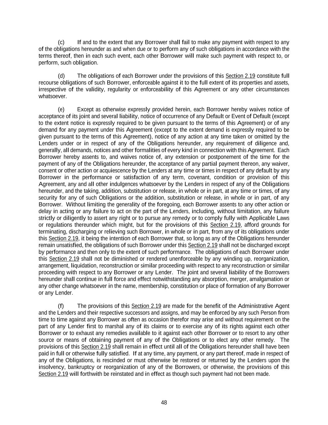 48 (c) If and to the extent that any Borrower shall fail to make any payment with respect to any of the obligations hereunder as and when due or to perform any of such obligations in accordance with the terms thereof, then in each such event, each other Borrower will make such payment with respect to, or perform, such obligation. (d) The obligations of each Borrower under the provisions of this Section 2.19 constitute full recourse obligations of such Borrower, enforceable against it to the full extent of its properties and assets, irrespective of the validity, regularity or enforceability of this Agreement or any other circumstances whatsoever. (e) Except as otherwise expressly provided herein, each Borrower hereby waives notice of acceptance of its joint and several liability, notice of occurrence of any Default or Event of Default (except to the extent notice is expressly required to be given pursuant to the terms of this Agreement) or of any demand for any payment under this Agreement (except to the extent demand is expressly required to be given pursuant to the terms of this Agreement), notice of any action at any time taken or omitted by the Lenders under or in respect of any of the Obligations hereunder, any requirement of diligence and, generally, all demands, notices and other formalities of every kind in connection with this Agreement. Each Borrower hereby assents to, and waives notice of, any extension or postponement of the time for the payment of any of the Obligations hereunder, the acceptance of any partial payment thereon, any waiver, consent or other action or acquiescence by the Lenders at any time or times in respect of any default by any Borrower in the performance or satisfaction of any term, covenant, condition or provision of this Agreement, any and all other indulgences whatsoever by the Lenders in respect of any of the Obligations hereunder, and the taking, addition, substitution or release, in whole or in part, at any time or times, of any security for any of such Obligations or the addition, substitution or release, in whole or in part, of any Borrower. Without limiting the generality of the foregoing, each Borrower assents to any other action or delay in acting or any failure to act on the part of the Lenders, including, without limitation, any failure strictly or diligently to assert any right or to pursue any remedy or to comply fully with Applicable Laws or regulations thereunder which might, but for the provisions of this Section 2.19, afford grounds for terminating, discharging or relieving such Borrower, in whole or in part, from any of its obligations under this Section 2.19, it being the intention of each Borrower that, so long as any of the Obligations hereunder remain unsatisfied, the obligations of such Borrower under this Section 2.19 shall not be discharged except by performance and then only to the extent of such performance. The obligations of each Borrower under this Section 2.19 shall not be diminished or rendered unenforceable by any winding up, reorganization, arrangement, liquidation, reconstruction or similar proceeding with respect to any reconstruction or similar proceeding with respect to any Borrower or any Lender. The joint and several liability of the Borrowers hereunder shall continue in full force and effect notwithstanding any absorption, merger, amalgamation or any other change whatsoever in the name, membership, constitution or place of formation of any Borrower or any Lender. (f) The provisions of this Section 2.19 are made for the benefit of the Administrative Agent and the Lenders and their respective successors and assigns, and may be enforced by any such Person from time to time against any Borrower as often as occasion therefor may arise and without requirement on the part of any Lender first to marshal any of its claims or to exercise any of its rights against each other Borrower or to exhaust any remedies available to it against each other Borrower or to resort to any other source or means of obtaining payment of any of the Obligations or to elect any other remedy. The provisions of this Section 2.19 shall remain in effect until all of the Obligations hereunder shall have been paid in full or otherwise fully satisfied. If at any time, any payment, or any part thereof, made in respect of any of the Obligations, is rescinded or must otherwise be restored or returned by the Lenders upon the insolvency, bankruptcy or reorganization of any of the Borrowers, or otherwise, the provisions of this Section 2.19 will forthwith be reinstated and in effect as though such payment had not been made.