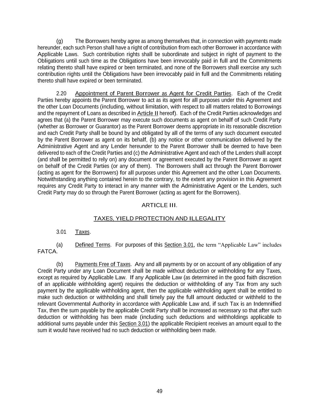 49 (g) The Borrowers hereby agree as among themselves that, in connection with payments made hereunder, each such Person shall have a right of contribution from each other Borrower in accordance with Applicable Laws. Such contribution rights shall be subordinate and subject in right of payment to the Obligations until such time as the Obligations have been irrevocably paid in full and the Commitments relating thereto shall have expired or been terminated, and none of the Borrowers shall exercise any such contribution rights until the Obligations have been irrevocably paid in full and the Commitments relating thereto shall have expired or been terminated. 2.20 Appointment of Parent Borrower as Agent for Credit Parties. Each of the Credit Parties hereby appoints the Parent Borrower to act as its agent for all purposes under this Agreement and the other Loan Documents (including, without limitation, with respect to all matters related to Borrowings and the repayment of Loans as described in Article II hereof). Each of the Credit Parties acknowledges and agrees that (a) the Parent Borrower may execute such documents as agent on behalf of such Credit Party (whether as Borrower or Guarantor) as the Parent Borrower deems appropriate in its reasonable discretion and each Credit Party shall be bound by and obligated by all of the terms of any such document executed by the Parent Borrower as agent on its behalf, (b) any notice or other communication delivered by the Administrative Agent and any Lender hereunder to the Parent Borrower shall be deemed to have been delivered to each of the Credit Parties and (c) the Administrative Agent and each of the Lenders shall accept (and shall be permitted to rely on) any document or agreement executed by the Parent Borrower as agent on behalf of the Credit Parties (or any of them). The Borrowers shall act through the Parent Borrower (acting as agent for the Borrowers) for all purposes under this Agreement and the other Loan Documents. Notwithstanding anything contained herein to the contrary, to the extent any provision in this Agreement requires any Credit Party to interact in any manner with the Administrative Agent or the Lenders, such Credit Party may do so through the Parent Borrower (acting as agent for the Borrowers). ARTICLE III. TAXES, YIELD PROTECTION AND ILLEGALITY 3.01 Taxes. (a) Defined Terms. For purposes of this Section 3.01, the term “Applicable Law” includes FATCA. (b) Payments Free of Taxes. Any and all payments by or on account of any obligation of any Credit Party under any Loan Document shall be made without deduction or withholding for any Taxes, except as required by Applicable Law. If any Applicable Law (as determined in the good faith discretion of an applicable withholding agent) requires the deduction or withholding of any Tax from any such payment by the applicable withholding agent, then the applicable withholding agent shall be entitled to make such deduction or withholding and shall timely pay the full amount deducted or withheld to the relevant Governmental Authority in accordance with Applicable Law and, if such Tax is an Indemnified Tax, then the sum payable by the applicable Credit Party shall be increased as necessary so that after such deduction or withholding has been made (including such deductions and withholdings applicable to additional sums payable under this Section 3.01) the applicable Recipient receives an amount equal to the sum it would have received had no such deduction or withholding been made.