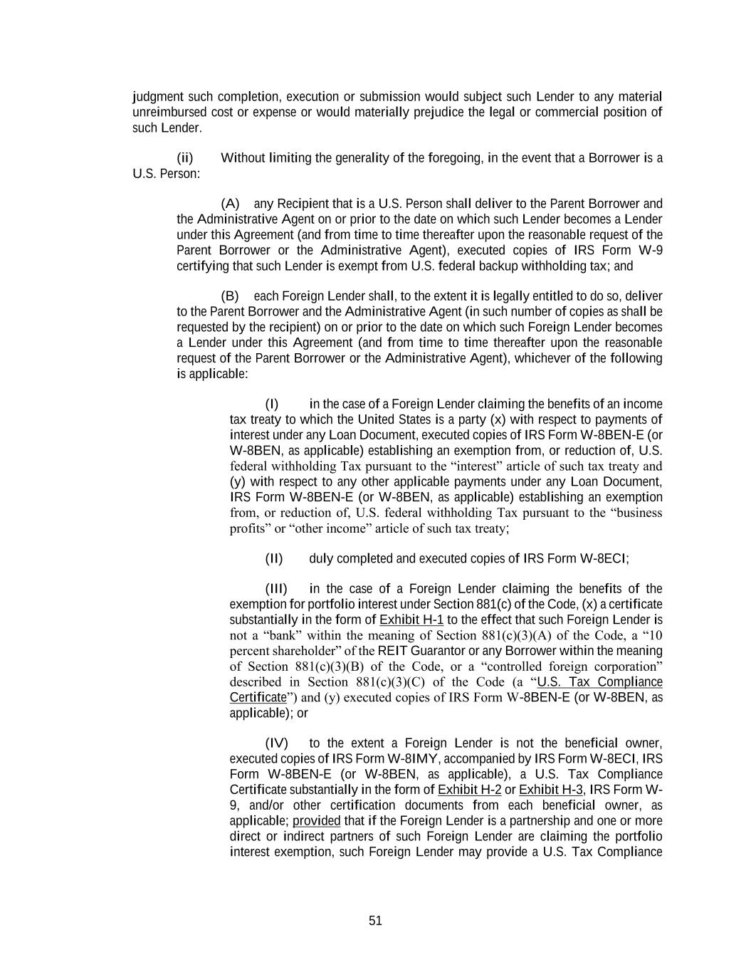 51 judgment such completion, execution or submission would subject such Lender to any material unreimbursed cost or expense or would materially prejudice the legal or commercial position of such Lender. (ii) Without limiting the generality of the foregoing, in the event that a Borrower is a U.S. Person: (A) any Recipient that is a U.S. Person shall deliver to the Parent Borrower and the Administrative Agent on or prior to the date on which such Lender becomes a Lender under this Agreement (and from time to time thereafter upon the reasonable request of the Parent Borrower or the Administrative Agent), executed copies of IRS Form W-9 certifying that such Lender is exempt from U.S. federal backup withholding tax; and (B) each Foreign Lender shall, to the extent it is legally entitled to do so, deliver to the Parent Borrower and the Administrative Agent (in such number of copies as shall be requested by the recipient) on or prior to the date on which such Foreign Lender becomes a Lender under this Agreement (and from time to time thereafter upon the reasonable request of the Parent Borrower or the Administrative Agent), whichever of the following is applicable: (I) in the case of a Foreign Lender claiming the benefits of an income tax treaty to which the United States is a party (x) with respect to payments of interest under any Loan Document, executed copies of IRS Form W-8BEN-E (or W-8BEN, as applicable) establishing an exemption from, or reduction of, U.S. federal withholding Tax pursuant to the “interest” article of such tax treaty and (y) with respect to any other applicable payments under any Loan Document, IRS Form W-8BEN-E (or W-8BEN, as applicable) establishing an exemption from, or reduction of, U.S. federal withholding Tax pursuant to the “business profits” or “other income” article of such tax treaty; (II) duly completed and executed copies of IRS Form W-8ECI; (III) in the case of a Foreign Lender claiming the benefits of the exemption for portfolio interest under Section 881(c) of the Code, (x) a certificate substantially in the form of Exhibit H-1 to the effect that such Foreign Lender is not a “bank” within the meaning of Section 881(c)(3)(A) of the Code, a “10 percent shareholder” of the REIT Guarantor or any Borrower within the meaning of Section 881(c)(3)(B) of the Code, or a “controlled foreign corporation” described in Section 881(c)(3)(C) of the Code (a “U.S. Tax Compliance Certificate”) and (y) executed copies of IRS Form W-8BEN-E (or W-8BEN, as applicable); or (IV) to the extent a Foreign Lender is not the beneficial owner, executed copies of IRS Form W-8IMY, accompanied by IRS Form W-8ECI, IRS Form W-8BEN-E (or W-8BEN, as applicable), a U.S. Tax Compliance Certificate substantially in the form of Exhibit H-2 or Exhibit H-3, IRS Form W- 9, and/or other certification documents from each beneficial owner, as applicable; provided that if the Foreign Lender is a partnership and one or more direct or indirect partners of such Foreign Lender are claiming the portfolio interest exemption, such Foreign Lender may provide a U.S. Tax Compliance