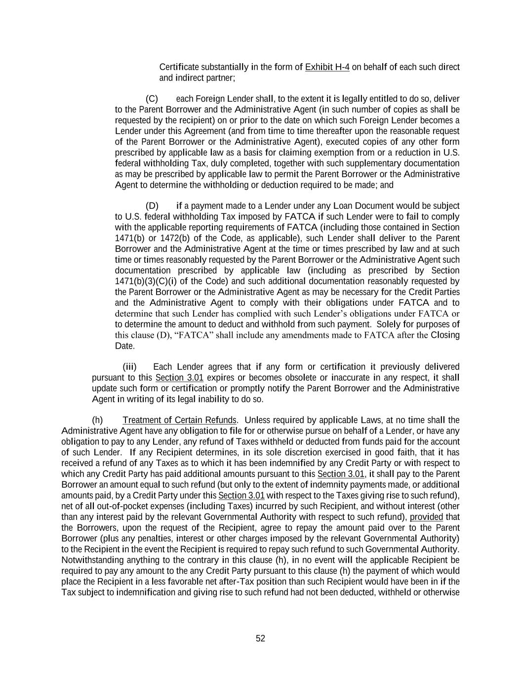 52 Certificate substantially in the form of Exhibit H-4 on behalf of each such direct and indirect partner; (C) each Foreign Lender shall, to the extent it is legally entitled to do so, deliver to the Parent Borrower and the Administrative Agent (in such number of copies as shall be requested by the recipient) on or prior to the date on which such Foreign Lender becomes a Lender under this Agreement (and from time to time thereafter upon the reasonable request of the Parent Borrower or the Administrative Agent), executed copies of any other form prescribed by applicable law as a basis for claiming exemption from or a reduction in U.S. federal withholding Tax, duly completed, together with such supplementary documentation as may be prescribed by applicable law to permit the Parent Borrower or the Administrative Agent to determine the withholding or deduction required to be made; and (D) if a payment made to a Lender under any Loan Document would be subject to U.S. federal withholding Tax imposed by FATCA if such Lender were to fail to comply with the applicable reporting requirements of FATCA (including those contained in Section 1471(b) or 1472(b) of the Code, as applicable), such Lender shall deliver to the Parent Borrower and the Administrative Agent at the time or times prescribed by law and at such time or times reasonably requested by the Parent Borrower or the Administrative Agent such documentation prescribed by applicable law (including as prescribed by Section 1471(b)(3)(C)(i) of the Code) and such additional documentation reasonably requested by the Parent Borrower or the Administrative Agent as may be necessary for the Credit Parties and the Administrative Agent to comply with their obligations under FATCA and to determine that such Lender has complied with such Lender’s obligations under FATCA or to determine the amount to deduct and withhold from such payment. Solely for purposes of this clause (D), “FATCA” shall include any amendments made to FATCA after the Closing Date. (iii) Each Lender agrees that if any form or certification it previously delivered pursuant to this Section 3.01 expires or becomes obsolete or inaccurate in any respect, it shall update such form or certification or promptly notify the Parent Borrower and the Administrative Agent in writing of its legal inability to do so. (h) Treatment of Certain Refunds. Unless required by applicable Laws, at no time shall the Administrative Agent have any obligation to file for or otherwise pursue on behalf of a Lender, or have any obligation to pay to any Lender, any refund of Taxes withheld or deducted from funds paid for the account of such Lender. If any Recipient determines, in its sole discretion exercised in good faith, that it has received a refund of any Taxes as to which it has been indemnified by any Credit Party or with respect to which any Credit Party has paid additional amounts pursuant to this Section 3.01, it shall pay to the Parent Borrower an amount equal to such refund (but only to the extent of indemnity payments made, or additional amounts paid, by a Credit Party under this Section 3.01 with respect to the Taxes giving rise to such refund), net of all out-of-pocket expenses (including Taxes) incurred by such Recipient, and without interest (other than any interest paid by the relevant Governmental Authority with respect to such refund), provided that the Borrowers, upon the request of the Recipient, agree to repay the amount paid over to the Parent Borrower (plus any penalties, interest or other charges imposed by the relevant Governmental Authority) to the Recipient in the event the Recipient is required to repay such refund to such Governmental Authority. Notwithstanding anything to the contrary in this clause (h), in no event will the applicable Recipient be required to pay any amount to the any Credit Party pursuant to this clause (h) the payment of which would place the Recipient in a less favorable net after-Tax position than such Recipient would have been in if the Tax subject to indemnification and giving rise to such refund had not been deducted, withheld or otherwise