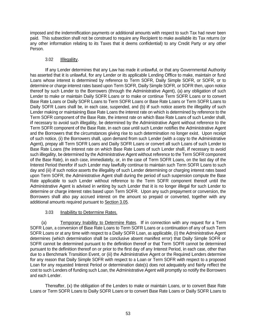 53 imposed and the indemnification payments or additional amounts with respect to such Tax had never been paid. This subsection shall not be construed to require any Recipient to make available its Tax returns (or any other information relating to its Taxes that it deems confidential) to any Credit Party or any other Person. 3.02 Illegality. If any Lender determines that any Law has made it unlawful, or that any Governmental Authority has asserted that it is unlawful, for any Lender or its applicable Lending Office to make, maintain or fund Loans whose interest is determined by reference to Term SOFR, Daily Simple SOFR, or SOFR, or to determine or charge interest rates based upon Term SOFR, Daily Simple SOFR, or SOFR then, upon notice thereof by such Lender to the Borrowers (through the Administrative Agent), (a) any obligation of such Lender to make or maintain Daily SOFR Loans or to make or continue Term SOFR Loans or to convert Base Rate Loans or Daily SOFR Loans to Term SOFR Loans or Base Rate Loans or Term SOFR Loans to Daily SOFR Loans shall be, in each case, suspended, and (b) if such notice asserts the illegality of such Lender making or maintaining Base Rate Loans the interest rate on which is determined by reference to the Term SOFR component of the Base Rate, the interest rate on which Base Rate Loans of such Lender shall, if necessary to avoid such illegality, be determined by the Administrative Agent without reference to the Term SOFR component of the Base Rate, in each case until such Lender notifies the Administrative Agent and the Borrowers that the circumstances giving rise to such determination no longer exist. Upon receipt of such notice, (i) the Borrowers shall, upon demand from such Lender (with a copy to the Administrative Agent), prepay all Term SOFR Loans and Daily SOFR Loans or convert all such Loans of such Lender to Base Rate Loans (the interest rate on which Base Rate Loans of such Lender shall, if necessary to avoid such illegality, be determined by the Administrative Agent without reference to the Term SOFR component of the Base Rate), in each case, immediately, or, in the case of Term SOFR Loans, on the last day of the Interest Period therefor if such Lender may lawfully continue to maintain such Term SOFR Loans to such day and (ii) if such notice asserts the illegality of such Lender determining or charging interest rates based upon Term SOFR, the Administrative Agent shall during the period of such suspension compute the Base Rate applicable to such Lender without reference to the Term SOFR component thereof until the Administrative Agent is advised in writing by such Lender that it is no longer illegal for such Lender to determine or charge interest rates based upon Term SOFR. Upon any such prepayment or conversion, the Borrowers shall also pay accrued interest on the amount so prepaid or converted, together with any additional amounts required pursuant to Section 3.05. 3.03 Inability to Determine Rates. (a) Temporary Inability to Determine Rates. If in connection with any request for a Term SOFR Loan, a conversion of Base Rate Loans to Term SOFR Loans or a continuation of any of such Term SOFR Loans or at any time with respect to a Daily SOFR Loan, as applicable, (i) the Administrative Agent determines (which determination shall be conclusive absent manifest error) that Daily Simple SOFR or SOFR cannot be determined pursuant to the definition thereof or that Term SOFR cannot be determined pursuant to the definition thereof on or prior to the first day of any Interest Period, in each case, other than due to a Benchmark Transition Event, or (ii) the Administrative Agent or the Required Lenders determine for any reason that Daily Simple SOFR with respect to a Loan or Term SOFR with respect to a proposed Loan for any requested Interest Period or determination date(s) does not adequately and fairly reflect the cost to such Lenders of funding such Loan, the Administrative Agent will promptly so notify the Borrowers and each Lender. Thereafter, (x) the obligation of the Lenders to make or maintain Loans, or to convert Base Rate Loans or Term SOFR Loans to Daily SOFR Loans or to convert Base Rate Loans or Daily SOFR Loans to