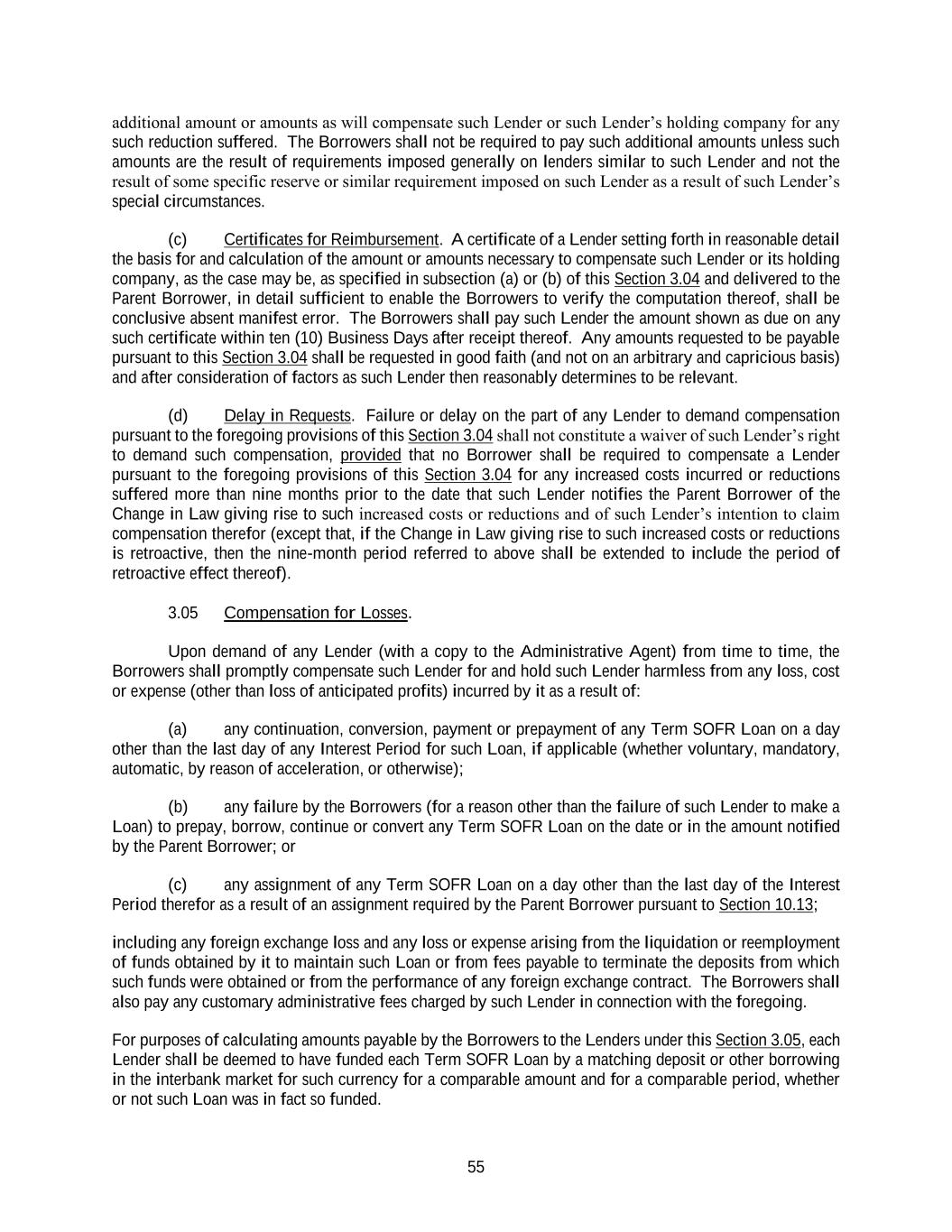 55 additional amount or amounts as will compensate such Lender or such Lender’s holding company for any such reduction suffered. The Borrowers shall not be required to pay such additional amounts unless such amounts are the result of requirements imposed generally on lenders similar to such Lender and not the result of some specific reserve or similar requirement imposed on such Lender as a result of such Lender’s special circumstances. (c) Certificates for Reimbursement. A certificate of a Lender setting forth in reasonable detail the basis for and calculation of the amount or amounts necessary to compensate such Lender or its holding company, as the case may be, as specified in subsection (a) or (b) of this Section 3.04 and delivered to the Parent Borrower, in detail sufficient to enable the Borrowers to verify the computation thereof, shall be conclusive absent manifest error. The Borrowers shall pay such Lender the amount shown as due on any such certificate within ten (10) Business Days after receipt thereof. Any amounts requested to be payable pursuant to this Section 3.04 shall be requested in good faith (and not on an arbitrary and capricious basis) and after consideration of factors as such Lender then reasonably determines to be relevant. (d) Delay in Requests. Failure or delay on the part of any Lender to demand compensation pursuant to the foregoing provisions of this Section 3.04 shall not constitute a waiver of such Lender’s right to demand such compensation, provided that no Borrower shall be required to compensate a Lender pursuant to the foregoing provisions of this Section 3.04 for any increased costs incurred or reductions suffered more than nine months prior to the date that such Lender notifies the Parent Borrower of the Change in Law giving rise to such increased costs or reductions and of such Lender’s intention to claim compensation therefor (except that, if the Change in Law giving rise to such increased costs or reductions is retroactive, then the nine-month period referred to above shall be extended to include the period of retroactive effect thereof). 3.05 Compensation for Losses. Upon demand of any Lender (with a copy to the Administrative Agent) from time to time, the Borrowers shall promptly compensate such Lender for and hold such Lender harmless from any loss, cost or expense (other than loss of anticipated profits) incurred by it as a result of: (a) any continuation, conversion, payment or prepayment of any Term SOFR Loan on a day other than the last day of any Interest Period for such Loan, if applicable (whether voluntary, mandatory, automatic, by reason of acceleration, or otherwise); (b) any failure by the Borrowers (for a reason other than the failure of such Lender to make a Loan) to prepay, borrow, continue or convert any Term SOFR Loan on the date or in the amount notified by the Parent Borrower; or (c) any assignment of any Term SOFR Loan on a day other than the last day of the Interest Period therefor as a result of an assignment required by the Parent Borrower pursuant to Section 10.13; including any foreign exchange loss and any loss or expense arising from the liquidation or reemployment of funds obtained by it to maintain such Loan or from fees payable to terminate the deposits from which such funds were obtained or from the performance of any foreign exchange contract. The Borrowers shall also pay any customary administrative fees charged by such Lender in connection with the foregoing. For purposes of calculating amounts payable by the Borrowers to the Lenders under this Section 3.05, each Lender shall be deemed to have funded each Term SOFR Loan by a matching deposit or other borrowing in the interbank market for such currency for a comparable amount and for a comparable period, whether or not such Loan was in fact so funded.