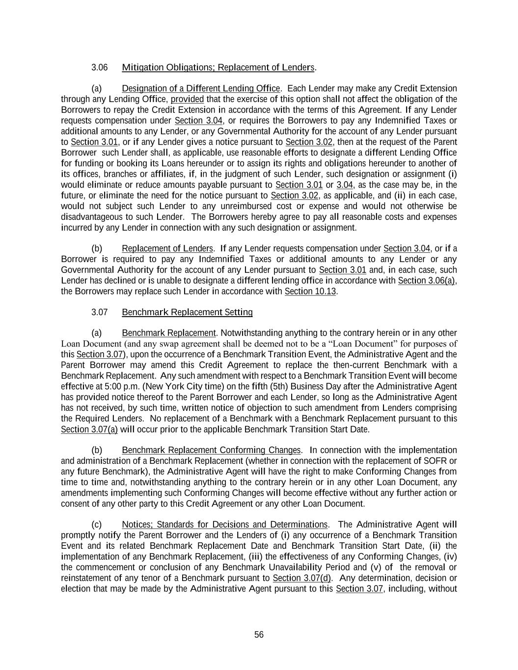 56 3.06 Mitigation Obligations; Replacement of Lenders. (a) Designation of a Different Lending Office. Each Lender may make any Credit Extension through any Lending Office, provided that the exercise of this option shall not affect the obligation of the Borrowers to repay the Credit Extension in accordance with the terms of this Agreement. If any Lender requests compensation under Section 3.04, or requires the Borrowers to pay any Indemnified Taxes or additional amounts to any Lender, or any Governmental Authority for the account of any Lender pursuant to Section 3.01, or if any Lender gives a notice pursuant to Section 3.02, then at the request of the Parent Borrower such Lender shall, as applicable, use reasonable efforts to designate a different Lending Office for funding or booking its Loans hereunder or to assign its rights and obligations hereunder to another of its offices, branches or affiliates, if, in the judgment of such Lender, such designation or assignment (i) would eliminate or reduce amounts payable pursuant to Section 3.01 or 3.04, as the case may be, in the future, or eliminate the need for the notice pursuant to Section 3.02, as applicable, and (ii) in each case, would not subject such Lender to any unreimbursed cost or expense and would not otherwise be disadvantageous to such Lender. The Borrowers hereby agree to pay all reasonable costs and expenses incurred by any Lender in connection with any such designation or assignment. (b) Replacement of Lenders. If any Lender requests compensation under Section 3.04, or if a Borrower is required to pay any Indemnified Taxes or additional amounts to any Lender or any Governmental Authority for the account of any Lender pursuant to Section 3.01 and, in each case, such Lender has declined or is unable to designate a different lending office in accordance with Section 3.06(a), the Borrowers may replace such Lender in accordance with Section 10.13. 3.07 Benchmark Replacement Setting (a) Benchmark Replacement. Notwithstanding anything to the contrary herein or in any other Loan Document (and any swap agreement shall be deemed not to be a “Loan Document” for purposes of this Section 3.07), upon the occurrence of a Benchmark Transition Event, the Administrative Agent and the Parent Borrower may amend this Credit Agreement to replace the then-current Benchmark with a Benchmark Replacement. Any such amendment with respect to a Benchmark Transition Event will become effective at 5:00 p.m. (New York City time) on the fifth (5th) Business Day after the Administrative Agent has provided notice thereof to the Parent Borrower and each Lender, so long as the Administrative Agent has not received, by such time, written notice of objection to such amendment from Lenders comprising the Required Lenders. No replacement of a Benchmark with a Benchmark Replacement pursuant to this Section 3.07(a) will occur prior to the applicable Benchmark Transition Start Date. (b) Benchmark Replacement Conforming Changes. In connection with the implementation and administration of a Benchmark Replacement (whether in connection with the replacement of SOFR or any future Benchmark), the Administrative Agent will have the right to make Conforming Changes from time to time and, notwithstanding anything to the contrary herein or in any other Loan Document, any amendments implementing such Conforming Changes will become effective without any further action or consent of any other party to this Credit Agreement or any other Loan Document. (c) Notices; Standards for Decisions and Determinations. The Administrative Agent will promptly notify the Parent Borrower and the Lenders of (i) any occurrence of a Benchmark Transition Event and its related Benchmark Replacement Date and Benchmark Transition Start Date, (ii) the implementation of any Benchmark Replacement, (iii) the effectiveness of any Conforming Changes, (iv) the commencement or conclusion of any Benchmark Unavailability Period and (v) of the removal or reinstatement of any tenor of a Benchmark pursuant to Section 3.07(d). Any determination, decision or election that may be made by the Administrative Agent pursuant to this Section 3.07, including, without