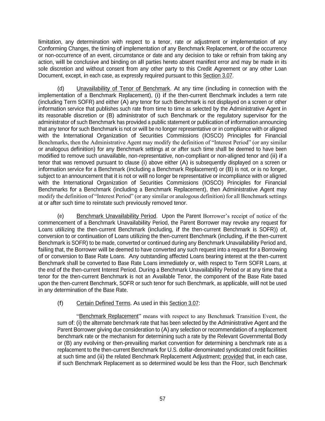 57 limitation, any determination with respect to a tenor, rate or adjustment or implementation of any Conforming Changes, the timing of implementation of any Benchmark Replacement, or of the occurrence or non-occurrence of an event, circumstance or date and any decision to take or refrain from taking any action, will be conclusive and binding on all parties hereto absent manifest error and may be made in its sole discretion and without consent from any other party to this Credit Agreement or any other Loan Document, except, in each case, as expressly required pursuant to this Section 3.07. (d) Unavailability of Tenor of Benchmark. At any time (including in connection with the implementation of a Benchmark Replacement), (i) if the then-current Benchmark includes a term rate (including Term SOFR) and either (A) any tenor for such Benchmark is not displayed on a screen or other information service that publishes such rate from time to time as selected by the Administrative Agent in its reasonable discretion or (B) administrator of such Benchmark or the regulatory supervisor for the administrator of such Benchmark has provided a public statement or publication of information announcing that any tenor for such Benchmark is not or will be no longer representative or in compliance with or aligned with the International Organization of Securities Commissions (IOSCO) Principles for Financial Benchmarks, then the Administrative Agent may modify the definition of “Interest Period” (or any similar or analogous definition) for any Benchmark settings at or after such time shall be deemed to have been modified to remove such unavailable, non-representative, non-compliant or non-aligned tenor and (ii) if a tenor that was removed pursuant to clause (i) above either (A) is subsequently displayed on a screen or information service for a Benchmark (including a Benchmark Replacement) or (B) is not, or is no longer, subject to an announcement that it is not or will no longer be representative or incompliance with or aligned with the International Organization of Securities Commissions (IOSCO) Principles for Financial Benchmarks for a Benchmark (including a Benchmark Replacement), then Administrative Agent may modify the definition of “Interest Period” (or any similar or analogous definition) for all Benchmark settings at or after such time to reinstate such previously removed tenor. (e) Benchmark Unavailability Period. Upon the Parent Borrower’s receipt of notice of the commencement of a Benchmark Unavailability Period, the Parent Borrower may revoke any request for Loans utilizing the then-current Benchmark (including, if the then-current Benchmark is SOFR)) of, conversion to or continuation of Loans utilizing the then-current Benchmark (including, if the then-current Benchmark is SOFR) to be made, converted or continued during any Benchmark Unavailability Period and, failing that, the Borrower will be deemed to have converted any such request into a request for a Borrowing of or conversion to Base Rate Loans. Any outstanding affected Loans bearing interest at the then-current Benchmark shall be converted to Base Rate Loans immediately or, with respect to Term SOFR Loans, at the end of the then-current Interest Period. During a Benchmark Unavailability Period or at any time that a tenor for the then-current Benchmark is not an Available Tenor, the component of the Base Rate based upon the then-current Benchmark, SOFR or such tenor for such Benchmark, as applicable, will not be used in any determination of the Base Rate. (f) Certain Defined Terms. As used in this Section 3.07: “Benchmark Replacement” means with respect to any Benchmark Transition Event, the sum of: (i) the alternate benchmark rate that has been selected by the Administrative Agent and the Parent Borrower giving due consideration to (A) any selection or recommendation of a replacement benchmark rate or the mechanism for determining such a rate by the Relevant Governmental Body or (B) any evolving or then-prevailing market convention for determining a benchmark rate as a replacement to the then-current Benchmark for U.S. dollar-denominated syndicated credit facilities at such time and (ii) the related Benchmark Replacement Adjustment; provided that, in each case, if such Benchmark Replacement as so determined would be less than the Floor, such Benchmark