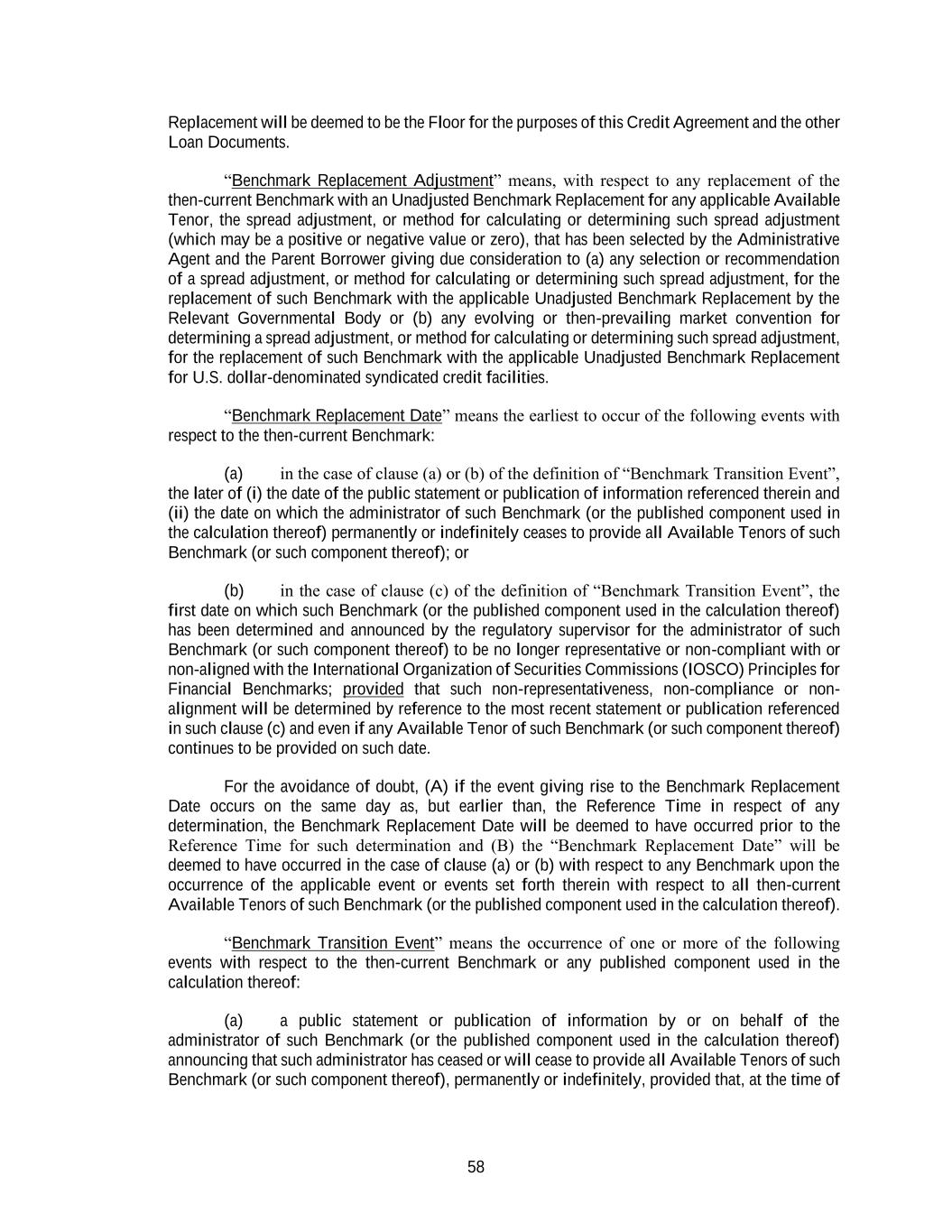58 Replacement will be deemed to be the Floor for the purposes of this Credit Agreement and the other Loan Documents. “Benchmark Replacement Adjustment” means, with respect to any replacement of the then-current Benchmark with an Unadjusted Benchmark Replacement for any applicable Available Tenor, the spread adjustment, or method for calculating or determining such spread adjustment (which may be a positive or negative value or zero), that has been selected by the Administrative Agent and the Parent Borrower giving due consideration to (a) any selection or recommendation of a spread adjustment, or method for calculating or determining such spread adjustment, for the replacement of such Benchmark with the applicable Unadjusted Benchmark Replacement by the Relevant Governmental Body or (b) any evolving or then-prevailing market convention for determining a spread adjustment, or method for calculating or determining such spread adjustment, for the replacement of such Benchmark with the applicable Unadjusted Benchmark Replacement for U.S. dollar-denominated syndicated credit facilities. “Benchmark Replacement Date” means the earliest to occur of the following events with respect to the then-current Benchmark: (a) in the case of clause (a) or (b) of the definition of “Benchmark Transition Event”, the later of (i) the date of the public statement or publication of information referenced therein and (ii) the date on which the administrator of such Benchmark (or the published component used in the calculation thereof) permanently or indefinitely ceases to provide all Available Tenors of such Benchmark (or such component thereof); or (b) in the case of clause (c) of the definition of “Benchmark Transition Event”, the first date on which such Benchmark (or the published component used in the calculation thereof) has been determined and announced by the regulatory supervisor for the administrator of such Benchmark (or such component thereof) to be no longer representative or non-compliant with or non-aligned with the International Organization of Securities Commissions (IOSCO) Principles for Financial Benchmarks; provided that such non-representativeness, non-compliance or non- alignment will be determined by reference to the most recent statement or publication referenced in such clause (c) and even if any Available Tenor of such Benchmark (or such component thereof) continues to be provided on such date. For the avoidance of doubt, (A) if the event giving rise to the Benchmark Replacement Date occurs on the same day as, but earlier than, the Reference Time in respect of any determination, the Benchmark Replacement Date will be deemed to have occurred prior to the Reference Time for such determination and (B) the “Benchmark Replacement Date” will be deemed to have occurred in the case of clause (a) or (b) with respect to any Benchmark upon the occurrence of the applicable event or events set forth therein with respect to all then-current Available Tenors of such Benchmark (or the published component used in the calculation thereof). “Benchmark Transition Event” means the occurrence of one or more of the following events with respect to the then-current Benchmark or any published component used in the calculation thereof: (a) a public statement or publication of information by or on behalf of the administrator of such Benchmark (or the published component used in the calculation thereof) announcing that such administrator has ceased or will cease to provide all Available Tenors of such Benchmark (or such component thereof), permanently or indefinitely, provided that, at the time of