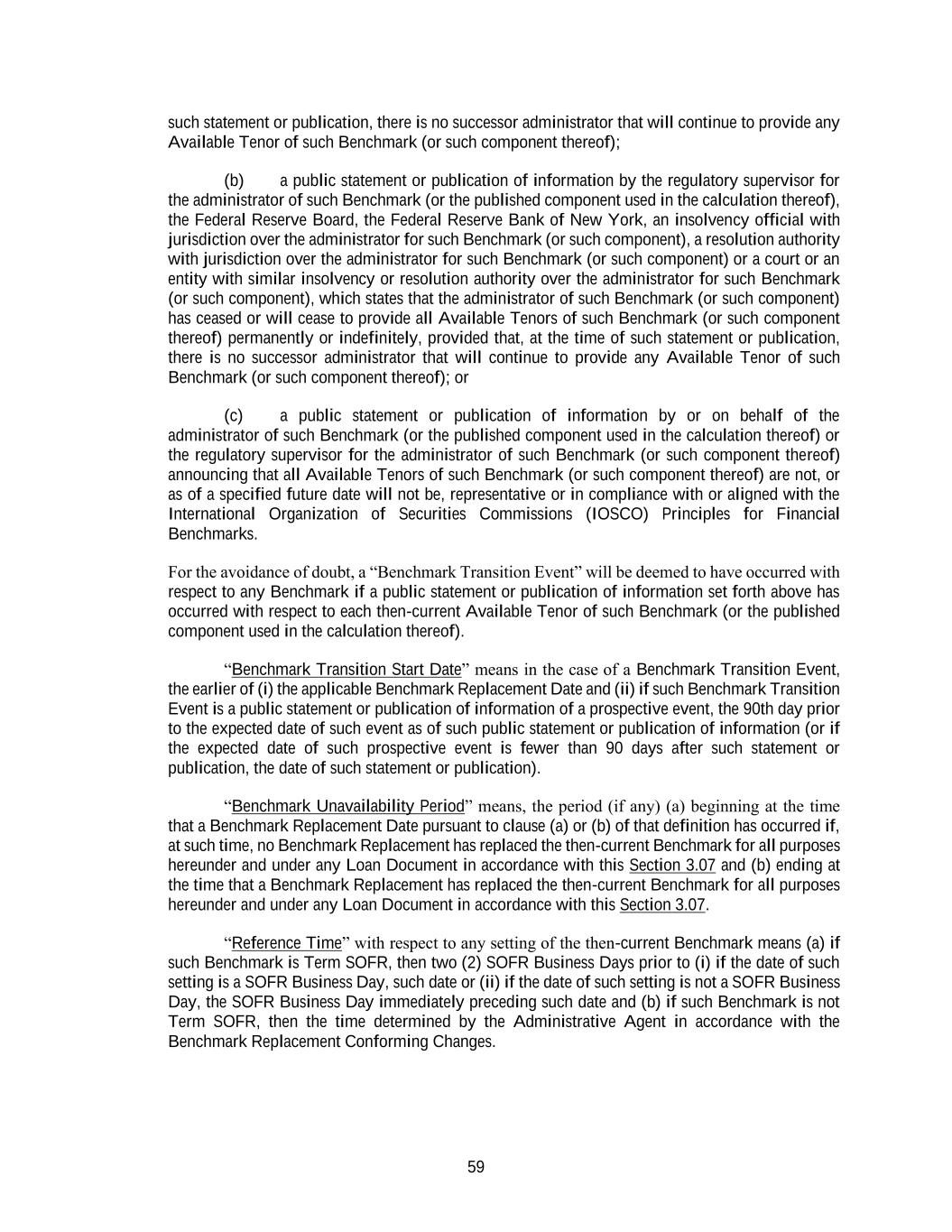 59 such statement or publication, there is no successor administrator that will continue to provide any Available Tenor of such Benchmark (or such component thereof); (b) a public statement or publication of information by the regulatory supervisor for the administrator of such Benchmark (or the published component used in the calculation thereof), the Federal Reserve Board, the Federal Reserve Bank of New York, an insolvency official with jurisdiction over the administrator for such Benchmark (or such component), a resolution authority with jurisdiction over the administrator for such Benchmark (or such component) or a court or an entity with similar insolvency or resolution authority over the administrator for such Benchmark (or such component), which states that the administrator of such Benchmark (or such component) has ceased or will cease to provide all Available Tenors of such Benchmark (or such component thereof) permanently or indefinitely, provided that, at the time of such statement or publication, there is no successor administrator that will continue to provide any Available Tenor of such Benchmark (or such component thereof); or (c) a public statement or publication of information by or on behalf of the administrator of such Benchmark (or the published component used in the calculation thereof) or the regulatory supervisor for the administrator of such Benchmark (or such component thereof) announcing that all Available Tenors of such Benchmark (or such component thereof) are not, or as of a specified future date will not be, representative or in compliance with or aligned with the International Organization of Securities Commissions (IOSCO) Principles for Financial Benchmarks. For the avoidance of doubt, a “Benchmark Transition Event” will be deemed to have occurred with respect to any Benchmark if a public statement or publication of information set forth above has occurred with respect to each then-current Available Tenor of such Benchmark (or the published component used in the calculation thereof). “Benchmark Transition Start Date” means in the case of a Benchmark Transition Event, the earlier of (i) the applicable Benchmark Replacement Date and (ii) if such Benchmark Transition Event is a public statement or publication of information of a prospective event, the 90th day prior to the expected date of such event as of such public statement or publication of information (or if the expected date of such prospective event is fewer than 90 days after such statement or publication, the date of such statement or publication). “Benchmark Unavailability Period” means, the period (if any) (a) beginning at the time that a Benchmark Replacement Date pursuant to clause (a) or (b) of that definition has occurred if, at such time, no Benchmark Replacement has replaced the then-current Benchmark for all purposes hereunder and under any Loan Document in accordance with this Section 3.07 and (b) ending at the time that a Benchmark Replacement has replaced the then-current Benchmark for all purposes hereunder and under any Loan Document in accordance with this Section 3.07. “Reference Time” with respect to any setting of the then-current Benchmark means (a) if such Benchmark is Term SOFR, then two (2) SOFR Business Days prior to (i) if the date of such setting is a SOFR Business Day, such date or (ii) if the date of such setting is not a SOFR Business Day, the SOFR Business Day immediately preceding such date and (b) if such Benchmark is not Term SOFR, then the time determined by the Administrative Agent in accordance with the Benchmark Replacement Conforming Changes.