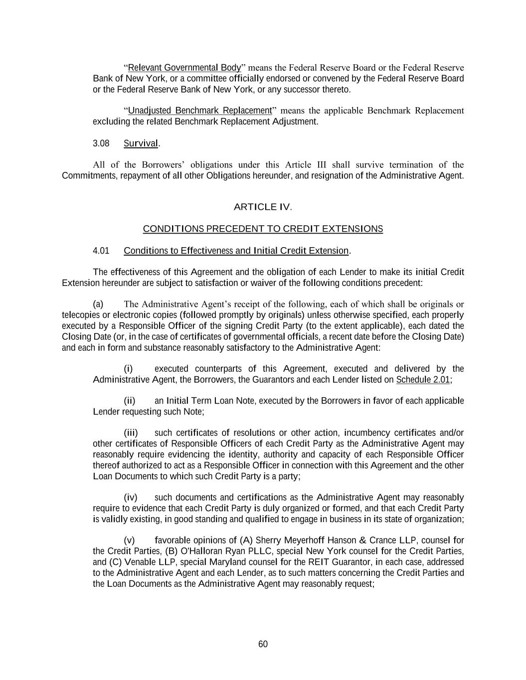 60 “Relevant Governmental Body” means the Federal Reserve Board or the Federal Reserve Bank of New York, or a committee officially endorsed or convened by the Federal Reserve Board or the Federal Reserve Bank of New York, or any successor thereto. “Unadjusted Benchmark Replacement” means the applicable Benchmark Replacement excluding the related Benchmark Replacement Adjustment. 3.08 Survival. All of the Borrowers’ obligations under this Article III shall survive termination of the Commitments, repayment of all other Obligations hereunder, and resignation of the Administrative Agent. ARTICLE IV. CONDITIONS PRECEDENT TO CREDIT EXTENSIONS 4.01 Conditions to Effectiveness and Initial Credit Extension. The effectiveness of this Agreement and the obligation of each Lender to make its initial Credit Extension hereunder are subject to satisfaction or waiver of the following conditions precedent: (a) The Administrative Agent’s receipt of the following, each of which shall be originals or telecopies or electronic copies (followed promptly by originals) unless otherwise specified, each properly executed by a Responsible Officer of the signing Credit Party (to the extent applicable), each dated the Closing Date (or, in the case of certificates of governmental officials, a recent date before the Closing Date) and each in form and substance reasonably satisfactory to the Administrative Agent: (i) executed counterparts of this Agreement, executed and delivered by the Administrative Agent, the Borrowers, the Guarantors and each Lender listed on Schedule 2.01; (ii) an Initial Term Loan Note, executed by the Borrowers in favor of each applicable Lender requesting such Note; (iii) such certificates of resolutions or other action, incumbency certificates and/or other certificates of Responsible Officers of each Credit Party as the Administrative Agent may reasonably require evidencing the identity, authority and capacity of each Responsible Officer thereof authorized to act as a Responsible Officer in connection with this Agreement and the other Loan Documents to which such Credit Party is a party; (iv) such documents and certifications as the Administrative Agent may reasonably require to evidence that each Credit Party is duly organized or formed, and that each Credit Party is validly existing, in good standing and qualified to engage in business in its state of organization; (v) favorable opinions of (A) Sherry Meyerhoff Hanson & Crance LLP, counsel for the Credit Parties, (B) O'Halloran Ryan PLLC, special New York counsel for the Credit Parties, and (C) Venable LLP, special Maryland counsel for the REIT Guarantor, in each case, addressed to the Administrative Agent and each Lender, as to such matters concerning the Credit Parties and the Loan Documents as the Administrative Agent may reasonably request;