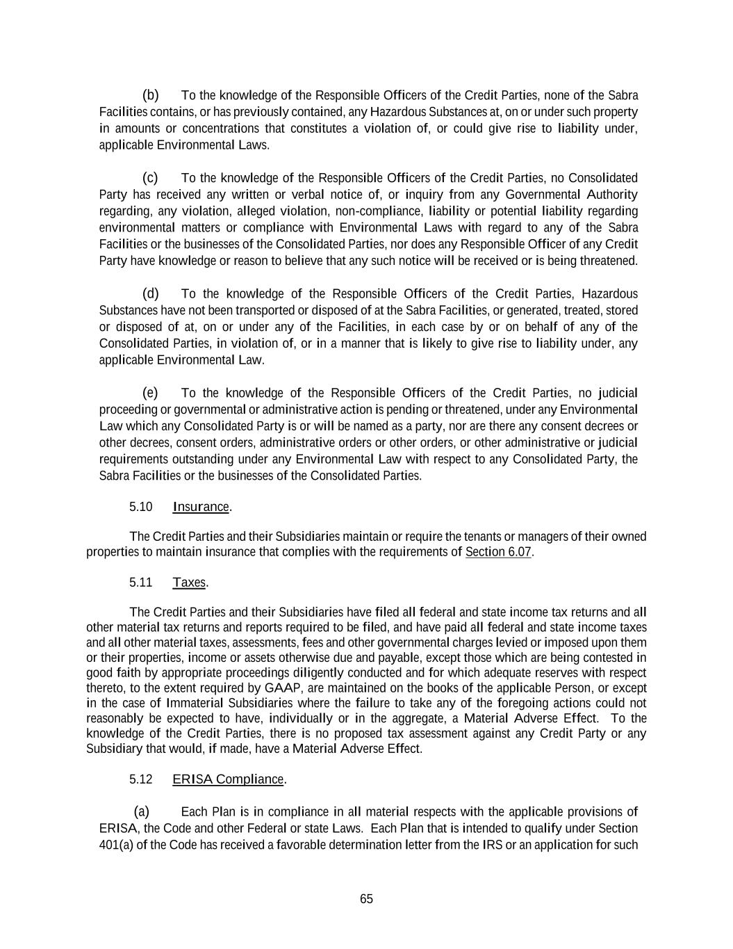 65 (b) To the knowledge of the Responsible Officers of the Credit Parties, none of the Sabra Facilities contains, or has previously contained, any Hazardous Substances at, on or under such property in amounts or concentrations that constitutes a violation of, or could give rise to liability under, applicable Environmental Laws. (c) To the knowledge of the Responsible Officers of the Credit Parties, no Consolidated Party has received any written or verbal notice of, or inquiry from any Governmental Authority regarding, any violation, alleged violation, non-compliance, liability or potential liability regarding environmental matters or compliance with Environmental Laws with regard to any of the Sabra Facilities or the businesses of the Consolidated Parties, nor does any Responsible Officer of any Credit Party have knowledge or reason to believe that any such notice will be received or is being threatened. (d) To the knowledge of the Responsible Officers of the Credit Parties, Hazardous Substances have not been transported or disposed of at the Sabra Facilities, or generated, treated, stored or disposed of at, on or under any of the Facilities, in each case by or on behalf of any of the Consolidated Parties, in violation of, or in a manner that is likely to give rise to liability under, any applicable Environmental Law. (e) To the knowledge of the Responsible Officers of the Credit Parties, no judicial proceeding or governmental or administrative action is pending or threatened, under any Environmental Law which any Consolidated Party is or will be named as a party, nor are there any consent decrees or other decrees, consent orders, administrative orders or other orders, or other administrative or judicial requirements outstanding under any Environmental Law with respect to any Consolidated Party, the Sabra Facilities or the businesses of the Consolidated Parties. 5.10 Insurance. The Credit Parties and their Subsidiaries maintain or require the tenants or managers of their owned properties to maintain insurance that complies with the requirements of Section 6.07. 5.11 Taxes. The Credit Parties and their Subsidiaries have filed all federal and state income tax returns and all other material tax returns and reports required to be filed, and have paid all federal and state income taxes and all other material taxes, assessments, fees and other governmental charges levied or imposed upon them or their properties, income or assets otherwise due and payable, except those which are being contested in good faith by appropriate proceedings diligently conducted and for which adequate reserves with respect thereto, to the extent required by GAAP, are maintained on the books of the applicable Person, or except in the case of Immaterial Subsidiaries where the failure to take any of the foregoing actions could not reasonably be expected to have, individually or in the aggregate, a Material Adverse Effect. To the knowledge of the Credit Parties, there is no proposed tax assessment against any Credit Party or any Subsidiary that would, if made, have a Material Adverse Effect. 5.12 ERISA Compliance. (a) Each Plan is in compliance in all material respects with the applicable provisions of ERISA, the Code and other Federal or state Laws. Each Plan that is intended to qualify under Section 401(a) of the Code has received a favorable determination letter from the IRS or an application for such