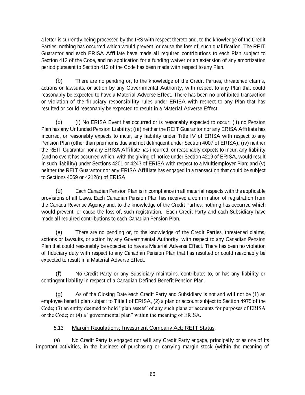 66 a letter is currently being processed by the IRS with respect thereto and, to the knowledge of the Credit Parties, nothing has occurred which would prevent, or cause the loss of, such qualification. The REIT Guarantor and each ERISA Affiliate have made all required contributions to each Plan subject to Section 412 of the Code, and no application for a funding waiver or an extension of any amortization period pursuant to Section 412 of the Code has been made with respect to any Plan. (b) There are no pending or, to the knowledge of the Credit Parties, threatened claims, actions or lawsuits, or action by any Governmental Authority, with respect to any Plan that could reasonably be expected to have a Material Adverse Effect. There has been no prohibited transaction or violation of the fiduciary responsibility rules under ERISA with respect to any Plan that has resulted or could reasonably be expected to result in a Material Adverse Effect. (c) (i) No ERISA Event has occurred or is reasonably expected to occur; (ii) no Pension Plan has any Unfunded Pension Liability; (iii) neither the REIT Guarantor nor any ERISA Affiliate has incurred, or reasonably expects to incur, any liability under Title IV of ERISA with respect to any Pension Plan (other than premiums due and not delinquent under Section 4007 of ERISA); (iv) neither the REIT Guarantor nor any ERISA Affiliate has incurred, or reasonably expects to incur, any liability (and no event has occurred which, with the giving of notice under Section 4219 of ERISA, would result in such liability) under Sections 4201 or 4243 of ERISA with respect to a Multiemployer Plan; and (v) neither the REIT Guarantor nor any ERISA Affiliate has engaged in a transaction that could be subject to Sections 4069 or 4212(c) of ERISA. (d) Each Canadian Pension Plan is in compliance in all material respects with the applicable provisions of all Laws. Each Canadian Pension Plan has received a confirmation of registration from the Canada Revenue Agency and, to the knowledge of the Credit Parties, nothing has occurred which would prevent, or cause the loss of, such registration. Each Credit Party and each Subsidiary have made all required contributions to each Canadian Pension Plan. (e) There are no pending or, to the knowledge of the Credit Parties, threatened claims, actions or lawsuits, or action by any Governmental Authority, with respect to any Canadian Pension Plan that could reasonably be expected to have a Material Adverse Effect. There has been no violation of fiduciary duty with respect to any Canadian Pension Plan that has resulted or could reasonably be expected to result in a Material Adverse Effect. (f) No Credit Party or any Subsidiary maintains, contributes to, or has any liability or contingent liability in respect of a Canadian Defined Benefit Pension Plan. (g) As of the Closing Date each Credit Party and Subsidiary is not and will not be (1) an employee benefit plan subject to Title I of ERISA, (2) a plan or account subject to Section 4975 of the Code; (3) an entity deemed to hold “plan assets” of any such plans or accounts for purposes of ERISA or the Code; or (4) a “governmental plan” within the meaning of ERISA. 5.13 Margin Regulations; Investment Company Act; REIT Status. (a) No Credit Party is engaged nor will any Credit Party engage, principally or as one of its important activities, in the business of purchasing or carrying margin stock (within the meaning of