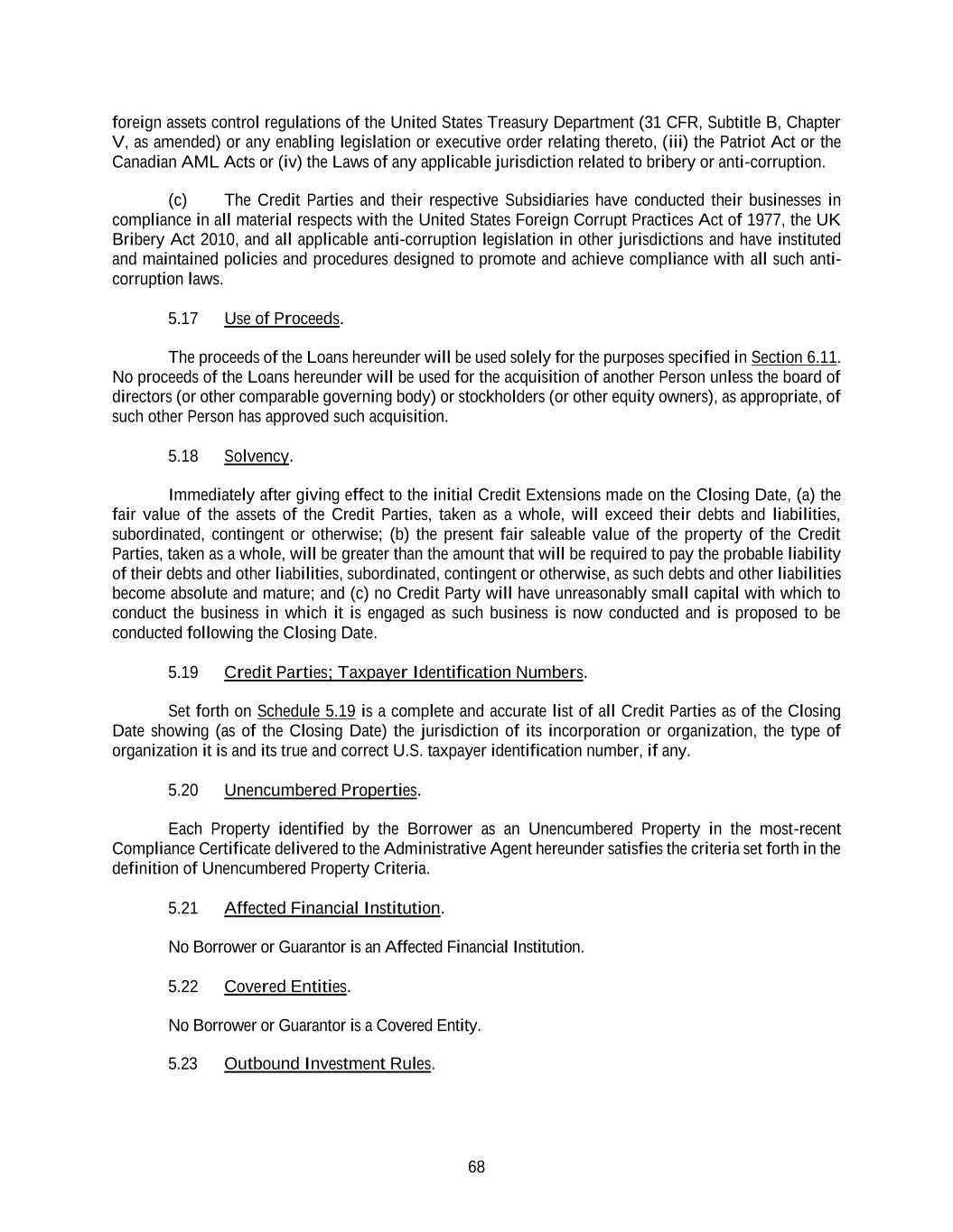 68 foreign assets control regulations of the United States Treasury Department (31 CFR, Subtitle B, Chapter V, as amended) or any enabling legislation or executive order relating thereto, (iii) the Patriot Act or the Canadian AML Acts or (iv) the Laws of any applicable jurisdiction related to bribery or anti-corruption. (c) The Credit Parties and their respective Subsidiaries have conducted their businesses in compliance in all material respects with the United States Foreign Corrupt Practices Act of 1977, the UK Bribery Act 2010, and all applicable anti-corruption legislation in other jurisdictions and have instituted and maintained policies and procedures designed to promote and achieve compliance with all such anti- corruption laws. 5.17 Use of Proceeds. The proceeds of the Loans hereunder will be used solely for the purposes specified in Section 6.11. No proceeds of the Loans hereunder will be used for the acquisition of another Person unless the board of directors (or other comparable governing body) or stockholders (or other equity owners), as appropriate, of such other Person has approved such acquisition. 5.18 Solvency. Immediately after giving effect to the initial Credit Extensions made on the Closing Date, (a) the fair value of the assets of the Credit Parties, taken as a whole, will exceed their debts and liabilities, subordinated, contingent or otherwise; (b) the present fair saleable value of the property of the Credit Parties, taken as a whole, will be greater than the amount that will be required to pay the probable liability of their debts and other liabilities, subordinated, contingent or otherwise, as such debts and other liabilities become absolute and mature; and (c) no Credit Party will have unreasonably small capital with which to conduct the business in which it is engaged as such business is now conducted and is proposed to be conducted following the Closing Date. 5.19 Credit Parties; Taxpayer Identification Numbers. Set forth on Schedule 5.19 is a complete and accurate list of all Credit Parties as of the Closing Date showing (as of the Closing Date) the jurisdiction of its incorporation or organization, the type of organization it is and its true and correct U.S. taxpayer identification number, if any. 5.20 Unencumbered Properties. Each Property identified by the Borrower as an Unencumbered Property in the most-recent Compliance Certificate delivered to the Administrative Agent hereunder satisfies the criteria set forth in the definition of Unencumbered Property Criteria. 5.21 Affected Financial Institution. No Borrower or Guarantor is an Affected Financial Institution. 5.22 Covered Entities. No Borrower or Guarantor is a Covered Entity. 5.23 Outbound Investment Rules.