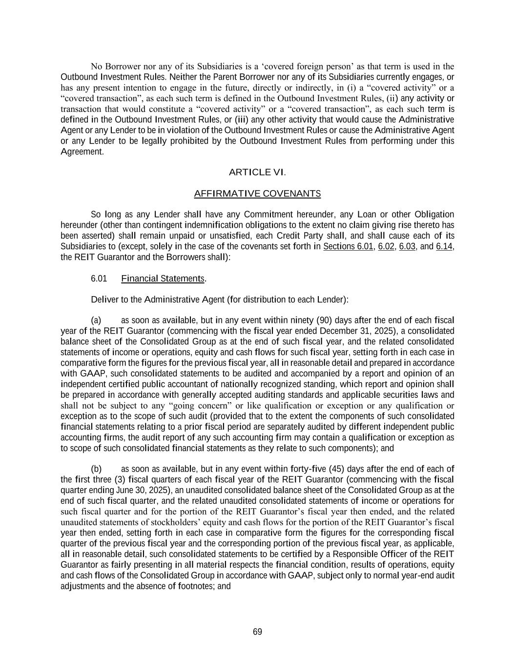 69 No Borrower nor any of its Subsidiaries is a ‘covered foreign person’ as that term is used in the Outbound Investment Rules. Neither the Parent Borrower nor any of its Subsidiaries currently engages, or has any present intention to engage in the future, directly or indirectly, in (i) a “covered activity” or a “covered transaction”, as each such term is defined in the Outbound Investment Rules, (ii) any activity or transaction that would constitute a “covered activity” or a “covered transaction”, as each such term is defined in the Outbound Investment Rules, or (iii) any other activity that would cause the Administrative Agent or any Lender to be in violation of the Outbound Investment Rules or cause the Administrative Agent or any Lender to be legally prohibited by the Outbound Investment Rules from performing under this Agreement. ARTICLE VI. AFFIRMATIVE COVENANTS So long as any Lender shall have any Commitment hereunder, any Loan or other Obligation hereunder (other than contingent indemnification obligations to the extent no claim giving rise thereto has been asserted) shall remain unpaid or unsatisfied, each Credit Party shall, and shall cause each of its Subsidiaries to (except, solely in the case of the covenants set forth in Sections 6.01, 6.02, 6.03, and 6.14, the REIT Guarantor and the Borrowers shall): 6.01 Financial Statements. Deliver to the Administrative Agent (for distribution to each Lender): (a) as soon as available, but in any event within ninety (90) days after the end of each fiscal year of the REIT Guarantor (commencing with the fiscal year ended December 31, 2025), a consolidated balance sheet of the Consolidated Group as at the end of such fiscal year, and the related consolidated statements of income or operations, equity and cash flows for such fiscal year, setting forth in each case in comparative form the figures for the previous fiscal year, all in reasonable detail and prepared in accordance with GAAP, such consolidated statements to be audited and accompanied by a report and opinion of an independent certified public accountant of nationally recognized standing, which report and opinion shall be prepared in accordance with generally accepted auditing standards and applicable securities laws and shall not be subject to any “going concern” or like qualification or exception or any qualification or exception as to the scope of such audit (provided that to the extent the components of such consolidated financial statements relating to a prior fiscal period are separately audited by different independent public accounting firms, the audit report of any such accounting firm may contain a qualification or exception as to scope of such consolidated financial statements as they relate to such components); and (b) as soon as available, but in any event within forty-five (45) days after the end of each of the first three (3) fiscal quarters of each fiscal year of the REIT Guarantor (commencing with the fiscal quarter ending June 30, 2025), an unaudited consolidated balance sheet of the Consolidated Group as at the end of such fiscal quarter, and the related unaudited consolidated statements of income or operations for such fiscal quarter and for the portion of the REIT Guarantor’s fiscal year then ended, and the related unaudited statements of stockholders’ equity and cash flows for the portion of the REIT Guarantor’s fiscal year then ended, setting forth in each case in comparative form the figures for the corresponding fiscal quarter of the previous fiscal year and the corresponding portion of the previous fiscal year, as applicable, all in reasonable detail, such consolidated statements to be certified by a Responsible Officer of the REIT Guarantor as fairly presenting in all material respects the financial condition, results of operations, equity and cash flows of the Consolidated Group in accordance with GAAP, subject only to normal year-end audit adjustments and the absence of footnotes; and