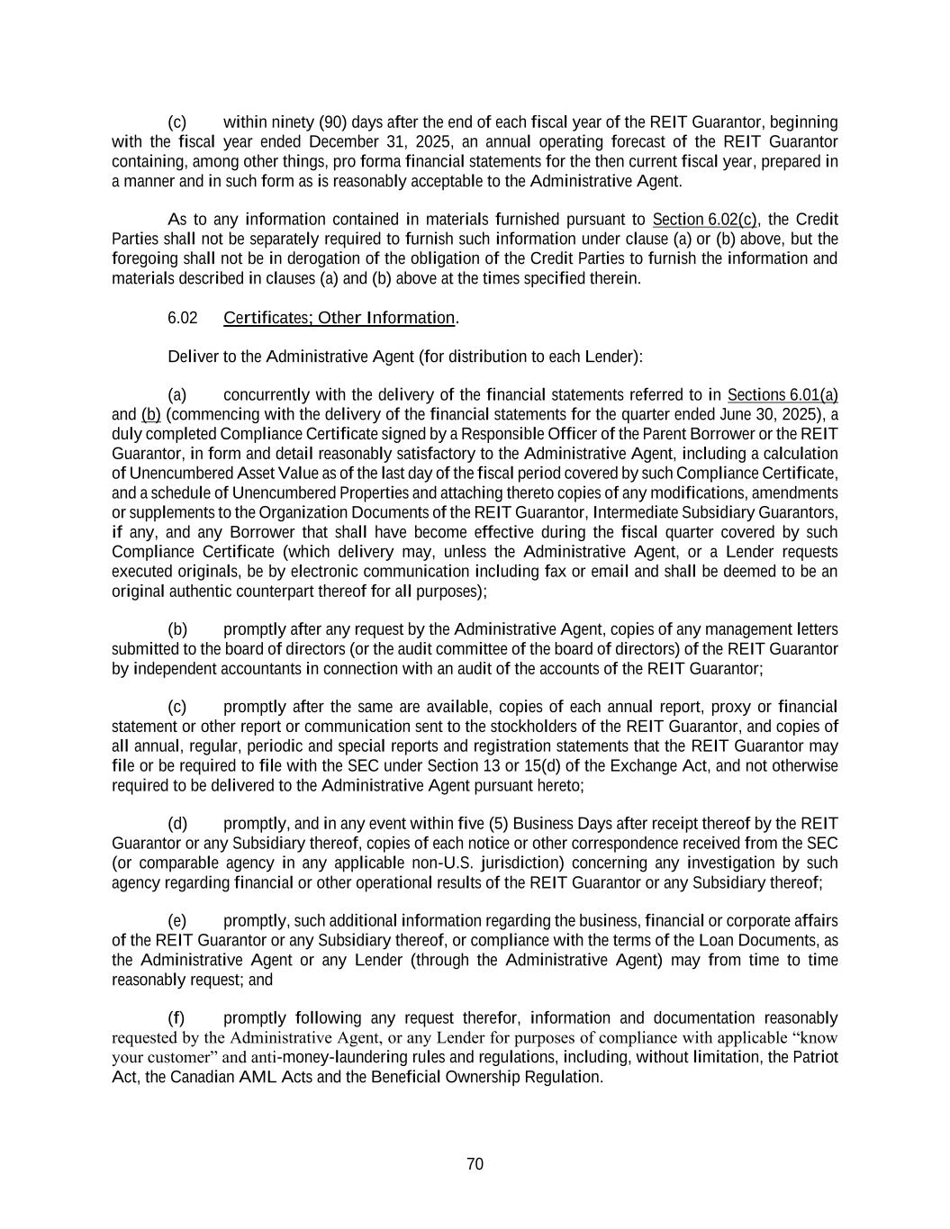 70 (c) within ninety (90) days after the end of each fiscal year of the REIT Guarantor, beginning with the fiscal year ended December 31, 2025, an annual operating forecast of the REIT Guarantor containing, among other things, pro forma financial statements for the then current fiscal year, prepared in a manner and in such form as is reasonably acceptable to the Administrative Agent. As to any information contained in materials furnished pursuant to Section 6.02(c), the Credit Parties shall not be separately required to furnish such information under clause (a) or (b) above, but the foregoing shall not be in derogation of the obligation of the Credit Parties to furnish the information and materials described in clauses (a) and (b) above at the times specified therein. 6.02 Certificates; Other Information. Deliver to the Administrative Agent (for distribution to each Lender): (a) concurrently with the delivery of the financial statements referred to in Sections 6.01(a) and (b) (commencing with the delivery of the financial statements for the quarter ended June 30, 2025), a duly completed Compliance Certificate signed by a Responsible Officer of the Parent Borrower or the REIT Guarantor, in form and detail reasonably satisfactory to the Administrative Agent, including a calculation of Unencumbered Asset Value as of the last day of the fiscal period covered by such Compliance Certificate, and a schedule of Unencumbered Properties and attaching thereto copies of any modifications, amendments or supplements to the Organization Documents of the REIT Guarantor, Intermediate Subsidiary Guarantors, if any, and any Borrower that shall have become effective during the fiscal quarter covered by such Compliance Certificate (which delivery may, unless the Administrative Agent, or a Lender requests executed originals, be by electronic communication including fax or email and shall be deemed to be an original authentic counterpart thereof for all purposes); (b) promptly after any request by the Administrative Agent, copies of any management letters submitted to the board of directors (or the audit committee of the board of directors) of the REIT Guarantor by independent accountants in connection with an audit of the accounts of the REIT Guarantor; (c) promptly after the same are available, copies of each annual report, proxy or financial statement or other report or communication sent to the stockholders of the REIT Guarantor, and copies of all annual, regular, periodic and special reports and registration statements that the REIT Guarantor may file or be required to file with the SEC under Section 13 or 15(d) of the Exchange Act, and not otherwise required to be delivered to the Administrative Agent pursuant hereto; (d) promptly, and in any event within five (5) Business Days after receipt thereof by the REIT Guarantor or any Subsidiary thereof, copies of each notice or other correspondence received from the SEC (or comparable agency in any applicable non-U.S. jurisdiction) concerning any investigation by such agency regarding financial or other operational results of the REIT Guarantor or any Subsidiary thereof; (e) promptly, such additional information regarding the business, financial or corporate affairs of the REIT Guarantor or any Subsidiary thereof, or compliance with the terms of the Loan Documents, as the Administrative Agent or any Lender (through the Administrative Agent) may from time to time reasonably request; and (f) promptly following any request therefor, information and documentation reasonably requested by the Administrative Agent, or any Lender for purposes of compliance with applicable “know your customer” and anti-money-laundering rules and regulations, including, without limitation, the Patriot Act, the Canadian AML Acts and the Beneficial Ownership Regulation.