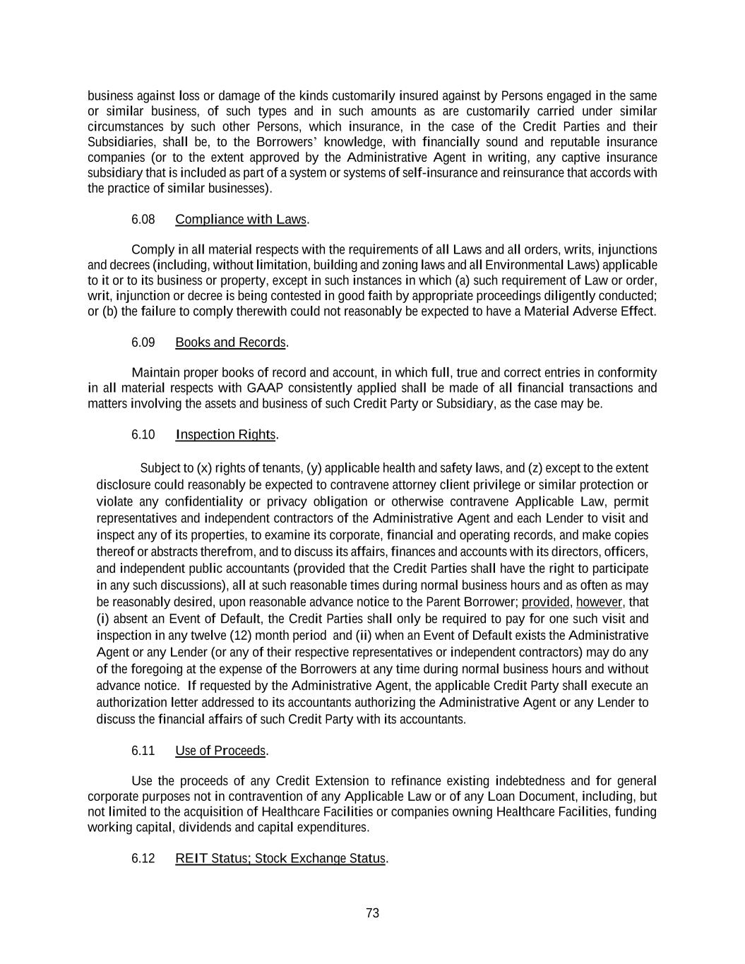 73 business against loss or damage of the kinds customarily insured against by Persons engaged in the same or similar business, of such types and in such amounts as are customarily carried under similar circumstances by such other Persons, which insurance, in the case of the Credit Parties and their Subsidiaries, shall be, to the Borrowers’ knowledge, with financially sound and reputable insurance companies (or to the extent approved by the Administrative Agent in writing, any captive insurance subsidiary that is included as part of a system or systems of self-insurance and reinsurance that accords with the practice of similar businesses). 6.08 Compliance with Laws. Comply in all material respects with the requirements of all Laws and all orders, writs, injunctions and decrees (including, without limitation, building and zoning laws and all Environmental Laws) applicable to it or to its business or property, except in such instances in which (a) such requirement of Law or order, writ, injunction or decree is being contested in good faith by appropriate proceedings diligently conducted; or (b) the failure to comply therewith could not reasonably be expected to have a Material Adverse Effect. 6.09 Books and Records. Maintain proper books of record and account, in which full, true and correct entries in conformity in all material respects with GAAP consistently applied shall be made of all financial transactions and matters involving the assets and business of such Credit Party or Subsidiary, as the case may be. 6.10 Inspection Rights. Subject to (x) rights of tenants, (y) applicable health and safety laws, and (z) except to the extent disclosure could reasonably be expected to contravene attorney client privilege or similar protection or violate any confidentiality or privacy obligation or otherwise contravene Applicable Law, permit representatives and independent contractors of the Administrative Agent and each Lender to visit and inspect any of its properties, to examine its corporate, financial and operating records, and make copies thereof or abstracts therefrom, and to discuss its affairs, finances and accounts with its directors, officers, and independent public accountants (provided that the Credit Parties shall have the right to participate in any such discussions), all at such reasonable times during normal business hours and as often as may be reasonably desired, upon reasonable advance notice to the Parent Borrower; provided, however, that (i) absent an Event of Default, the Credit Parties shall only be required to pay for one such visit and inspection in any twelve (12) month period and (ii) when an Event of Default exists the Administrative Agent or any Lender (or any of their respective representatives or independent contractors) may do any of the foregoing at the expense of the Borrowers at any time during normal business hours and without advance notice. If requested by the Administrative Agent, the applicable Credit Party shall execute an authorization letter addressed to its accountants authorizing the Administrative Agent or any Lender to discuss the financial affairs of such Credit Party with its accountants. 6.11 Use of Proceeds. Use the proceeds of any Credit Extension to refinance existing indebtedness and for general corporate purposes not in contravention of any Applicable Law or of any Loan Document, including, but not limited to the acquisition of Healthcare Facilities or companies owning Healthcare Facilities, funding working capital, dividends and capital expenditures. 6.12 REIT Status; Stock Exchange Status.