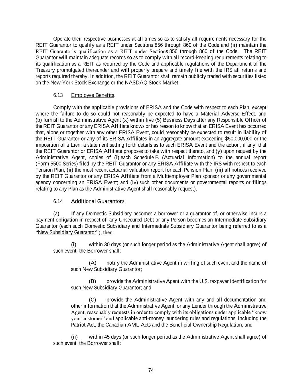 74 Operate their respective businesses at all times so as to satisfy all requirements necessary for the REIT Guarantor to qualify as a REIT under Sections 856 through 860 of the Code and (ii) maintain the REIT Guarantor’s qualification as a REIT under Sections 856 through 860 of the Code. The REIT Guarantor will maintain adequate records so as to comply with all record-keeping requirements relating to its qualification as a REIT as required by the Code and applicable regulations of the Department of the Treasury promulgated thereunder and will properly prepare and timely file with the IRS all returns and reports required thereby. In addition, the REIT Guarantor shall remain publicly traded with securities listed on the New York Stock Exchange or the NASDAQ Stock Market. 6.13 Employee Benefits. Comply with the applicable provisions of ERISA and the Code with respect to each Plan, except where the failure to do so could not reasonably be expected to have a Material Adverse Effect, and (b) furnish to the Administrative Agent (x) within five (5) Business Days after any Responsible Officer of the REIT Guarantor or any ERISA Affiliate knows or has reason to know that an ERISA Event has occurred that, alone or together with any other ERISA Event, could reasonably be expected to result in liability of the REIT Guarantor or any of its ERISA Affiliates in an aggregate amount exceeding $50,000,000 or the imposition of a Lien, a statement setting forth details as to such ERISA Event and the action, if any, that the REIT Guarantor or ERISA Affiliate proposes to take with respect thereto, and (y) upon request by the Administrative Agent, copies of (i) each Schedule B (Actuarial Information) to the annual report (Form 5500 Series) filed by the REIT Guarantor or any ERISA Affiliate with the IRS with respect to each Pension Plan; (ii) the most recent actuarial valuation report for each Pension Plan; (iii) all notices received by the REIT Guarantor or any ERISA Affiliate from a Multiemployer Plan sponsor or any governmental agency concerning an ERISA Event; and (iv) such other documents or governmental reports or filings relating to any Plan as the Administrative Agent shall reasonably request). 6.14 Additional Guarantors. (a) If any Domestic Subsidiary becomes a borrower or a guarantor of, or otherwise incurs a payment obligation in respect of, any Unsecured Debt or any Person becomes an Intermediate Subsidiary Guarantor (each such Domestic Subsidiary and Intermediate Subsidiary Guarantor being referred to as a “New Subsidiary Guarantor”), then: (i) within 30 days (or such longer period as the Administrative Agent shall agree) of such event, the Borrower shall: (A) notify the Administrative Agent in writing of such event and the name of such New Subsidiary Guarantor; (B) provide the Administrative Agent with the U.S. taxpayer identification for such New Subsidiary Guarantor; and (C) provide the Administrative Agent with any and all documentation and other information that the Administrative Agent, or any Lender through the Administrative Agent, reasonably requests in order to comply with its obligations under applicable “know your customer” and applicable anti-money laundering rules and regulations, including the Patriot Act, the Canadian AML Acts and the Beneficial Ownership Regulation; and (ii) within 45 days (or such longer period as the Administrative Agent shall agree) of such event, the Borrower shall: