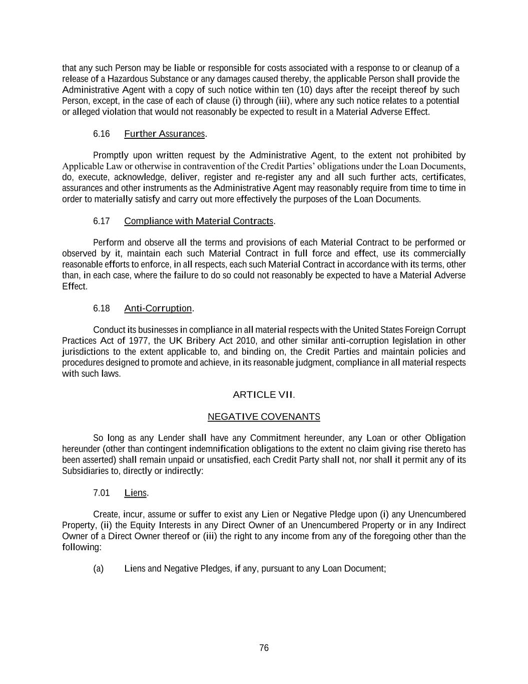 76 that any such Person may be liable or responsible for costs associated with a response to or cleanup of a release of a Hazardous Substance or any damages caused thereby, the applicable Person shall provide the Administrative Agent with a copy of such notice within ten (10) days after the receipt thereof by such Person, except, in the case of each of clause (i) through (iii), where any such notice relates to a potential or alleged violation that would not reasonably be expected to result in a Material Adverse Effect. 6.16 Further Assurances. Promptly upon written request by the Administrative Agent, to the extent not prohibited by Applicable Law or otherwise in contravention of the Credit Parties’ obligations under the Loan Documents, do, execute, acknowledge, deliver, register and re-register any and all such further acts, certificates, assurances and other instruments as the Administrative Agent may reasonably require from time to time in order to materially satisfy and carry out more effectively the purposes of the Loan Documents. 6.17 Compliance with Material Contracts. Perform and observe all the terms and provisions of each Material Contract to be performed or observed by it, maintain each such Material Contract in full force and effect, use its commercially reasonable efforts to enforce, in all respects, each such Material Contract in accordance with its terms, other than, in each case, where the failure to do so could not reasonably be expected to have a Material Adverse Effect. 6.18 Anti-Corruption. Conduct its businesses in compliance in all material respects with the United States Foreign Corrupt Practices Act of 1977, the UK Bribery Act 2010, and other similar anti-corruption legislation in other jurisdictions to the extent applicable to, and binding on, the Credit Parties and maintain policies and procedures designed to promote and achieve, in its reasonable judgment, compliance in all material respects with such laws. ARTICLE VII. NEGATIVE COVENANTS So long as any Lender shall have any Commitment hereunder, any Loan or other Obligation hereunder (other than contingent indemnification obligations to the extent no claim giving rise thereto has been asserted) shall remain unpaid or unsatisfied, each Credit Party shall not, nor shall it permit any of its Subsidiaries to, directly or indirectly: 7.01 Liens. Create, incur, assume or suffer to exist any Lien or Negative Pledge upon (i) any Unencumbered Property, (ii) the Equity Interests in any Direct Owner of an Unencumbered Property or in any Indirect Owner of a Direct Owner thereof or (iii) the right to any income from any of the foregoing other than the following: (a) Liens and Negative Pledges, if any, pursuant to any Loan Document;
