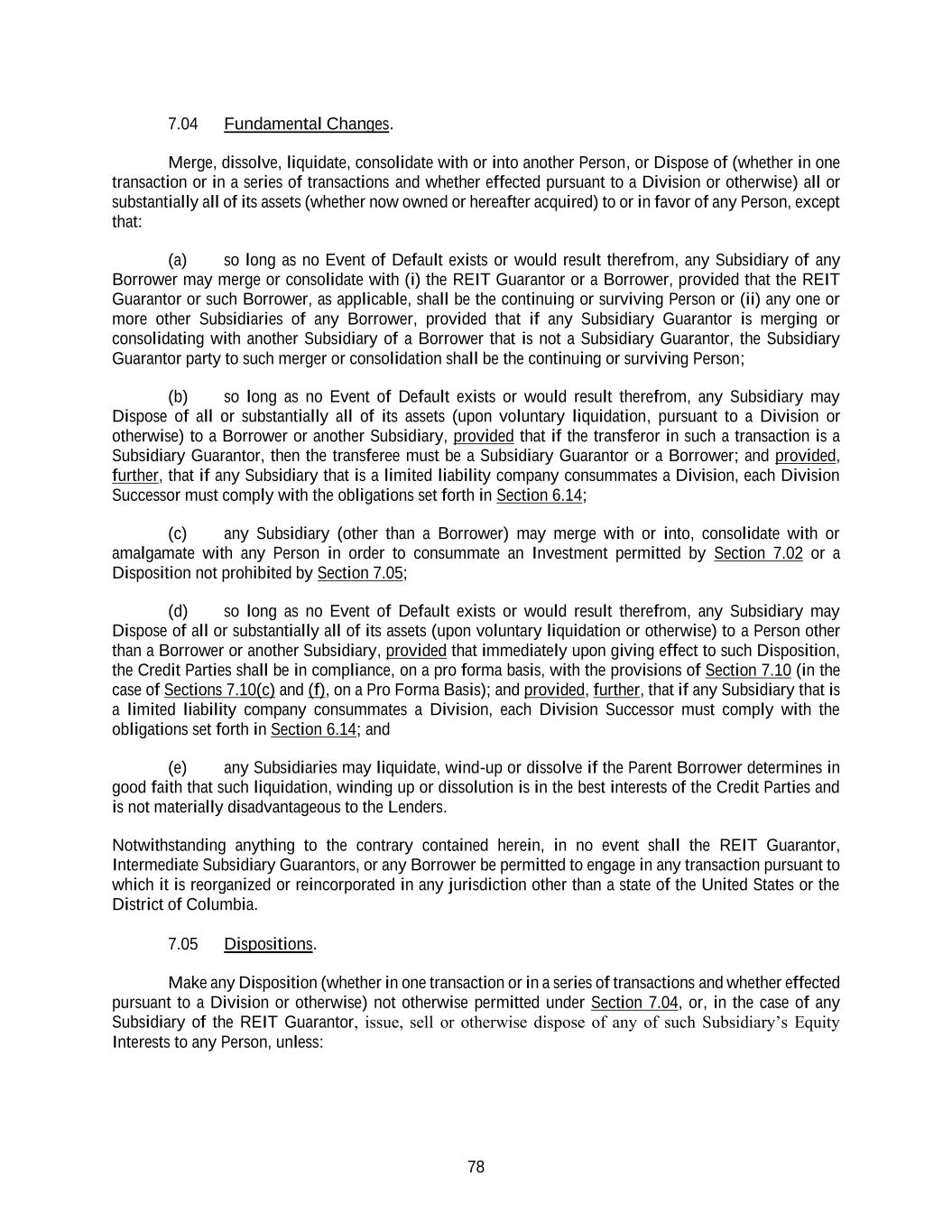 78 7.04 Fundamental Changes. Merge, dissolve, liquidate, consolidate with or into another Person, or Dispose of (whether in one transaction or in a series of transactions and whether effected pursuant to a Division or otherwise) all or substantially all of its assets (whether now owned or hereafter acquired) to or in favor of any Person, except that: (a) so long as no Event of Default exists or would result therefrom, any Subsidiary of any Borrower may merge or consolidate with (i) the REIT Guarantor or a Borrower, provided that the REIT Guarantor or such Borrower, as applicable, shall be the continuing or surviving Person or (ii) any one or more other Subsidiaries of any Borrower, provided that if any Subsidiary Guarantor is merging or consolidating with another Subsidiary of a Borrower that is not a Subsidiary Guarantor, the Subsidiary Guarantor party to such merger or consolidation shall be the continuing or surviving Person; (b) so long as no Event of Default exists or would result therefrom, any Subsidiary may Dispose of all or substantially all of its assets (upon voluntary liquidation, pursuant to a Division or otherwise) to a Borrower or another Subsidiary, provided that if the transferor in such a transaction is a Subsidiary Guarantor, then the transferee must be a Subsidiary Guarantor or a Borrower; and provided, further, that if any Subsidiary that is a limited liability company consummates a Division, each Division Successor must comply with the obligations set forth in Section 6.14; (c) any Subsidiary (other than a Borrower) may merge with or into, consolidate with or amalgamate with any Person in order to consummate an Investment permitted by Section 7.02 or a Disposition not prohibited by Section 7.05; (d) so long as no Event of Default exists or would result therefrom, any Subsidiary may Dispose of all or substantially all of its assets (upon voluntary liquidation or otherwise) to a Person other than a Borrower or another Subsidiary, provided that immediately upon giving effect to such Disposition, the Credit Parties shall be in compliance, on a pro forma basis, with the provisions of Section 7.10 (in the case of Sections 7.10(c) and (f), on a Pro Forma Basis); and provided, further, that if any Subsidiary that is a limited liability company consummates a Division, each Division Successor must comply with the obligations set forth in Section 6.14; and (e) any Subsidiaries may liquidate, wind-up or dissolve if the Parent Borrower determines in good faith that such liquidation, winding up or dissolution is in the best interests of the Credit Parties and is not materially disadvantageous to the Lenders. Notwithstanding anything to the contrary contained herein, in no event shall the REIT Guarantor, Intermediate Subsidiary Guarantors, or any Borrower be permitted to engage in any transaction pursuant to which it is reorganized or reincorporated in any jurisdiction other than a state of the United States or the District of Columbia. 7.05 Dispositions. Make any Disposition (whether in one transaction or in a series of transactions and whether effected pursuant to a Division or otherwise) not otherwise permitted under Section 7.04, or, in the case of any Subsidiary of the REIT Guarantor, issue, sell or otherwise dispose of any of such Subsidiary’s Equity Interests to any Person, unless: