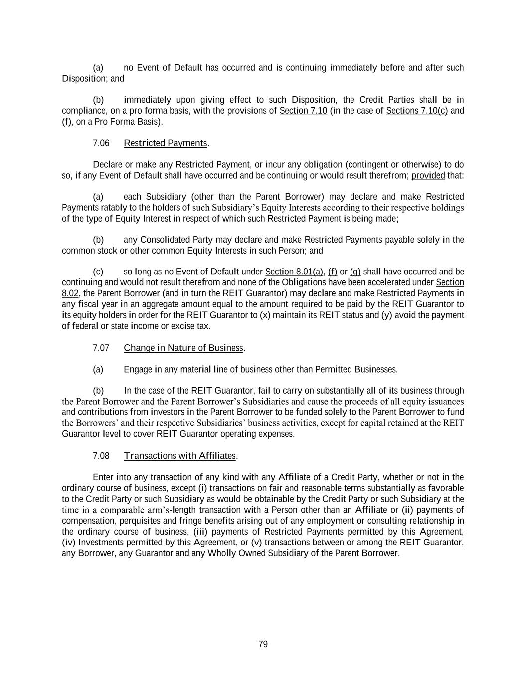 79 (a) no Event of Default has occurred and is continuing immediately before and after such Disposition; and (b) immediately upon giving effect to such Disposition, the Credit Parties shall be in compliance, on a pro forma basis, with the provisions of Section 7.10 (in the case of Sections 7.10(c) and (f), on a Pro Forma Basis). 7.06 Restricted Payments. Declare or make any Restricted Payment, or incur any obligation (contingent or otherwise) to do so, if any Event of Default shall have occurred and be continuing or would result therefrom; provided that: (a) each Subsidiary (other than the Parent Borrower) may declare and make Restricted Payments ratably to the holders of such Subsidiary’s Equity Interests according to their respective holdings of the type of Equity Interest in respect of which such Restricted Payment is being made; (b) any Consolidated Party may declare and make Restricted Payments payable solely in the common stock or other common Equity Interests in such Person; and (c) so long as no Event of Default under Section 8.01(a), (f) or (g) shall have occurred and be continuing and would not result therefrom and none of the Obligations have been accelerated under Section 8.02, the Parent Borrower (and in turn the REIT Guarantor) may declare and make Restricted Payments in any fiscal year in an aggregate amount equal to the amount required to be paid by the REIT Guarantor to its equity holders in order for the REIT Guarantor to (x) maintain its REIT status and (y) avoid the payment of federal or state income or excise tax. 7.07 Change in Nature of Business. (a) Engage in any material line of business other than Permitted Businesses. (b) In the case of the REIT Guarantor, fail to carry on substantially all of its business through the Parent Borrower and the Parent Borrower’s Subsidiaries and cause the proceeds of all equity issuances and contributions from investors in the Parent Borrower to be funded solely to the Parent Borrower to fund the Borrowers’ and their respective Subsidiaries’ business activities, except for capital retained at the REIT Guarantor level to cover REIT Guarantor operating expenses. 7.08 Transactions with Affiliates. Enter into any transaction of any kind with any Affiliate of a Credit Party, whether or not in the ordinary course of business, except (i) transactions on fair and reasonable terms substantially as favorable to the Credit Party or such Subsidiary as would be obtainable by the Credit Party or such Subsidiary at the time in a comparable arm’s-length transaction with a Person other than an Affiliate or (ii) payments of compensation, perquisites and fringe benefits arising out of any employment or consulting relationship in the ordinary course of business, (iii) payments of Restricted Payments permitted by this Agreement, (iv) Investments permitted by this Agreement, or (v) transactions between or among the REIT Guarantor, any Borrower, any Guarantor and any Wholly Owned Subsidiary of the Parent Borrower.