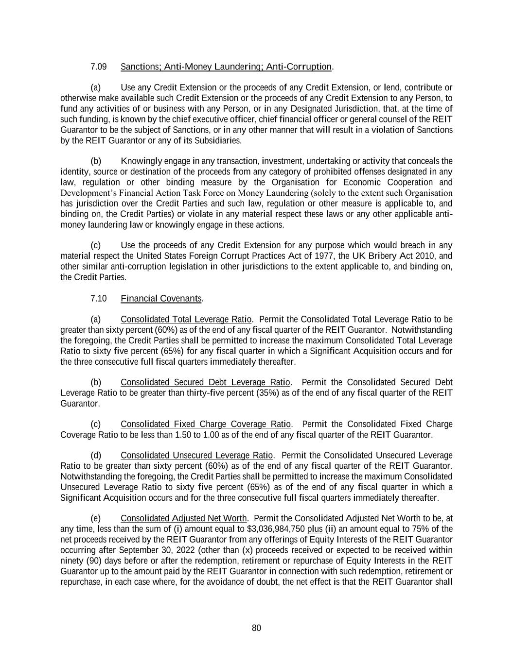 80 7.09 Sanctions; Anti-Money Laundering; Anti-Corruption. (a) Use any Credit Extension or the proceeds of any Credit Extension, or lend, contribute or otherwise make available such Credit Extension or the proceeds of any Credit Extension to any Person, to fund any activities of or business with any Person, or in any Designated Jurisdiction, that, at the time of such funding, is known by the chief executive officer, chief financial officer or general counsel of the REIT Guarantor to be the subject of Sanctions, or in any other manner that will result in a violation of Sanctions by the REIT Guarantor or any of its Subsidiaries. (b) Knowingly engage in any transaction, investment, undertaking or activity that conceals the identity, source or destination of the proceeds from any category of prohibited offenses designated in any law, regulation or other binding measure by the Organisation for Economic Cooperation and Development’s Financial Action Task Force on Money Laundering (solely to the extent such Organisation has jurisdiction over the Credit Parties and such law, regulation or other measure is applicable to, and binding on, the Credit Parties) or violate in any material respect these laws or any other applicable anti- money laundering law or knowingly engage in these actions. (c) Use the proceeds of any Credit Extension for any purpose which would breach in any material respect the United States Foreign Corrupt Practices Act of 1977, the UK Bribery Act 2010, and other similar anti-corruption legislation in other jurisdictions to the extent applicable to, and binding on, the Credit Parties. 7.10 Financial Covenants. (a) Consolidated Total Leverage Ratio. Permit the Consolidated Total Leverage Ratio to be greater than sixty percent (60%) as of the end of any fiscal quarter of the REIT Guarantor. Notwithstanding the foregoing, the Credit Parties shall be permitted to increase the maximum Consolidated Total Leverage Ratio to sixty five percent (65%) for any fiscal quarter in which a Significant Acquisition occurs and for the three consecutive full fiscal quarters immediately thereafter. (b) Consolidated Secured Debt Leverage Ratio. Permit the Consolidated Secured Debt Leverage Ratio to be greater than thirty-five percent (35%) as of the end of any fiscal quarter of the REIT Guarantor. (c) Consolidated Fixed Charge Coverage Ratio. Permit the Consolidated Fixed Charge Coverage Ratio to be less than 1.50 to 1.00 as of the end of any fiscal quarter of the REIT Guarantor. (d) Consolidated Unsecured Leverage Ratio. Permit the Consolidated Unsecured Leverage Ratio to be greater than sixty percent (60%) as of the end of any fiscal quarter of the REIT Guarantor. Notwithstanding the foregoing, the Credit Parties shall be permitted to increase the maximum Consolidated Unsecured Leverage Ratio to sixty five percent (65%) as of the end of any fiscal quarter in which a Significant Acquisition occurs and for the three consecutive full fiscal quarters immediately thereafter. (e) Consolidated Adjusted Net Worth. Permit the Consolidated Adjusted Net Worth to be, at any time, less than the sum of (i) amount equal to $3,036,984,750 plus (ii) an amount equal to 75% of the net proceeds received by the REIT Guarantor from any offerings of Equity Interests of the REIT Guarantor occurring after September 30, 2022 (other than (x) proceeds received or expected to be received within ninety (90) days before or after the redemption, retirement or repurchase of Equity Interests in the REIT Guarantor up to the amount paid by the REIT Guarantor in connection with such redemption, retirement or repurchase, in each case where, for the avoidance of doubt, the net effect is that the REIT Guarantor shall