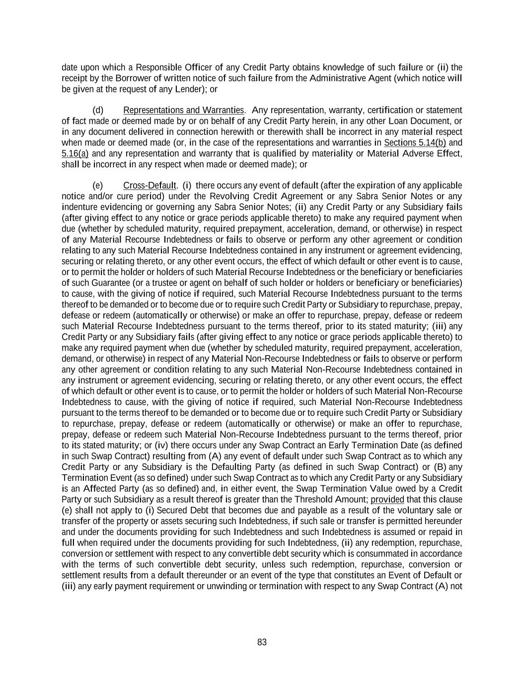 83 date upon which a Responsible Officer of any Credit Party obtains knowledge of such failure or (ii) the receipt by the Borrower of written notice of such failure from the Administrative Agent (which notice will be given at the request of any Lender); or (d) Representations and Warranties. Any representation, warranty, certification or statement of fact made or deemed made by or on behalf of any Credit Party herein, in any other Loan Document, or in any document delivered in connection herewith or therewith shall be incorrect in any material respect when made or deemed made (or, in the case of the representations and warranties in Sections 5.14(b) and 5.16(a) and any representation and warranty that is qualified by materiality or Material Adverse Effect, shall be incorrect in any respect when made or deemed made); or (e) Cross-Default. (i) there occurs any event of default (after the expiration of any applicable notice and/or cure period) under the Revolving Credit Agreement or any Sabra Senior Notes or any indenture evidencing or governing any Sabra Senior Notes; (ii) any Credit Party or any Subsidiary fails (after giving effect to any notice or grace periods applicable thereto) to make any required payment when due (whether by scheduled maturity, required prepayment, acceleration, demand, or otherwise) in respect of any Material Recourse Indebtedness or fails to observe or perform any other agreement or condition relating to any such Material Recourse Indebtedness contained in any instrument or agreement evidencing, securing or relating thereto, or any other event occurs, the effect of which default or other event is to cause, or to permit the holder or holders of such Material Recourse Indebtedness or the beneficiary or beneficiaries of such Guarantee (or a trustee or agent on behalf of such holder or holders or beneficiary or beneficiaries) to cause, with the giving of notice if required, such Material Recourse Indebtedness pursuant to the terms thereof to be demanded or to become due or to require such Credit Party or Subsidiary to repurchase, prepay, defease or redeem (automatically or otherwise) or make an offer to repurchase, prepay, defease or redeem such Material Recourse Indebtedness pursuant to the terms thereof, prior to its stated maturity; (iii) any Credit Party or any Subsidiary fails (after giving effect to any notice or grace periods applicable thereto) to make any required payment when due (whether by scheduled maturity, required prepayment, acceleration, demand, or otherwise) in respect of any Material Non-Recourse Indebtedness or fails to observe or perform any other agreement or condition relating to any such Material Non-Recourse Indebtedness contained in any instrument or agreement evidencing, securing or relating thereto, or any other event occurs, the effect of which default or other event is to cause, or to permit the holder or holders of such Material Non-Recourse Indebtedness to cause, with the giving of notice if required, such Material Non-Recourse Indebtedness pursuant to the terms thereof to be demanded or to become due or to require such Credit Party or Subsidiary to repurchase, prepay, defease or redeem (automatically or otherwise) or make an offer to repurchase, prepay, defease or redeem such Material Non-Recourse Indebtedness pursuant to the terms thereof, prior to its stated maturity; or (iv) there occurs under any Swap Contract an Early Termination Date (as defined in such Swap Contract) resulting from (A) any event of default under such Swap Contract as to which any Credit Party or any Subsidiary is the Defaulting Party (as defined in such Swap Contract) or (B) any Termination Event (as so defined) under such Swap Contract as to which any Credit Party or any Subsidiary is an Affected Party (as so defined) and, in either event, the Swap Termination Value owed by a Credit Party or such Subsidiary as a result thereof is greater than the Threshold Amount; provided that this clause (e) shall not apply to (i) Secured Debt that becomes due and payable as a result of the voluntary sale or transfer of the property or assets securing such Indebtedness, if such sale or transfer is permitted hereunder and under the documents providing for such Indebtedness and such Indebtedness is assumed or repaid in full when required under the documents providing for such Indebtedness, (ii) any redemption, repurchase, conversion or settlement with respect to any convertible debt security which is consummated in accordance with the terms of such convertible debt security, unless such redemption, repurchase, conversion or settlement results from a default thereunder or an event of the type that constitutes an Event of Default or (iii) any early payment requirement or unwinding or termination with respect to any Swap Contract (A) not
