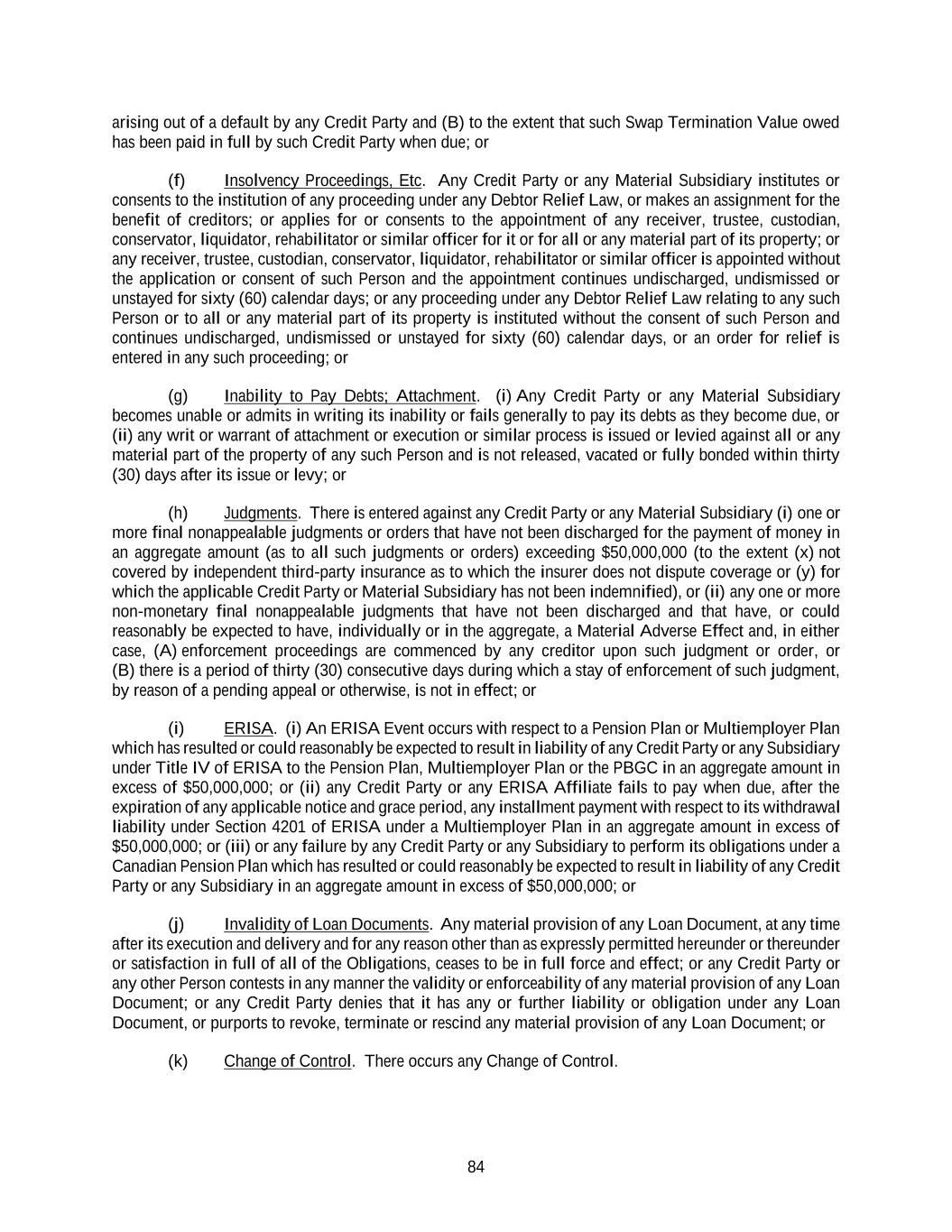 84 arising out of a default by any Credit Party and (B) to the extent that such Swap Termination Value owed has been paid in full by such Credit Party when due; or (f) Insolvency Proceedings, Etc. Any Credit Party or any Material Subsidiary institutes or consents to the institution of any proceeding under any Debtor Relief Law, or makes an assignment for the benefit of creditors; or applies for or consents to the appointment of any receiver, trustee, custodian, conservator, liquidator, rehabilitator or similar officer for it or for all or any material part of its property; or any receiver, trustee, custodian, conservator, liquidator, rehabilitator or similar officer is appointed without the application or consent of such Person and the appointment continues undischarged, undismissed or unstayed for sixty (60) calendar days; or any proceeding under any Debtor Relief Law relating to any such Person or to all or any material part of its property is instituted without the consent of such Person and continues undischarged, undismissed or unstayed for sixty (60) calendar days, or an order for relief is entered in any such proceeding; or (g) Inability to Pay Debts; Attachment. (i) Any Credit Party or any Material Subsidiary becomes unable or admits in writing its inability or fails generally to pay its debts as they become due, or (ii) any writ or warrant of attachment or execution or similar process is issued or levied against all or any material part of the property of any such Person and is not released, vacated or fully bonded within thirty (30) days after its issue or levy; or (h) Judgments. There is entered against any Credit Party or any Material Subsidiary (i) one or more final nonappealable judgments or orders that have not been discharged for the payment of money in an aggregate amount (as to all such judgments or orders) exceeding $50,000,000 (to the extent (x) not covered by independent third-party insurance as to which the insurer does not dispute coverage or (y) for which the applicable Credit Party or Material Subsidiary has not been indemnified), or (ii) any one or more non-monetary final nonappealable judgments that have not been discharged and that have, or could reasonably be expected to have, individually or in the aggregate, a Material Adverse Effect and, in either case, (A) enforcement proceedings are commenced by any creditor upon such judgment or order, or (B) there is a period of thirty (30) consecutive days during which a stay of enforcement of such judgment, by reason of a pending appeal or otherwise, is not in effect; or (i) ERISA. (i) An ERISA Event occurs with respect to a Pension Plan or Multiemployer Plan which has resulted or could reasonably be expected to result in liability of any Credit Party or any Subsidiary under Title IV of ERISA to the Pension Plan, Multiemployer Plan or the PBGC in an aggregate amount in excess of $50,000,000; or (ii) any Credit Party or any ERISA Affiliate fails to pay when due, after the expiration of any applicable notice and grace period, any installment payment with respect to its withdrawal liability under Section 4201 of ERISA under a Multiemployer Plan in an aggregate amount in excess of $50,000,000; or (iii) or any failure by any Credit Party or any Subsidiary to perform its obligations under a Canadian Pension Plan which has resulted or could reasonably be expected to result in liability of any Credit Party or any Subsidiary in an aggregate amount in excess of $50,000,000; or (j) Invalidity of Loan Documents. Any material provision of any Loan Document, at any time after its execution and delivery and for any reason other than as expressly permitted hereunder or thereunder or satisfaction in full of all of the Obligations, ceases to be in full force and effect; or any Credit Party or any other Person contests in any manner the validity or enforceability of any material provision of any Loan Document; or any Credit Party denies that it has any or further liability or obligation under any Loan Document, or purports to revoke, terminate or rescind any material provision of any Loan Document; or (k) Change of Control. There occurs any Change of Control.