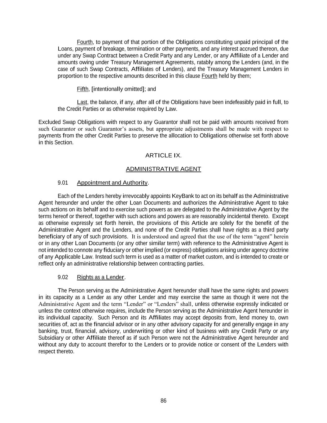 86 Fourth, to payment of that portion of the Obligations constituting unpaid principal of the Loans, payment of breakage, termination or other payments, and any interest accrued thereon, due under any Swap Contract between a Credit Party and any Lender, or any Affiliate of a Lender and amounts owing under Treasury Management Agreements, ratably among the Lenders (and, in the case of such Swap Contracts, Affiliates of Lenders), and the Treasury Management Lenders in proportion to the respective amounts described in this clause Fourth held by them; Fifth, [intentionally omitted]; and Last, the balance, if any, after all of the Obligations have been indefeasibly paid in full, to the Credit Parties or as otherwise required by Law. Excluded Swap Obligations with respect to any Guarantor shall not be paid with amounts received from such Guarantor or such Guarantor’s assets, but appropriate adjustments shall be made with respect to payments from the other Credit Parties to preserve the allocation to Obligations otherwise set forth above in this Section. ARTICLE IX. ADMINISTRATIVE AGENT 9.01 Appointment and Authority. Each of the Lenders hereby irrevocably appoints KeyBank to act on its behalf as the Administrative Agent hereunder and under the other Loan Documents and authorizes the Administrative Agent to take such actions on its behalf and to exercise such powers as are delegated to the Administrative Agent by the terms hereof or thereof, together with such actions and powers as are reasonably incidental thereto. Except as otherwise expressly set forth herein, the provisions of this Article are solely for the benefit of the Administrative Agent and the Lenders, and none of the Credit Parties shall have rights as a third party beneficiary of any of such provisions. It is understood and agreed that the use of the term “agent” herein or in any other Loan Documents (or any other similar term) with reference to the Administrative Agent is not intended to connote any fiduciary or other implied (or express) obligations arising under agency doctrine of any Applicable Law. Instead such term is used as a matter of market custom, and is intended to create or reflect only an administrative relationship between contracting parties. 9.02 Rights as a Lender. The Person serving as the Administrative Agent hereunder shall have the same rights and powers in its capacity as a Lender as any other Lender and may exercise the same as though it were not the Administrative Agent and the term “Lender” or “Lenders” shall, unless otherwise expressly indicated or unless the context otherwise requires, include the Person serving as the Administrative Agent hereunder in its individual capacity. Such Person and its Affiliates may accept deposits from, lend money to, own securities of, act as the financial advisor or in any other advisory capacity for and generally engage in any banking, trust, financial, advisory, underwriting or other kind of business with any Credit Party or any Subsidiary or other Affiliate thereof as if such Person were not the Administrative Agent hereunder and without any duty to account therefor to the Lenders or to provide notice or consent of the Lenders with respect thereto.