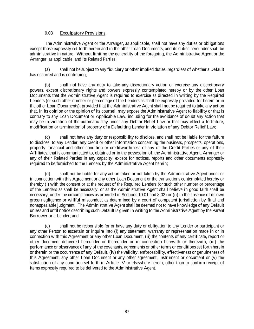 87 9.03 Exculpatory Provisions. The Administrative Agent or the Arranger, as applicable, shall not have any duties or obligations except those expressly set forth herein and in the other Loan Documents, and its duties hereunder shall be administrative in nature. Without limiting the generality of the foregoing, the Administrative Agent or the Arranger, as applicable, and its Related Parties: (a) shall not be subject to any fiduciary or other implied duties, regardless of whether a Default has occurred and is continuing; (b) shall not have any duty to take any discretionary action or exercise any discretionary powers, except discretionary rights and powers expressly contemplated hereby or by the other Loan Documents that the Administrative Agent is required to exercise as directed in writing by the Required Lenders (or such other number or percentage of the Lenders as shall be expressly provided for herein or in the other Loan Documents), provided that the Administrative Agent shall not be required to take any action that, in its opinion or the opinion of its counsel, may expose the Administrative Agent to liability or that is contrary to any Loan Document or Applicable Law, including for the avoidance of doubt any action that may be in violation of the automatic stay under any Debtor Relief Law or that may effect a forfeiture, modification or termination of property of a Defaulting Lender in violation of any Debtor Relief Law; (c) shall not have any duty or responsibility to disclose, and shall not be liable for the failure to disclose, to any Lender, any credit or other information concerning the business, prospects, operations, property, financial and other condition or creditworthiness of any of the Credit Parties or any of their Affiliates, that is communicated to, obtained or in the possession of, the Administrative Agent, Arranger or any of their Related Parties in any capacity, except for notices, reports and other documents expressly required to be furnished to the Lenders by the Administrative Agent herein; (d) shall not be liable for any action taken or not taken by the Administrative Agent under or in connection with this Agreement or any other Loan Document or the transactions contemplated hereby or thereby (i) with the consent or at the request of the Required Lenders (or such other number or percentage of the Lenders as shall be necessary, or as the Administrative Agent shall believe in good faith shall be necessary, under the circumstances as provided in Sections 10.01 and 8.02) or (ii) in the absence of its own gross negligence or willful misconduct as determined by a court of competent jurisdiction by final and nonappealable judgment. The Administrative Agent shall be deemed not to have knowledge of any Default unless and until notice describing such Default is given in writing to the Administrative Agent by the Parent Borrower or a Lender; and (e) shall not be responsible for or have any duty or obligation to any Lender or participant or any other Person to ascertain or inquire into (i) any statement, warranty or representation made in or in connection with this Agreement or any other Loan Document, (ii) the contents of any certificate, report or other document delivered hereunder or thereunder or in connection herewith or therewith, (iii) the performance or observance of any of the covenants, agreements or other terms or conditions set forth herein or therein or the occurrence of any Default, (iv) the validity, enforceability, effectiveness or genuineness of this Agreement, any other Loan Document or any other agreement, instrument or document or (v) the satisfaction of any condition set forth in Article IV or elsewhere herein, other than to confirm receipt of items expressly required to be delivered to the Administrative Agent.
