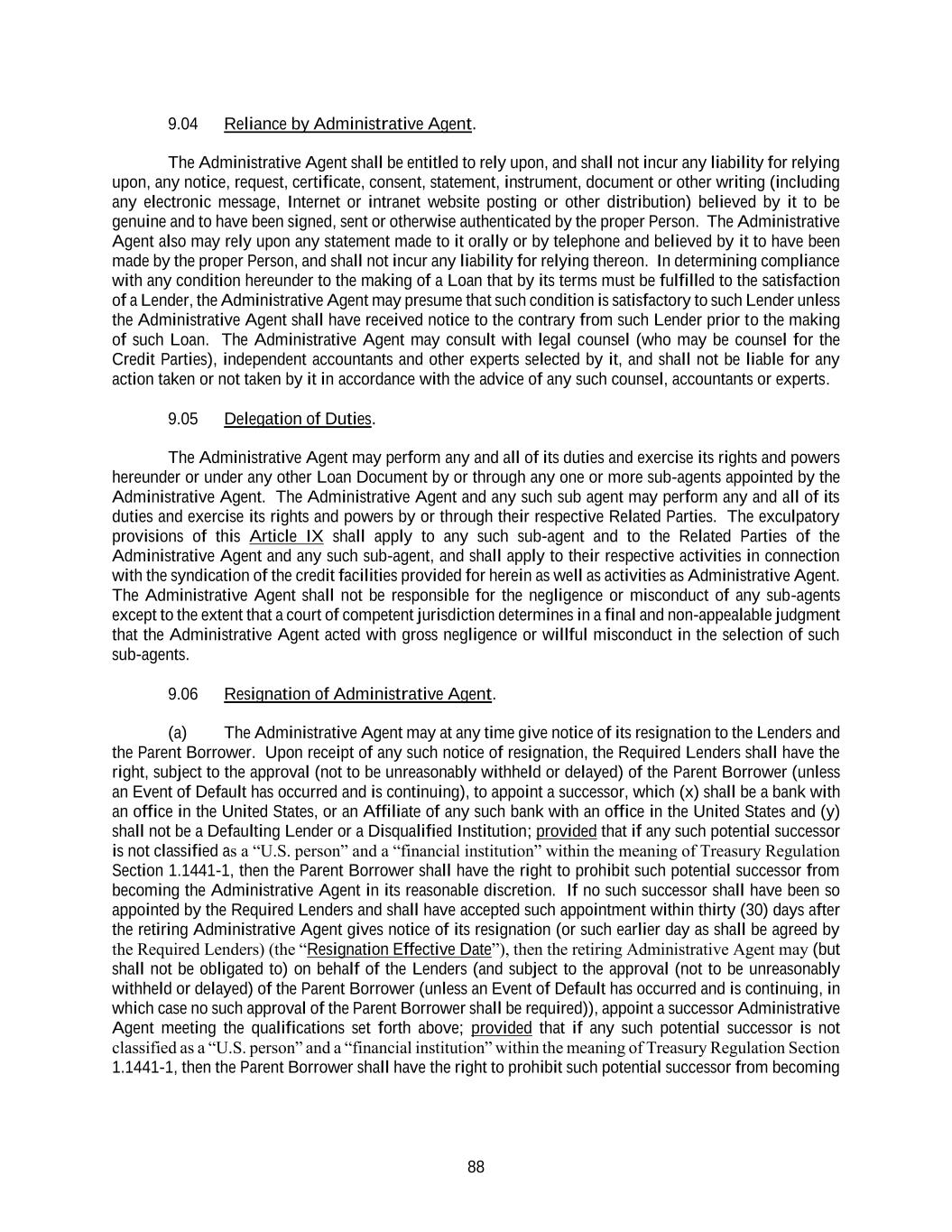 88 9.04 Reliance by Administrative Agent. The Administrative Agent shall be entitled to rely upon, and shall not incur any liability for relying upon, any notice, request, certificate, consent, statement, instrument, document or other writing (including any electronic message, Internet or intranet website posting or other distribution) believed by it to be genuine and to have been signed, sent or otherwise authenticated by the proper Person. The Administrative Agent also may rely upon any statement made to it orally or by telephone and believed by it to have been made by the proper Person, and shall not incur any liability for relying thereon. In determining compliance with any condition hereunder to the making of a Loan that by its terms must be fulfilled to the satisfaction of a Lender, the Administrative Agent may presume that such condition is satisfactory to such Lender unless the Administrative Agent shall have received notice to the contrary from such Lender prior to the making of such Loan. The Administrative Agent may consult with legal counsel (who may be counsel for the Credit Parties), independent accountants and other experts selected by it, and shall not be liable for any action taken or not taken by it in accordance with the advice of any such counsel, accountants or experts. 9.05 Delegation of Duties. The Administrative Agent may perform any and all of its duties and exercise its rights and powers hereunder or under any other Loan Document by or through any one or more sub-agents appointed by the Administrative Agent. The Administrative Agent and any such sub agent may perform any and all of its duties and exercise its rights and powers by or through their respective Related Parties. The exculpatory provisions of this Article IX shall apply to any such sub-agent and to the Related Parties of the Administrative Agent and any such sub-agent, and shall apply to their respective activities in connection with the syndication of the credit facilities provided for herein as well as activities as Administrative Agent. The Administrative Agent shall not be responsible for the negligence or misconduct of any sub-agents except to the extent that a court of competent jurisdiction determines in a final and non-appealable judgment that the Administrative Agent acted with gross negligence or willful misconduct in the selection of such sub-agents. 9.06 Resignation of Administrative Agent. (a) The Administrative Agent may at any time give notice of its resignation to the Lenders and the Parent Borrower. Upon receipt of any such notice of resignation, the Required Lenders shall have the right, subject to the approval (not to be unreasonably withheld or delayed) of the Parent Borrower (unless an Event of Default has occurred and is continuing), to appoint a successor, which (x) shall be a bank with an office in the United States, or an Affiliate of any such bank with an office in the United States and (y) shall not be a Defaulting Lender or a Disqualified Institution; provided that if any such potential successor is not classified as a “U.S. person” and a “financial institution” within the meaning of Treasury Regulation Section 1.1441-1, then the Parent Borrower shall have the right to prohibit such potential successor from becoming the Administrative Agent in its reasonable discretion. If no such successor shall have been so appointed by the Required Lenders and shall have accepted such appointment within thirty (30) days after the retiring Administrative Agent gives notice of its resignation (or such earlier day as shall be agreed by the Required Lenders) (the “Resignation Effective Date”), then the retiring Administrative Agent may (but shall not be obligated to) on behalf of the Lenders (and subject to the approval (not to be unreasonably withheld or delayed) of the Parent Borrower (unless an Event of Default has occurred and is continuing, in which case no such approval of the Parent Borrower shall be required)), appoint a successor Administrative Agent meeting the qualifications set forth above; provided that if any such potential successor is not classified as a “U.S. person” and a “financial institution” within the meaning of Treasury Regulation Section 1.1441-1, then the Parent Borrower shall have the right to prohibit such potential successor from becoming