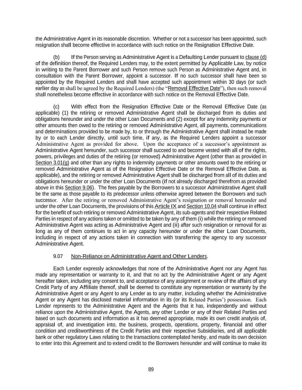 89 the Administrative Agent in its reasonable discretion. Whether or not a successor has been appointed, such resignation shall become effective in accordance with such notice on the Resignation Effective Date. (b) If the Person serving as Administrative Agent is a Defaulting Lender pursuant to clause (d) of the definition thereof, the Required Lenders may, to the extent permitted by Applicable Law, by notice in writing to the Parent Borrower and such Person remove such Person as Administrative Agent and, in consultation with the Parent Borrower, appoint a successor. If no such successor shall have been so appointed by the Required Lenders and shall have accepted such appointment within 30 days (or such earlier day as shall be agreed by the Required Lenders) (the “Removal Effective Date”), then such removal shall nonetheless become effective in accordance with such notice on the Removal Effective Date. (c) With effect from the Resignation Effective Date or the Removal Effective Date (as applicable) (1) the retiring or removed Administrative Agent shall be discharged from its duties and obligations hereunder and under the other Loan Documents and (2) except for any indemnity payments or other amounts then owed to the retiring or removed Administrative Agent, all payments, communications and determinations provided to be made by, to or through the Administrative Agent shall instead be made by or to each Lender directly, until such time, if any, as the Required Lenders appoint a successor Administrative Agent as provided for above. Upon the acceptance of a successor’s appointment as Administrative Agent hereunder, such successor shall succeed to and become vested with all of the rights, powers, privileges and duties of the retiring (or removed) Administrative Agent (other than as provided in Section 3.01(g) and other than any rights to indemnity payments or other amounts owed to the retiring or removed Administrative Agent as of the Resignation Effective Date or the Removal Effective Date, as applicable), and the retiring or removed Administrative Agent shall be discharged from all of its duties and obligations hereunder or under the other Loan Documents (if not already discharged therefrom as provided above in this Section 9.06). The fees payable by the Borrowers to a successor Administrative Agent shall be the same as those payable to its predecessor unless otherwise agreed between the Borrowers and such successor. After the retiring or removed Administrative Agent’s resignation or removal hereunder and under the other Loan Documents, the provisions of this Article IX and Section 10.04 shall continue in effect for the benefit of such retiring or removed Administrative Agent, its sub-agents and their respective Related Parties in respect of any actions taken or omitted to be taken by any of them (i) while the retiring or removed Administrative Agent was acting as Administrative Agent and (ii) after such resignation or removal for as long as any of them continues to act in any capacity hereunder or under the other Loan Documents, including in respect of any actions taken in connection with transferring the agency to any successor Administrative Agent. 9.07 Non-Reliance on Administrative Agent and Other Lenders. Each Lender expressly acknowledges that none of the Administrative Agent nor any Agent has made any representation or warranty to it, and that no act by the Administrative Agent or any Agent hereafter taken, including any consent to, and acceptance of any assignment or review of the affairs of any Credit Party of any Affiliate thereof, shall be deemed to constitute any representation or warranty by the Administrative Agent or any Agent to any Lender as to any matter, including whether the Administrative Agent or any Agent has disclosed material information in its (or its Related Parties’) possession. Each Lender represents to the Administrative Agent and the Agents that it has, independently and without reliance upon the Administrative Agent, the Agents, any other Lender or any of their Related Parties and based on such documents and information as it has deemed appropriate, made its own credit analysis of, appraisal of, and investigation into, the business, prospects, operations, property, financial and other condition and creditworthiness of the Credit Parties and their respective Subsidiaries, and all applicable bank or other regulatory Laws relating to the transactions contemplated hereby, and made its own decision to enter into this Agreement and to extend credit to the Borrowers hereunder and will continue to make its