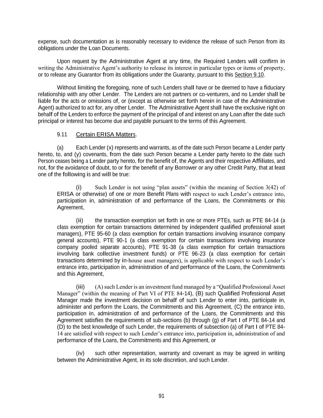 91 expense, such documentation as is reasonably necessary to evidence the release of such Person from its obligations under the Loan Documents. Upon request by the Administrative Agent at any time, the Required Lenders will confirm in writing the Administrative Agent’s authority to release its interest in particular types or items of property, or to release any Guarantor from its obligations under the Guaranty, pursuant to this Section 9.10. Without limiting the foregoing, none of such Lenders shall have or be deemed to have a fiduciary relationship with any other Lender. The Lenders are not partners or co-venturers, and no Lender shall be liable for the acts or omissions of, or (except as otherwise set forth herein in case of the Administrative Agent) authorized to act for, any other Lender. The Administrative Agent shall have the exclusive right on behalf of the Lenders to enforce the payment of the principal of and interest on any Loan after the date such principal or interest has become due and payable pursuant to the terms of this Agreement. 9.11 Certain ERISA Matters. (a) Each Lender (x) represents and warrants, as of the date such Person became a Lender party hereto, to, and (y) covenants, from the date such Person became a Lender party hereto to the date such Person ceases being a Lender party hereto, for the benefit of, the Agents and their respective Affiliates, and not, for the avoidance of doubt, to or for the benefit of any Borrower or any other Credit Party, that at least one of the following is and will be true: (i) Such Lender is not using “plan assets” (within the meaning of Section 3(42) of ERISA or otherwise) of one or more Benefit Plans with respect to such Lender’s entrance into, participation in, administration of and performance of the Loans, the Commitments or this Agreement, (ii) the transaction exemption set forth in one or more PTEs, such as PTE 84-14 (a class exemption for certain transactions determined by independent qualified professional asset managers), PTE 95-60 (a class exemption for certain transactions involving insurance company general accounts), PTE 90-1 (a class exemption for certain transactions involving insurance company pooled separate accounts), PTE 91-38 (a class exemption for certain transactions involving bank collective investment funds) or PTE 96-23 (a class exemption for certain transactions determined by in-house asset managers), is applicable with respect to such Lender’s entrance into, participation in, administration of and performance of the Loans, the Commitments and this Agreement, (iii) (A) such Lender is an investment fund managed by a “Qualified Professional Asset Manager” (within the meaning of Part VI of PTE 84-14), (B) such Qualified Professional Asset Manager made the investment decision on behalf of such Lender to enter into, participate in, administer and perform the Loans, the Commitments and this Agreement, (C) the entrance into, participation in, administration of and performance of the Loans, the Commitments and this Agreement satisfies the requirements of sub-sections (b) through (g) of Part I of PTE 84-14 and (D) to the best knowledge of such Lender, the requirements of subsection (a) of Part I of PTE 84- 14 are satisfied with respect to such Lender’s entrance into, participation in, administration of and performance of the Loans, the Commitments and this Agreement, or (iv) such other representation, warranty and covenant as may be agreed in writing between the Administrative Agent, in its sole discretion, and such Lender.