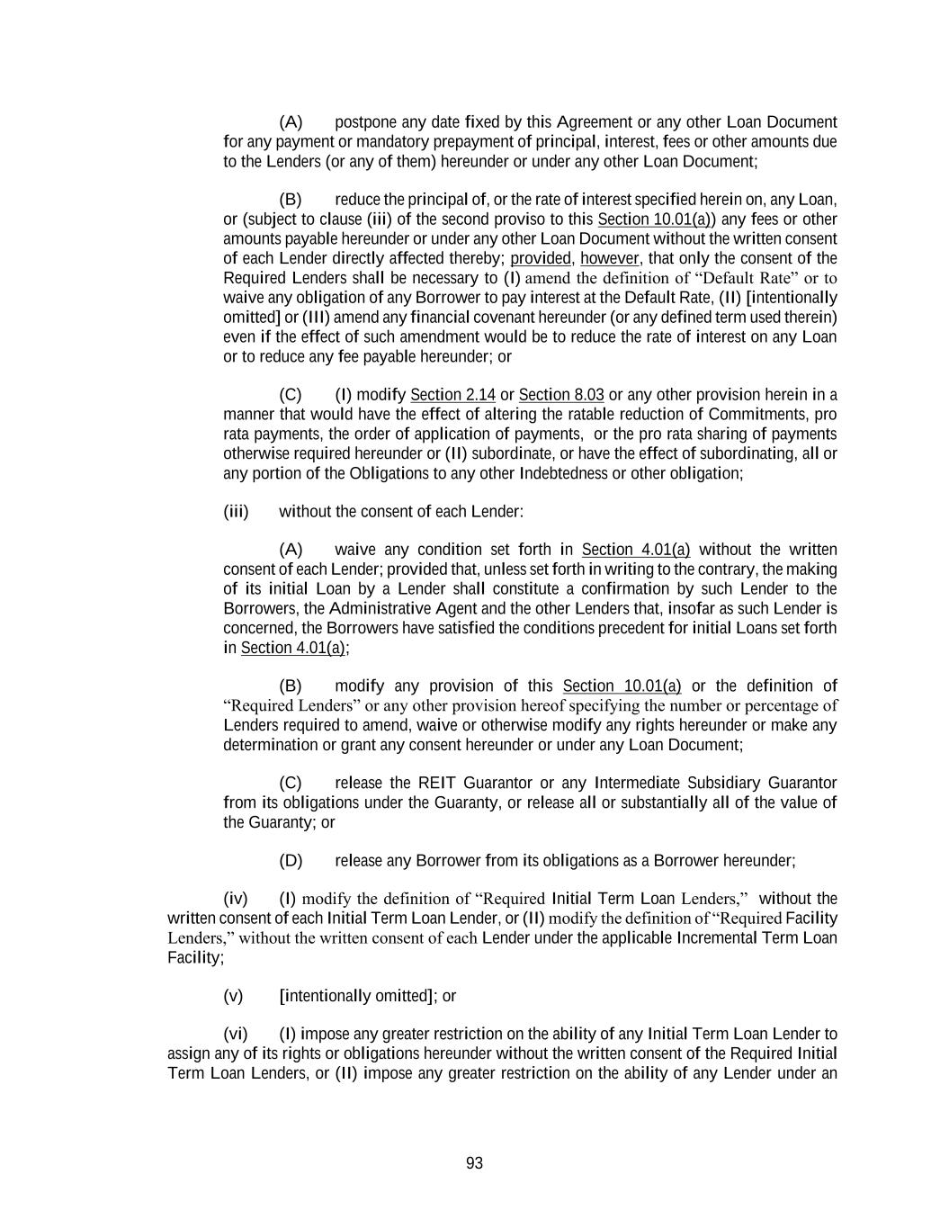 93 (A) postpone any date fixed by this Agreement or any other Loan Document for any payment or mandatory prepayment of principal, interest, fees or other amounts due to the Lenders (or any of them) hereunder or under any other Loan Document; (B) reduce the principal of, or the rate of interest specified herein on, any Loan, or (subject to clause (iii) of the second proviso to this Section 10.01(a)) any fees or other amounts payable hereunder or under any other Loan Document without the written consent of each Lender directly affected thereby; provided, however, that only the consent of the Required Lenders shall be necessary to (I) amend the definition of “Default Rate” or to waive any obligation of any Borrower to pay interest at the Default Rate, (II) [intentionally omitted] or (III) amend any financial covenant hereunder (or any defined term used therein) even if the effect of such amendment would be to reduce the rate of interest on any Loan or to reduce any fee payable hereunder; or (C) (I) modify Section 2.14 or Section 8.03 or any other provision herein in a manner that would have the effect of altering the ratable reduction of Commitments, pro rata payments, the order of application of payments, or the pro rata sharing of payments otherwise required hereunder or (II) subordinate, or have the effect of subordinating, all or any portion of the Obligations to any other Indebtedness or other obligation; (iii) without the consent of each Lender: (A) waive any condition set forth in Section 4.01(a) without the written consent of each Lender; provided that, unless set forth in writing to the contrary, the making of its initial Loan by a Lender shall constitute a confirmation by such Lender to the Borrowers, the Administrative Agent and the other Lenders that, insofar as such Lender is concerned, the Borrowers have satisfied the conditions precedent for initial Loans set forth in Section 4.01(a); (B) modify any provision of this Section 10.01(a) or the definition of “Required Lenders” or any other provision hereof specifying the number or percentage of Lenders required to amend, waive or otherwise modify any rights hereunder or make any determination or grant any consent hereunder or under any Loan Document; (C) release the REIT Guarantor or any Intermediate Subsidiary Guarantor from its obligations under the Guaranty, or release all or substantially all of the value of the Guaranty; or (D) release any Borrower from its obligations as a Borrower hereunder; (iv) (I) modify the definition of “Required Initial Term Loan Lenders,” without the written consent of each Initial Term Loan Lender, or (II) modify the definition of “Required Facility Lenders,” without the written consent of each Lender under the applicable Incremental Term Loan Facility; (v) [intentionally omitted]; or (vi) (I) impose any greater restriction on the ability of any Initial Term Loan Lender to assign any of its rights or obligations hereunder without the written consent of the Required Initial Term Loan Lenders, or (II) impose any greater restriction on the ability of any Lender under an